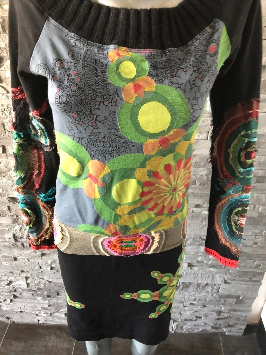 Krasne desigual saty, dlhy rukav, V vystrih, strih do A, okolo vystrihu kamienky. Su velmi pekne, na bezne aj prilezitostne nosenie. Boli dost nosene ale nemaju poskodenia, sem tam nejaky zmolok