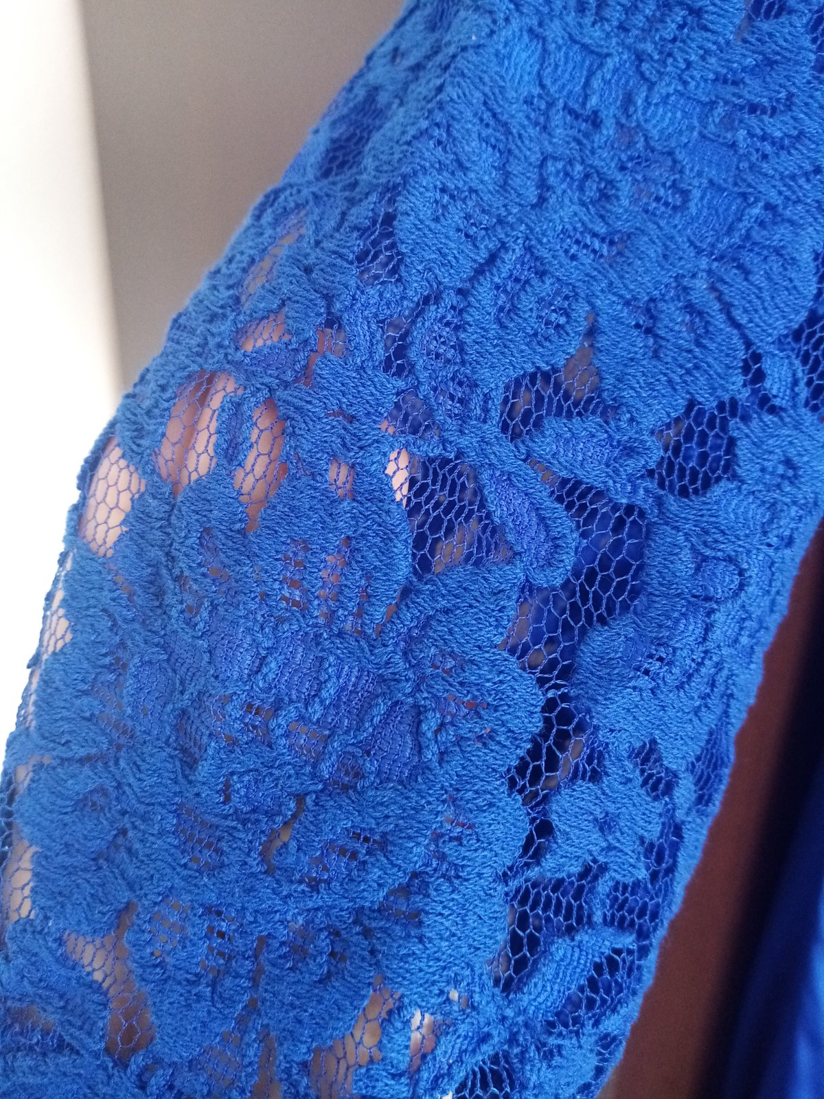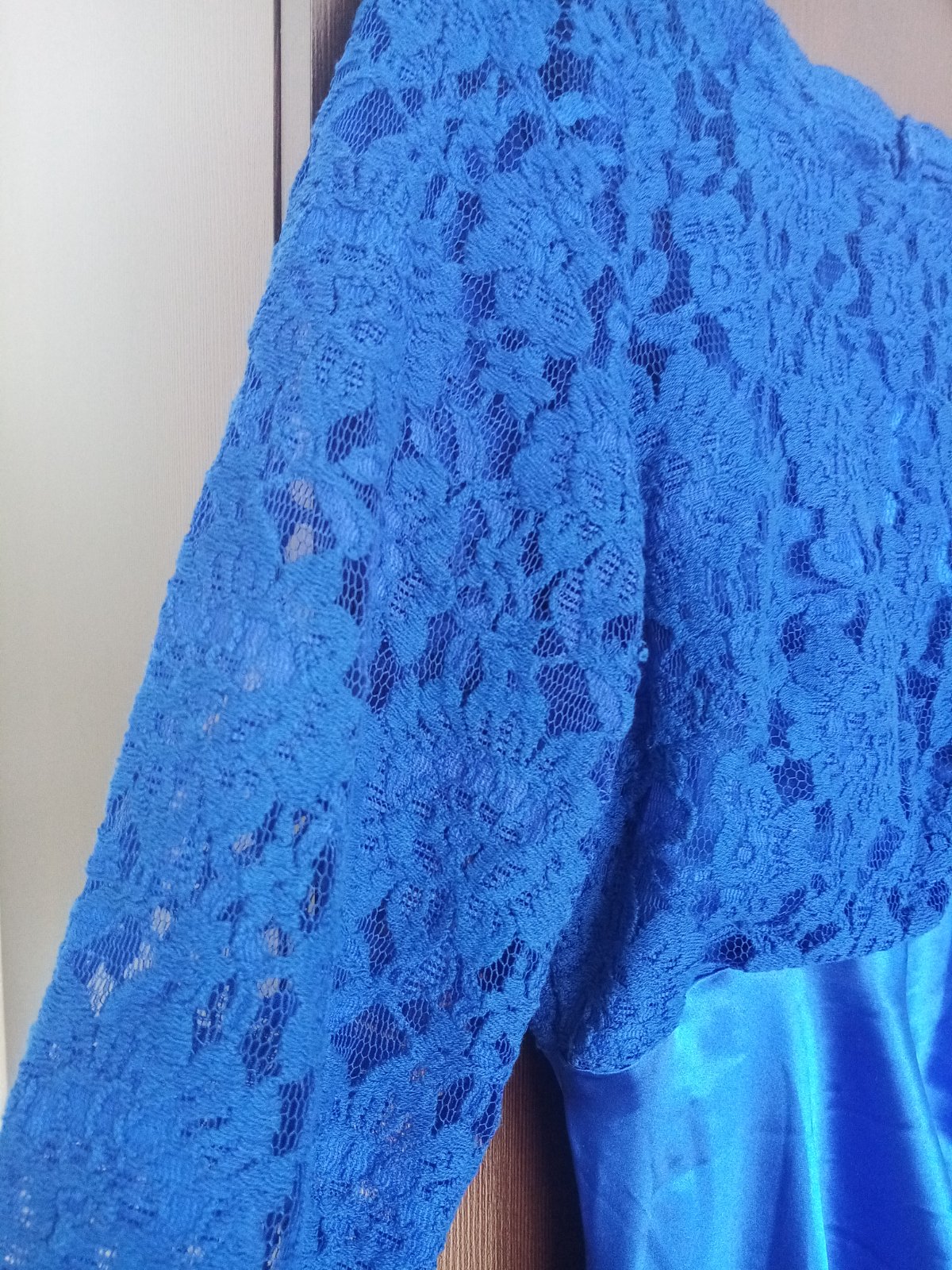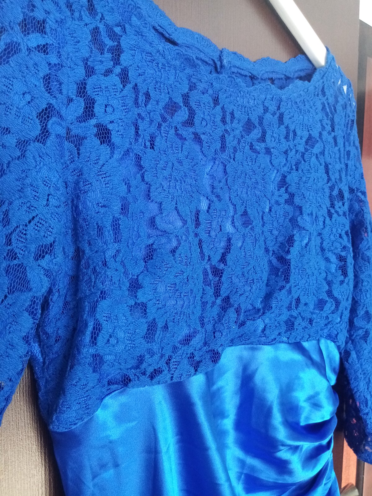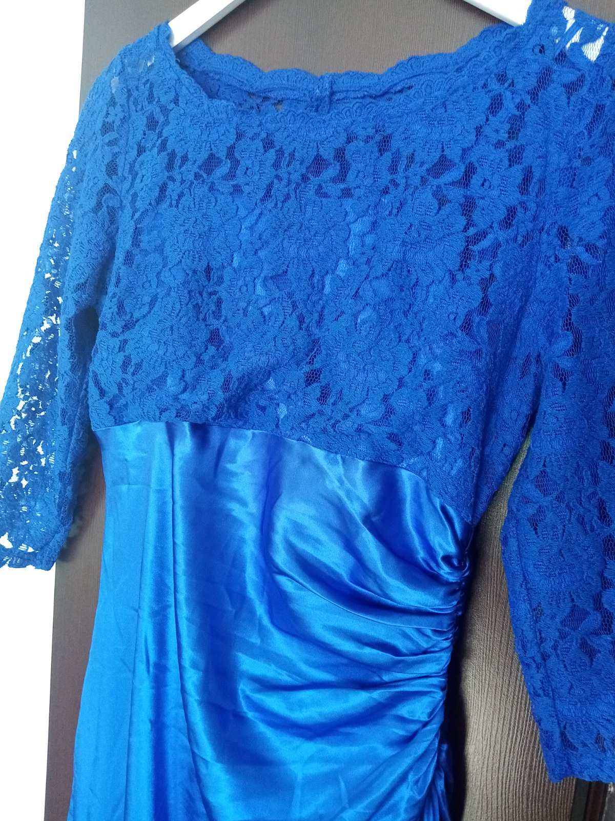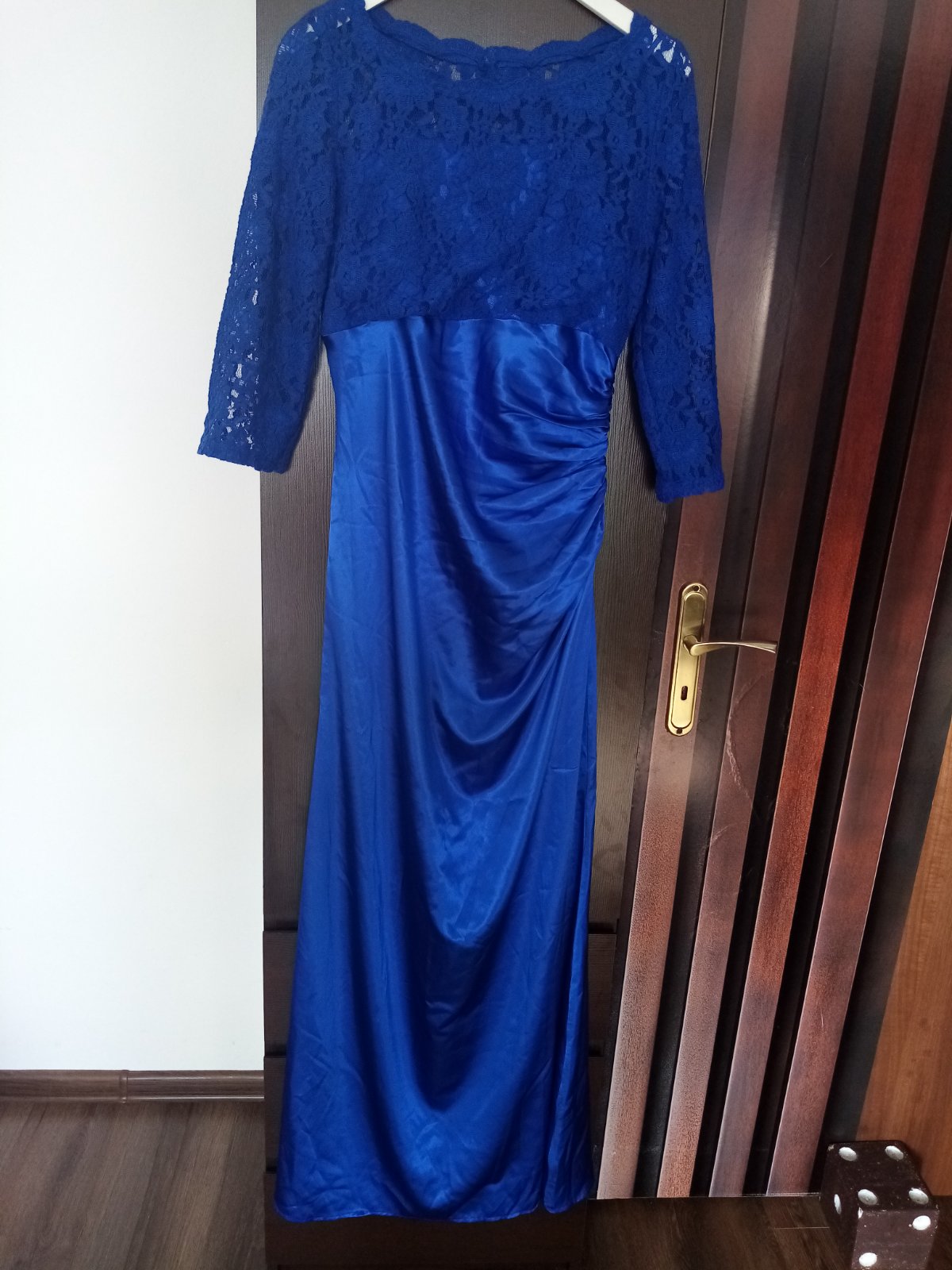 Večerné dlhé šaty s krásnou aplikáciou a mierne vystúžené na prsiach. Veľkostne sedia. Farba kráľovsky modrá.