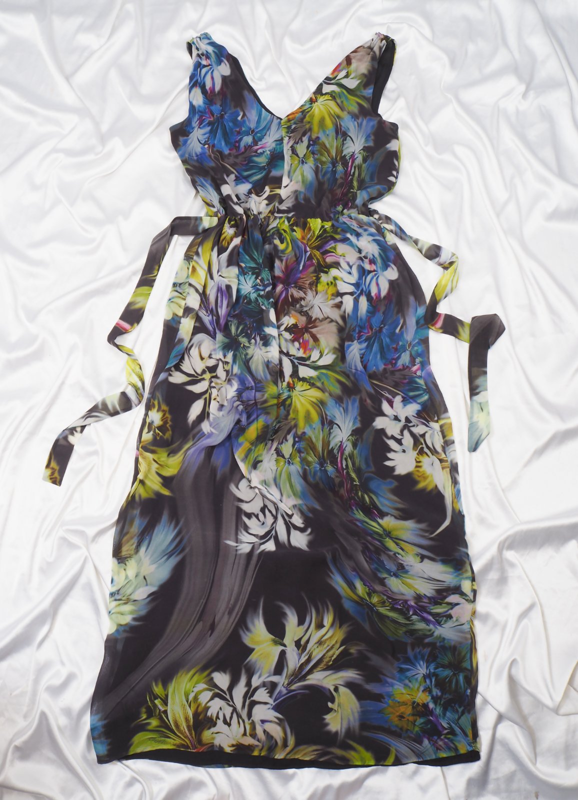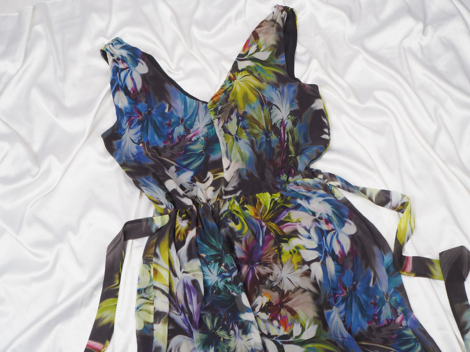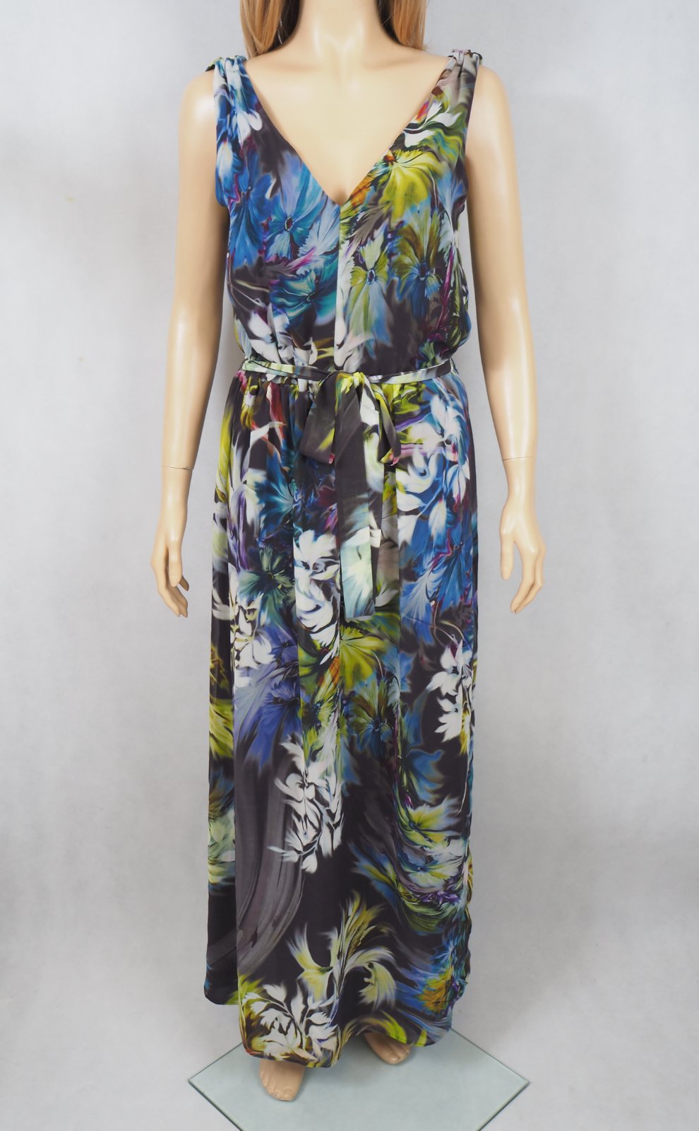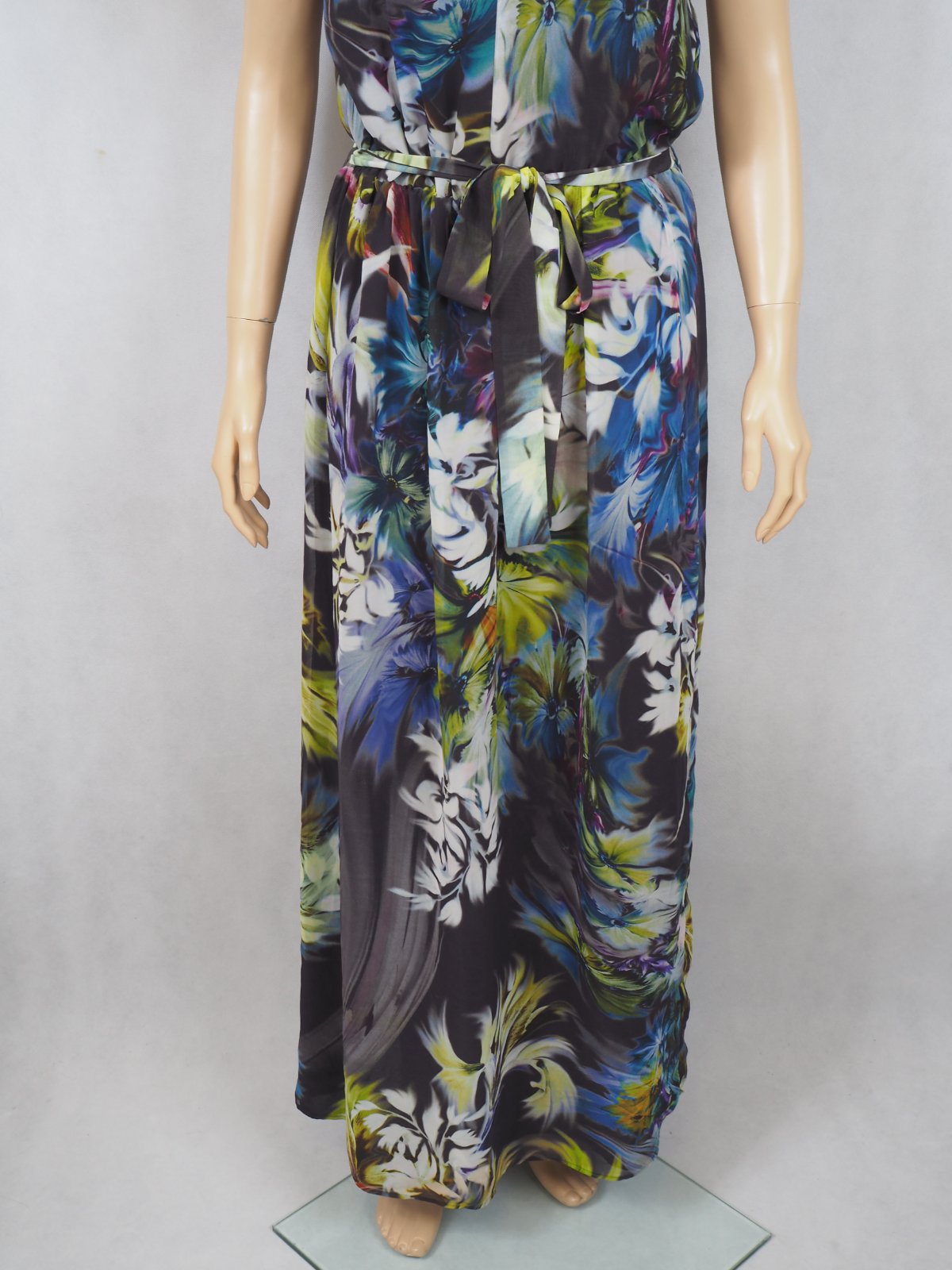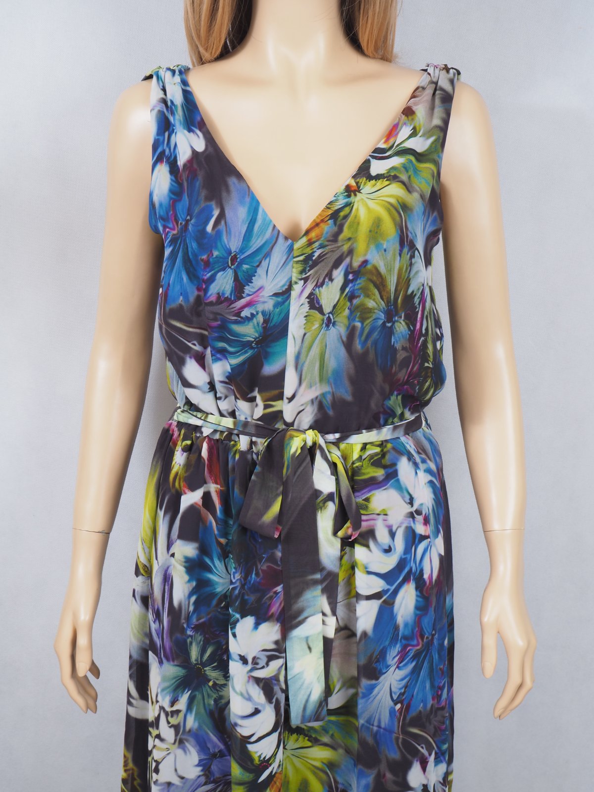 Kvalitné letné maxišaty s nádherným kvetinkovým vzorom, v páse gumka a opasok, podšité, materiál 100% polyester, ako nové.