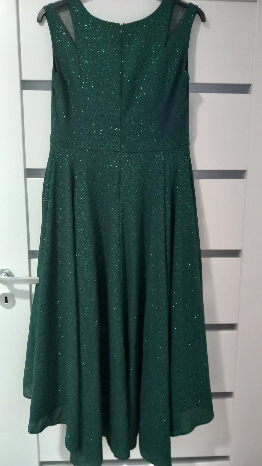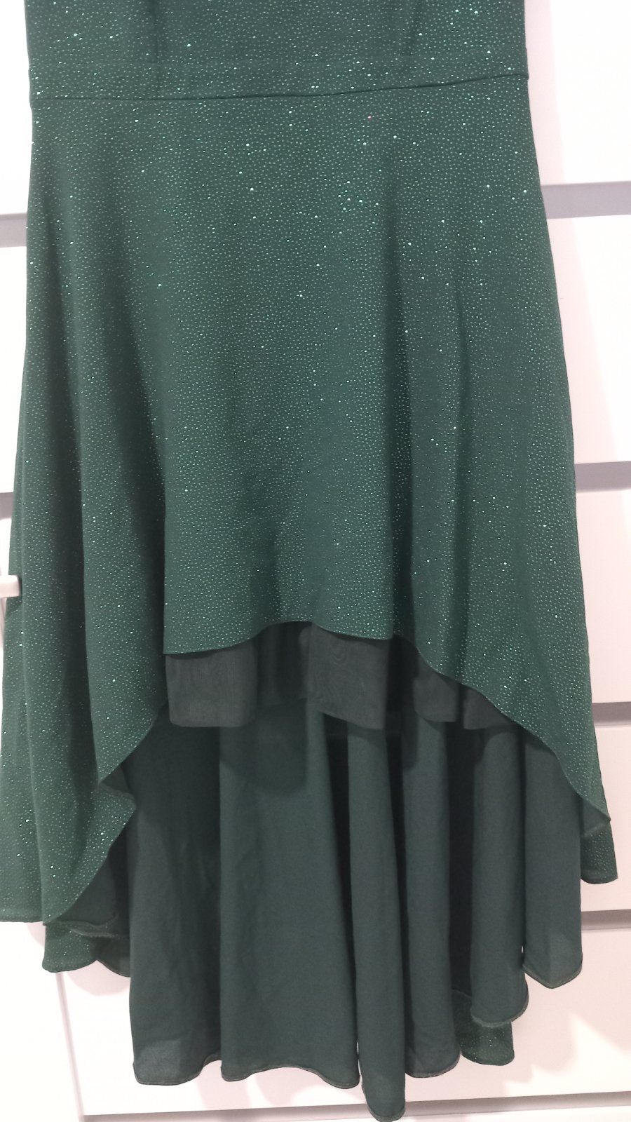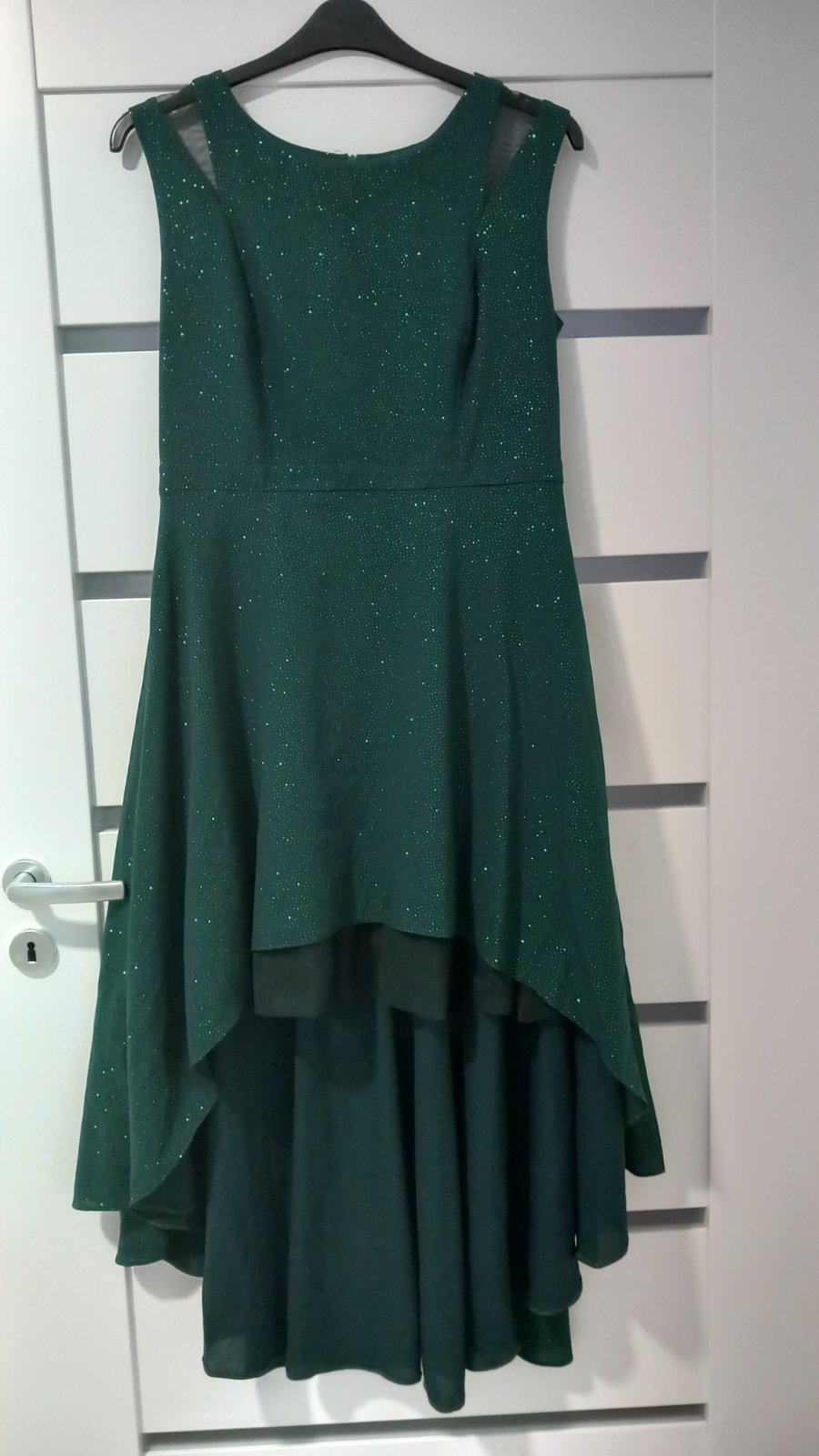 Predám krásne plesové šaty, vzadu predĺžené, vpredu kratšie cca po kolená, použité 1x. Miery: dĺžka od ramena až dolu 138 cm, dĺžka vpredu od ramena dolu 94 cm. Šírka cez prsia v kľude 47 cm, šírka pásu v kľude 42 cm.