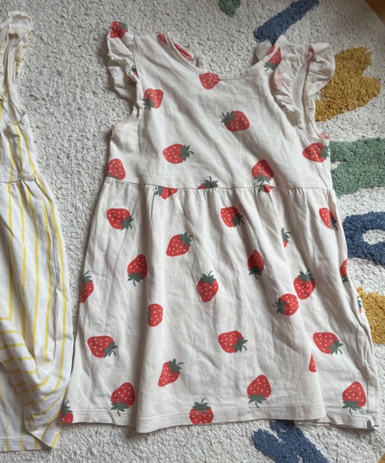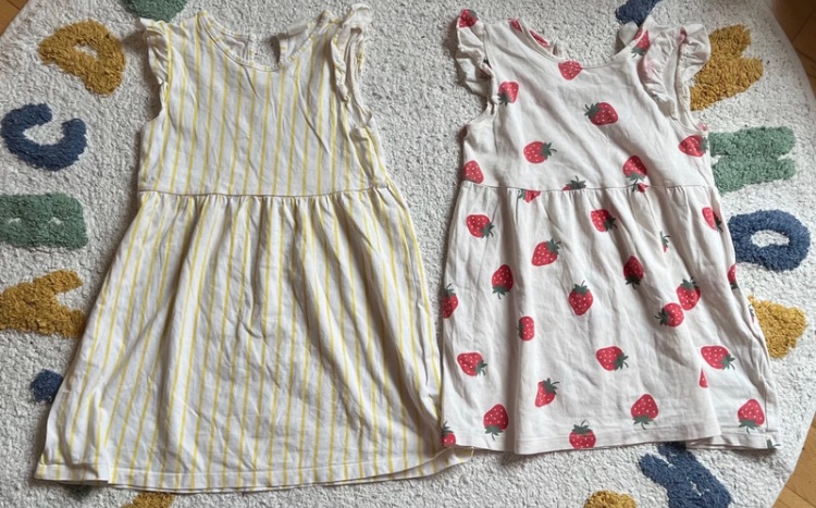 2 bavlnené pásikavé a jahodové šaty, H&M, 98