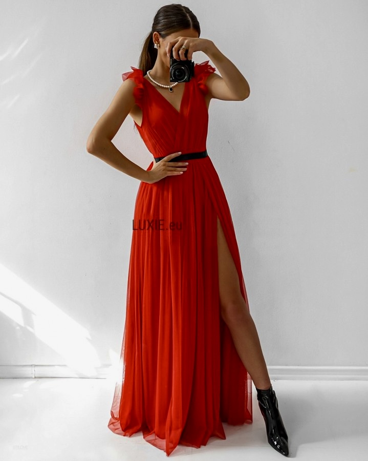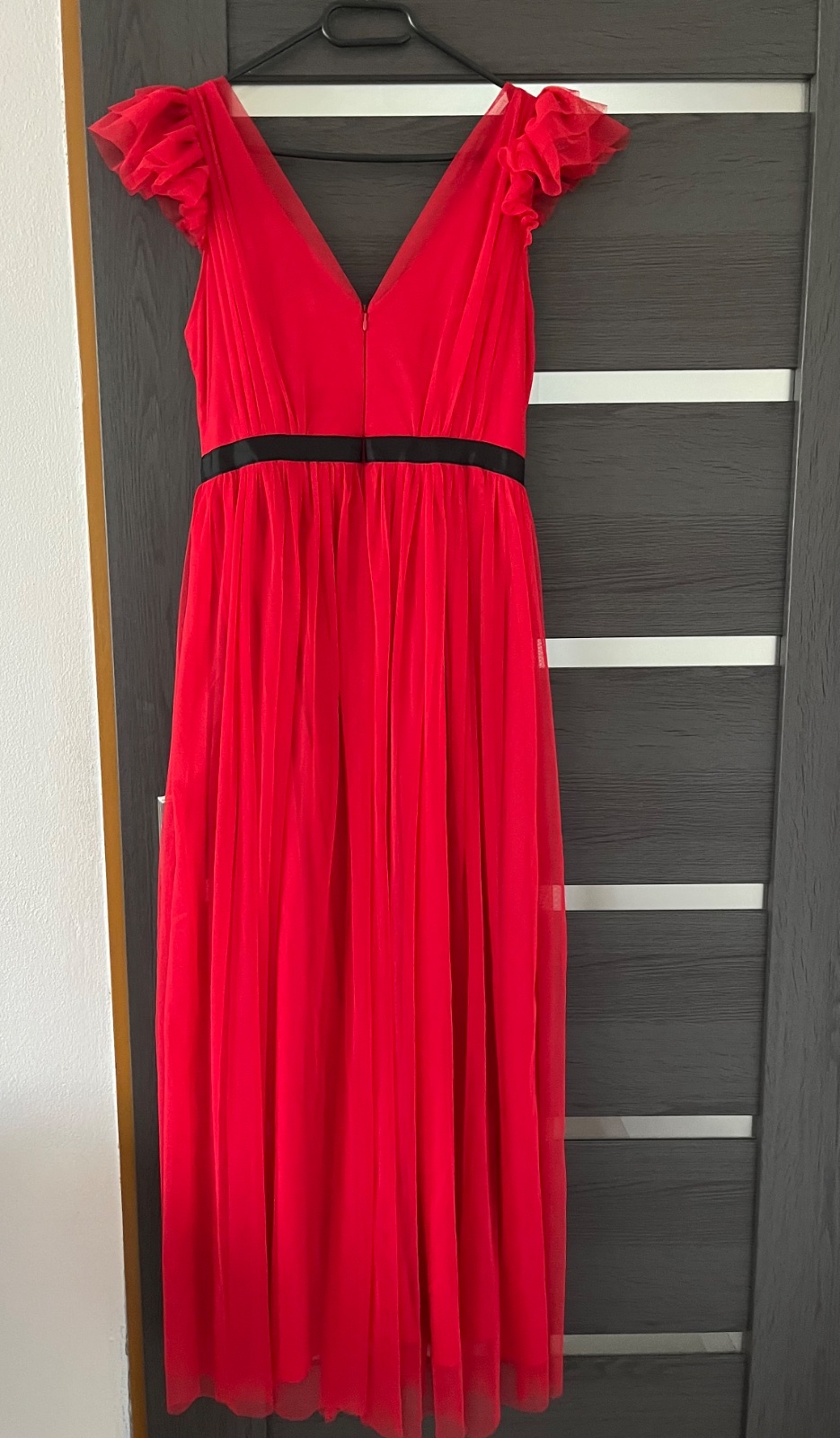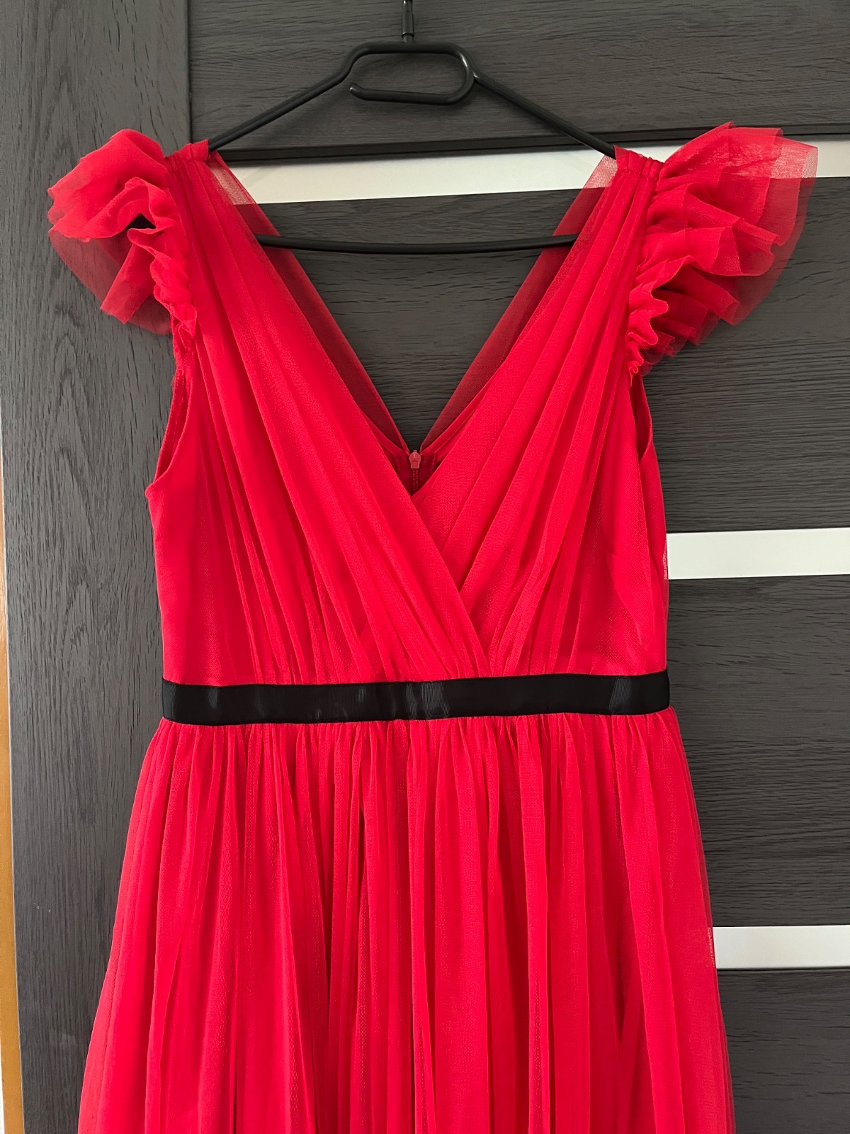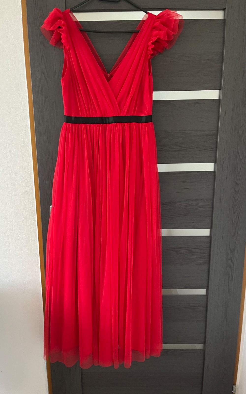 Luxusné šaty s padavou tylovou sukňou. Na prsiach sú nariasené a v páse prešité, čo prispieva k dokonalému formovaniu postavy. Čierna saténová stuha sa nachádza v oblasti pása. Vzadu sa zapínajú zipsom.
