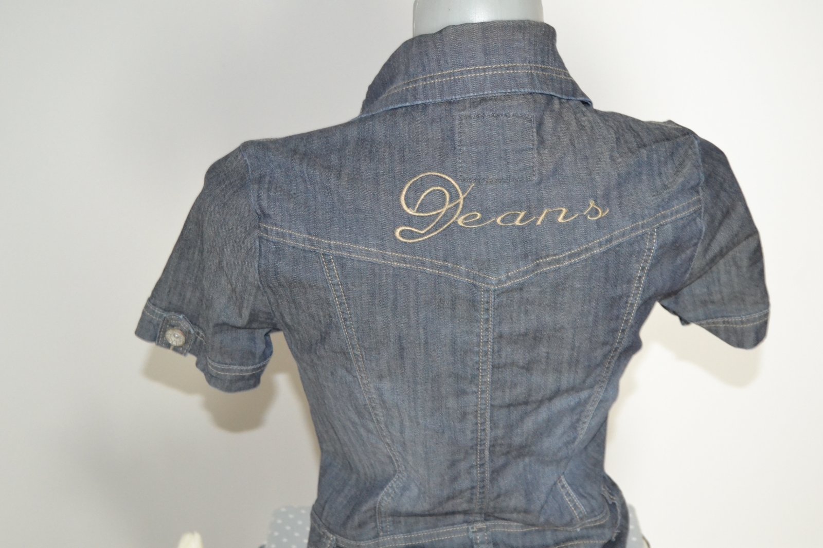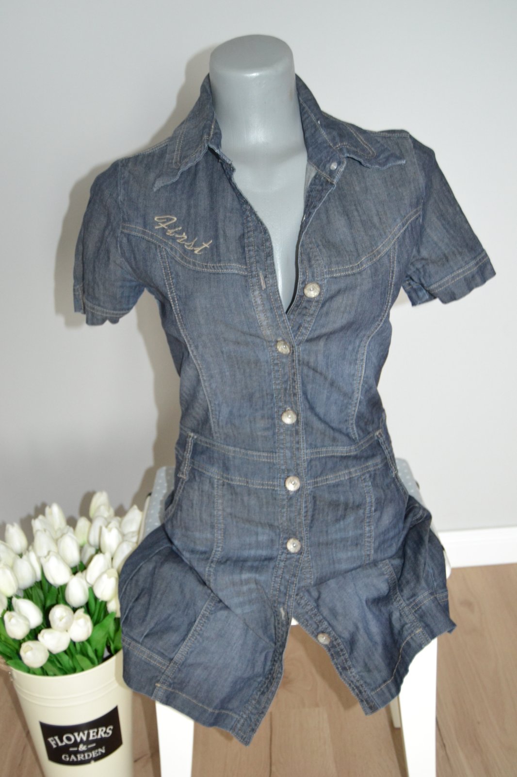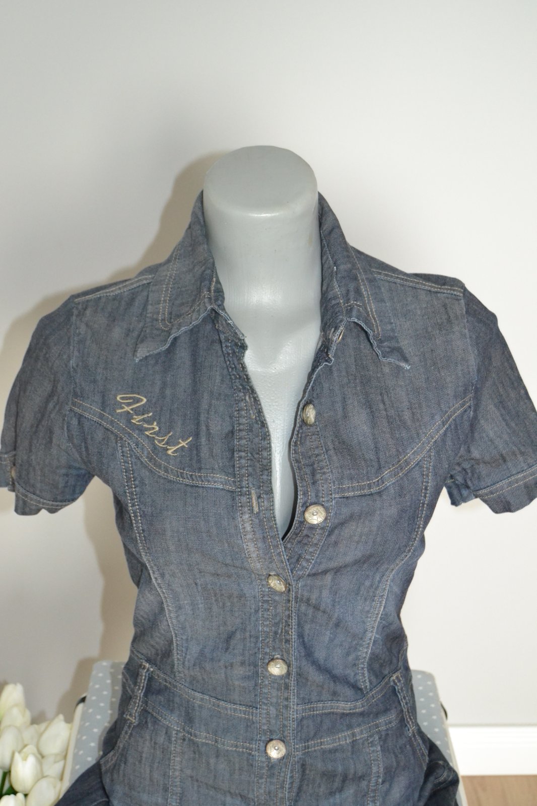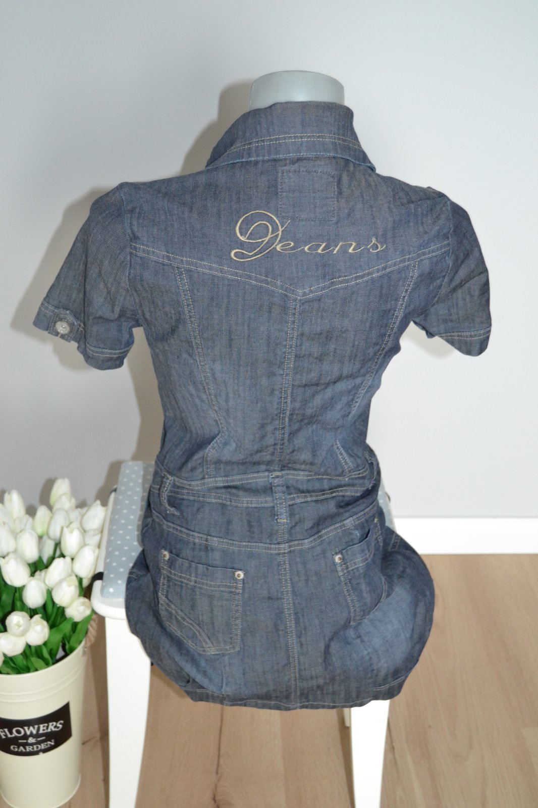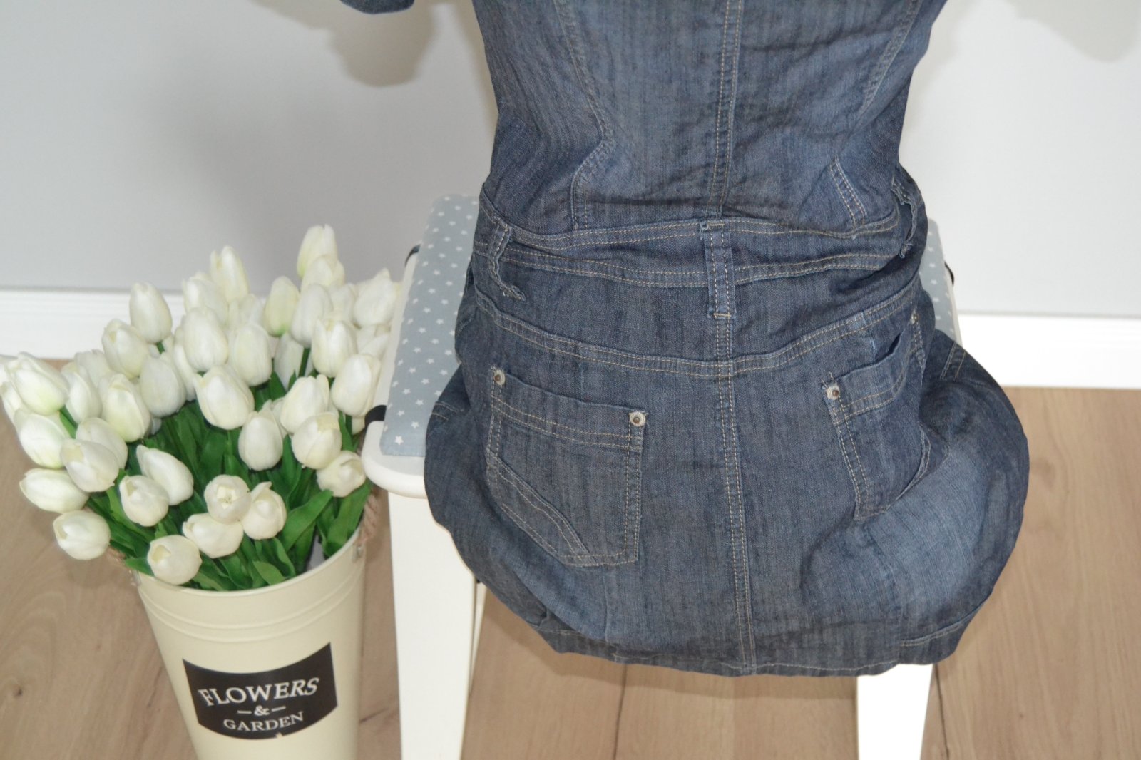 Rifľové mini šaty na gombíky, materiál elastická rifľovina, šaty majú vačky, veľkosť M, obvod cez prsia 80 cm, dĺžka 80 cm.