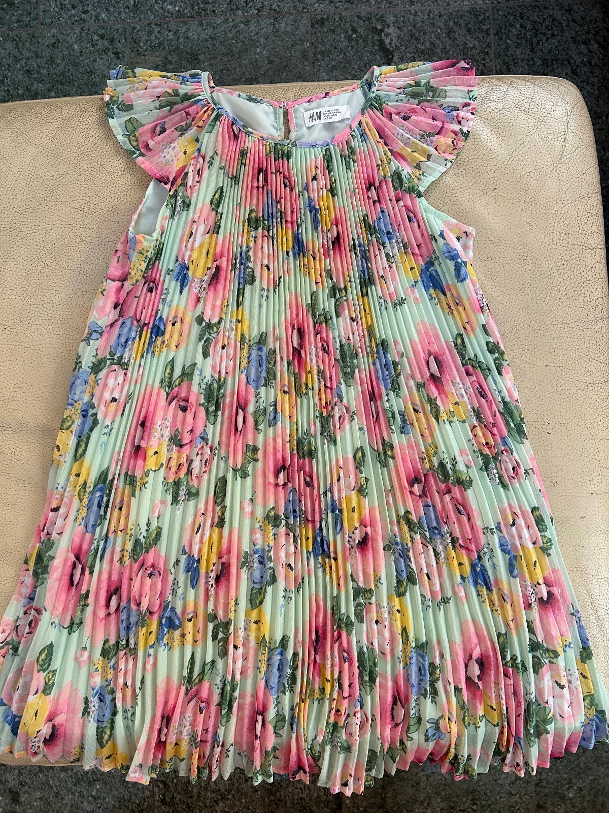 Predám nosené dievčenské skladané kvetinkové šaty s krátkym rukávom. Celé šaty sú podšité, okrem rukávov. Materiál 100% polyester. Veľkosť 140, 9-10 r. Dĺžka šiat je 73 cm, šírka cez prsia 39 cm. Šaty sú bez roztrhania a iného poškodenia, vyzerajú ako nové. V cene nie je zahrnuté poštovné.