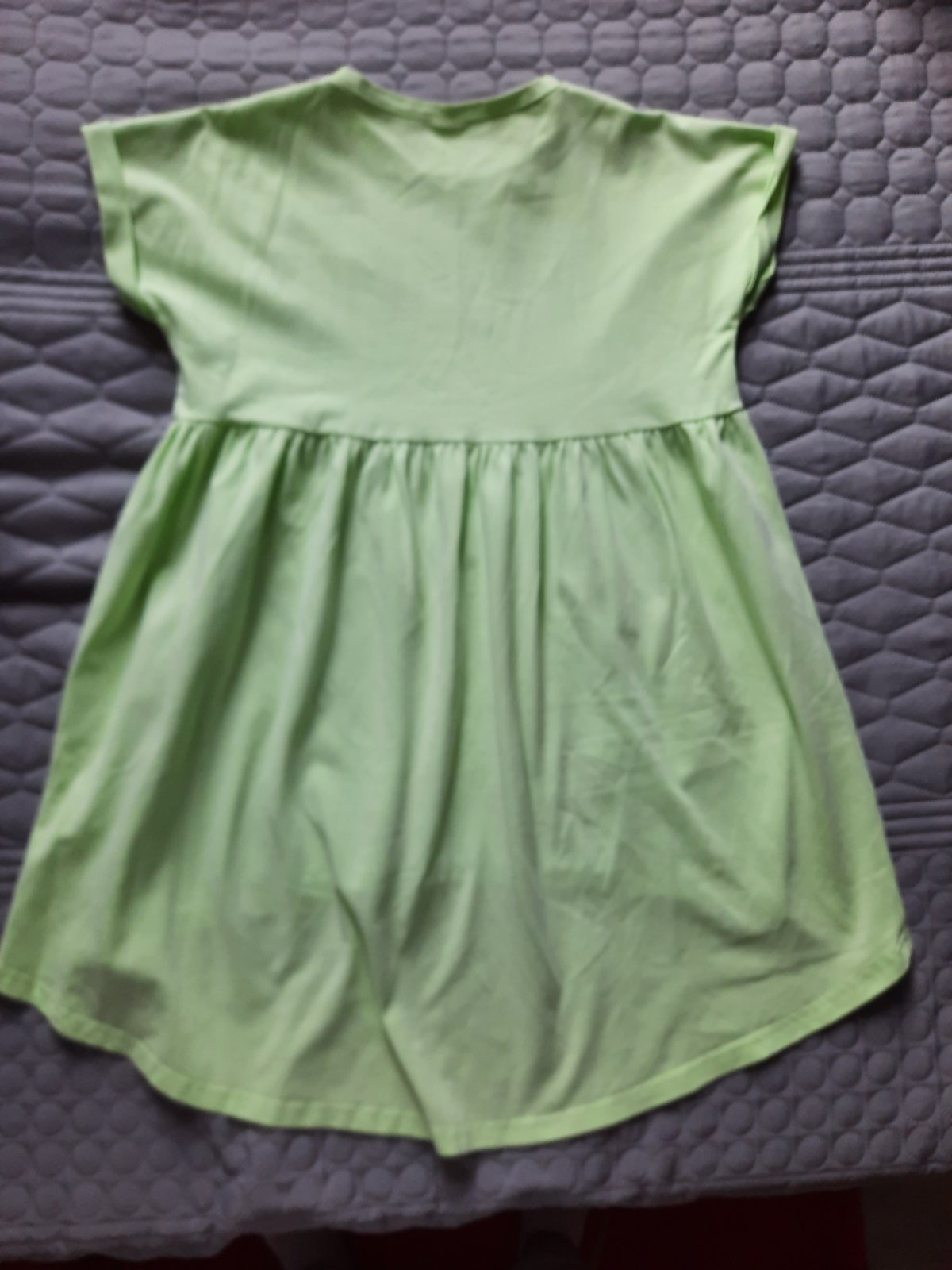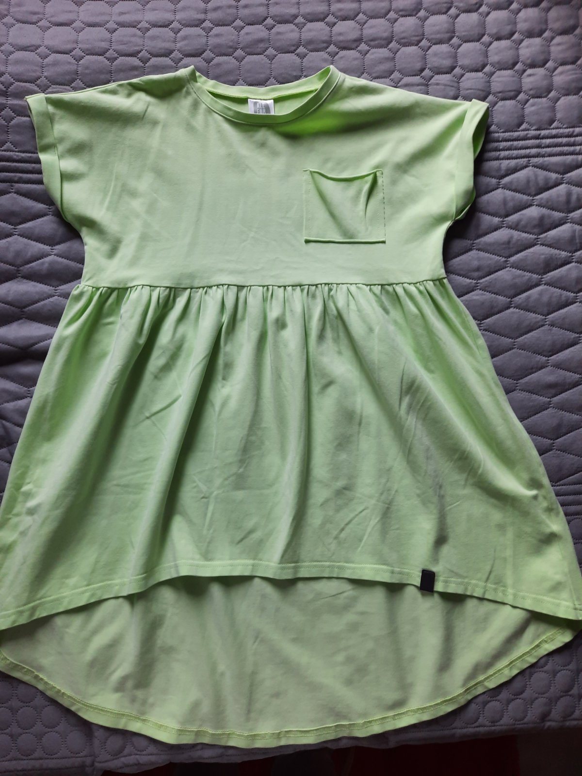 Predám nosené šaty- tuniku All for Kids 140- 146, šaty sú širokého strihu /oversize/nosili sme aj ako šaty na dovolenku aj do školy a pod to legíny, sú mätovej farby asi ako na fotke č.2, bez chýb, vpredu krátšie ako vzadu , prsia 43x2, dĺžka vpredu 60 cm, vzadu 80cm, cena 10 €