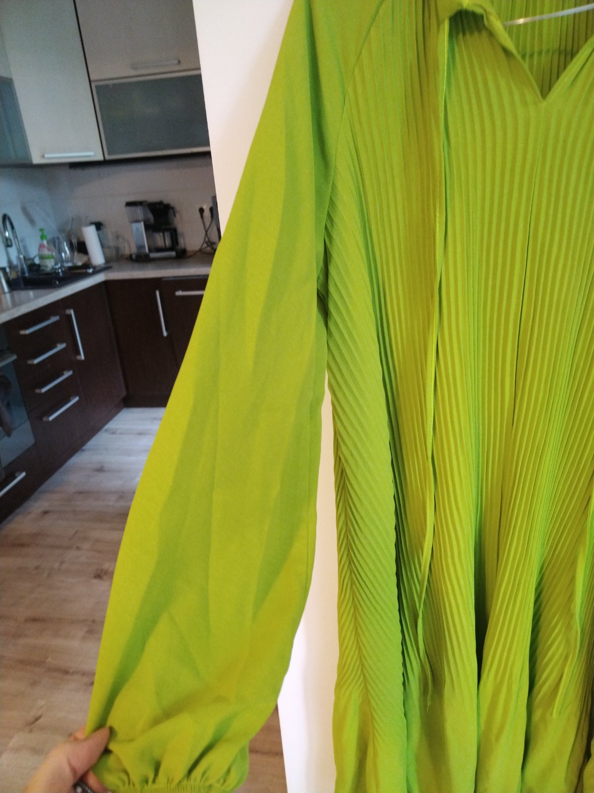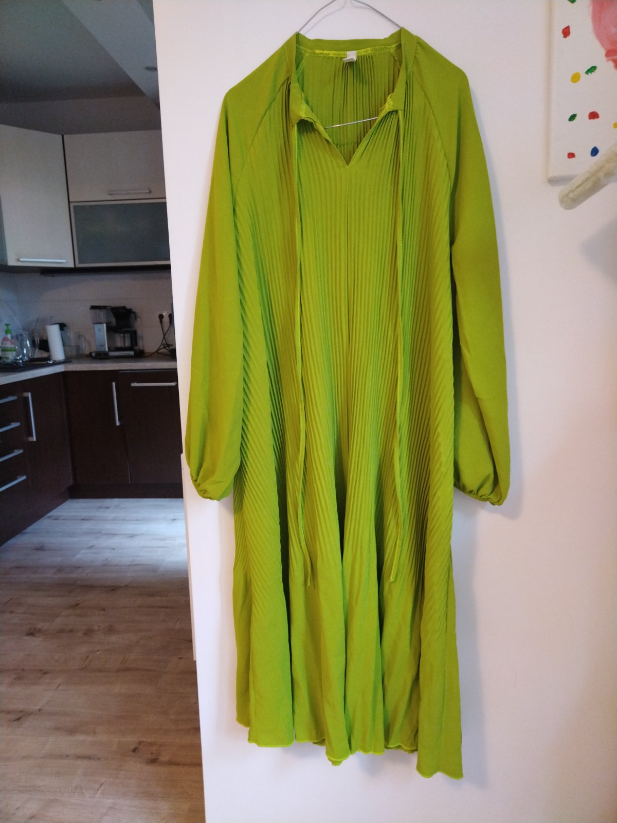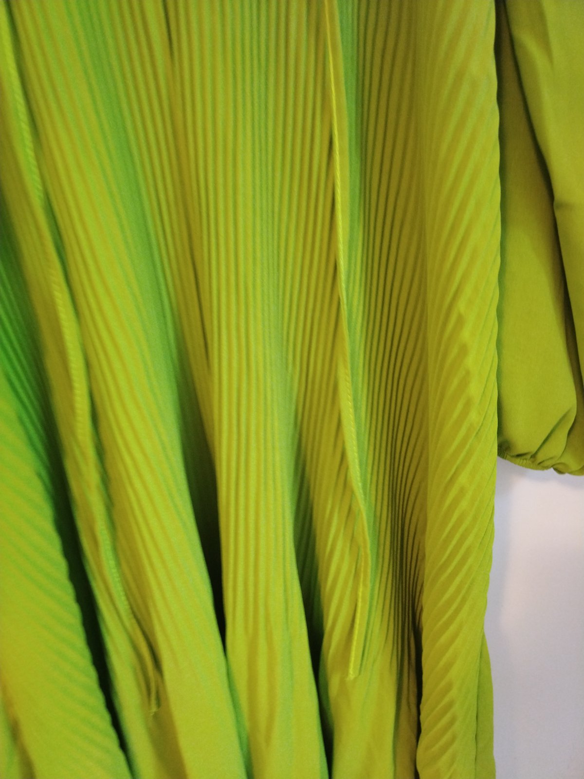 Predám krásne plisované šaty limetkovej farby, veľkosť je UNI, voľné sú. Sú len vyprane, nenosené.