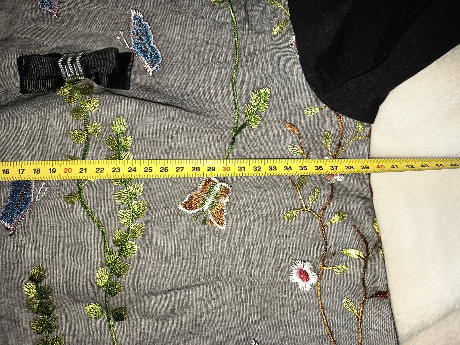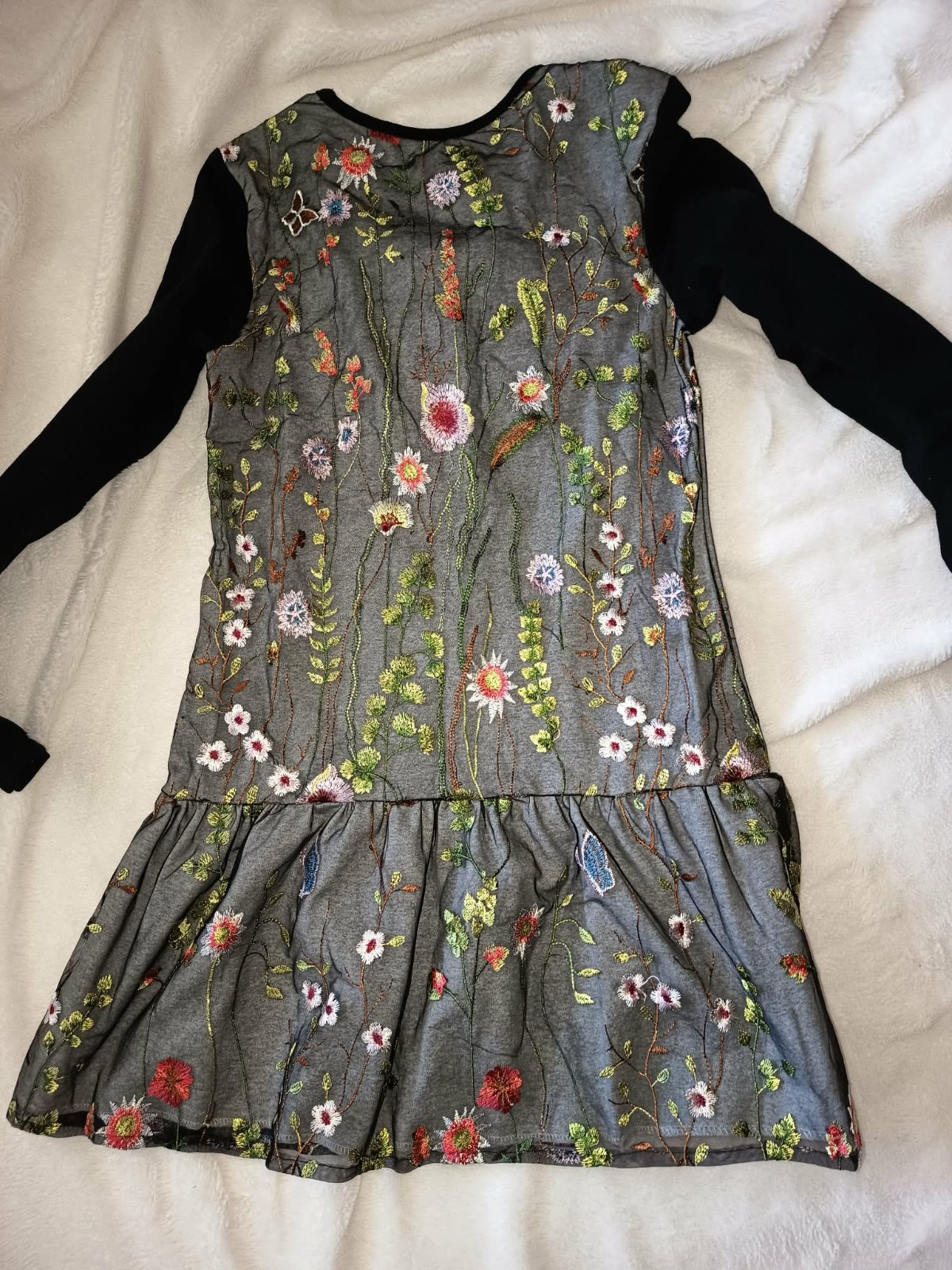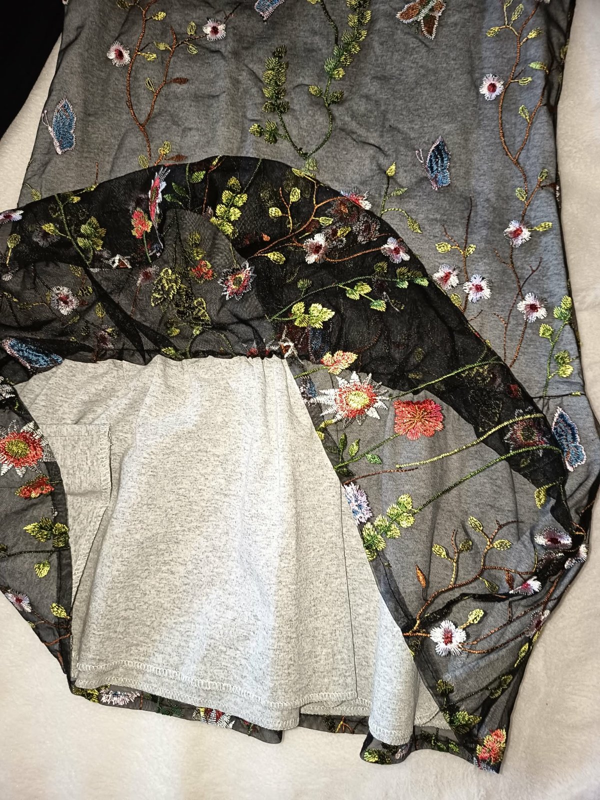 Zaujímavý kúsok, spodná časť je teplákoviná, vrchná časť je priehľadná s vyšitými kvetmi a motýľmi. Veľkosť je odhadom, ak chcete viac nafotených mier, napíšte mi.