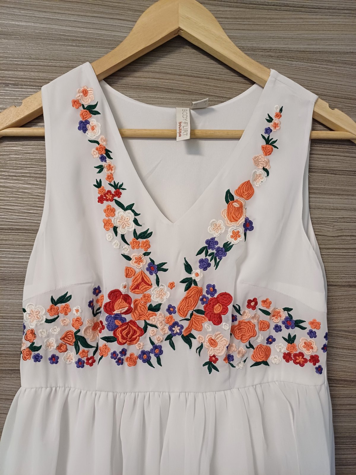zn. bodyflirt, vzadu dlhé, vpredu zaujímavo riasené, pri chôdzi veľmi pekne povievajú okolo nôh, dajú sa nosiť aj ako slávnostné, vzor je vyšitý, šaty ľahučké, éterické, pod pazuchami 2x 45 cm, nepovolia, lebo nie sú elastické, zboku je zips na lepšie obliekanie, šaty sú ako nové