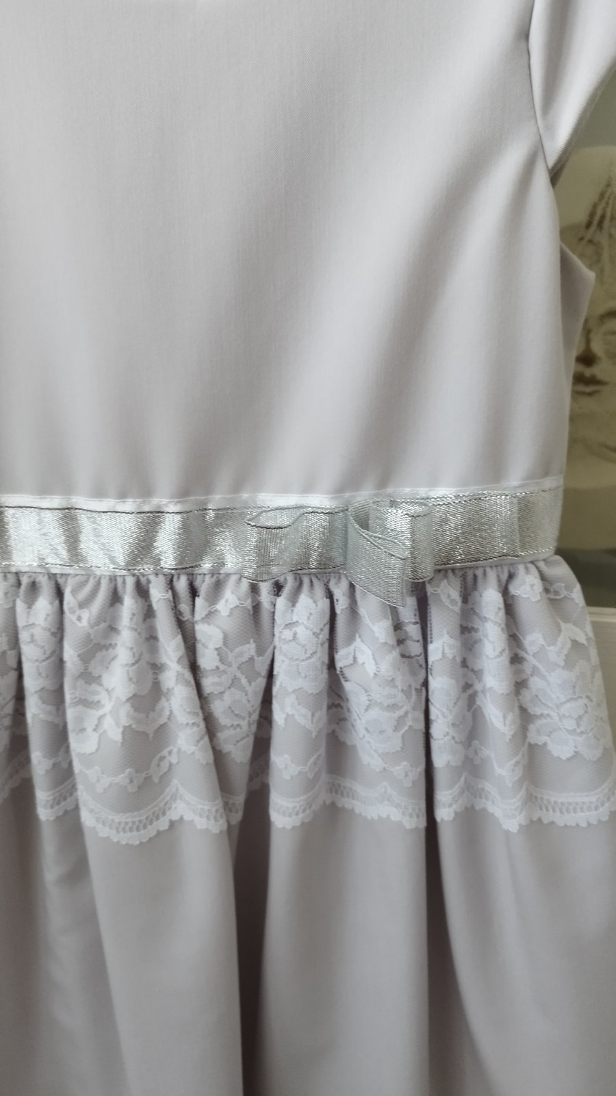 Krásne svetlo šedé šaty s bielou čipkou a striebornou mašličkou, kvalitné šaty, má krásne detaily, nosené len 2-3krat, pôvodná cena 29€