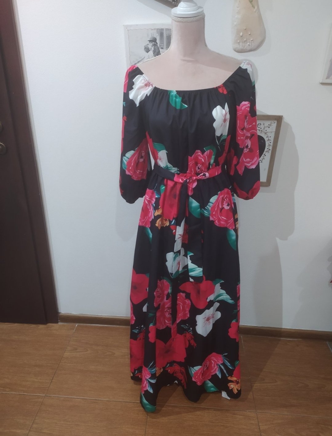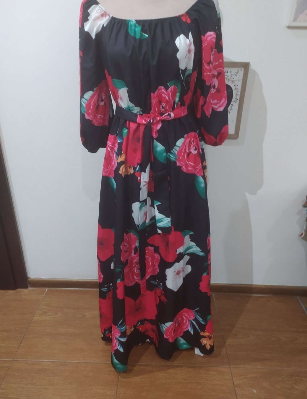 Krásne kvetovane šaty,maxi dl.Saty sú v top stave,vhodné aj na príležitosť.Vrch stiahnutý do gumičky,možnosť nosenia na ramenách alebo aj cez.V páse guma, doplnené pre zvýraznenie pasu opaskom,široká sukňa,veľ Uni vhodné pre veľ S-L
