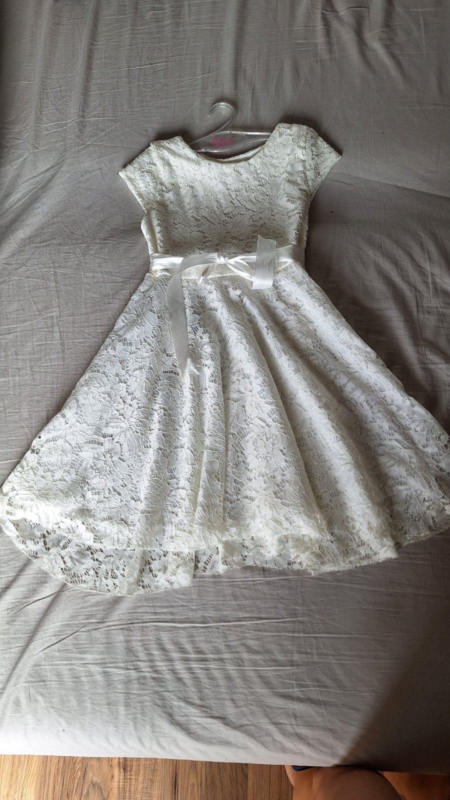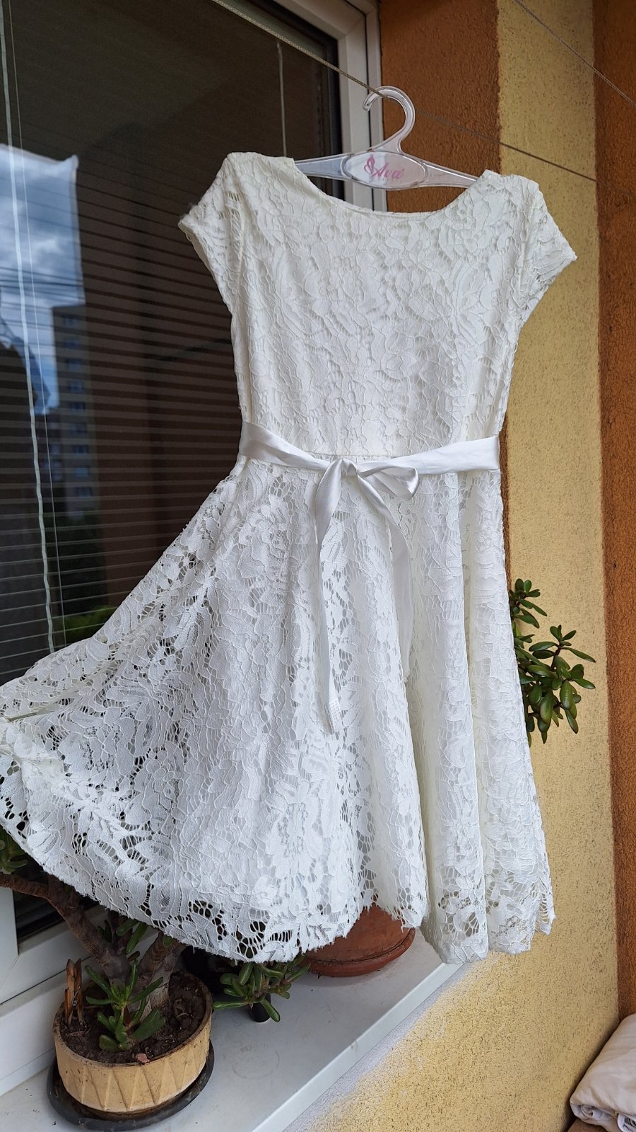 Nenosené letné šaty, kt. mali poslúžiť ako šaty na 1.sv.prijímanie, ale nakoniec zostali nepoužité. Celková dĺžka 80cm. Dĺžka od pleca po prestrih v páse 27cm. Širka v prestrihu 2x37cm. Farba smotanová biela.