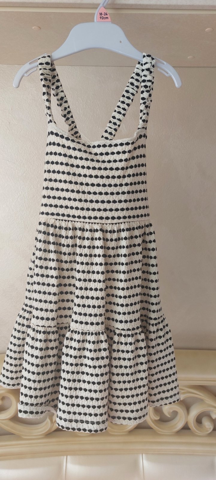 Predám krásne krémovo-čierne šatičky na ramienka, sú vzdušné,padavé a vzadu prekrížené na ramienka. Sú štýlové,velkostne104/110.