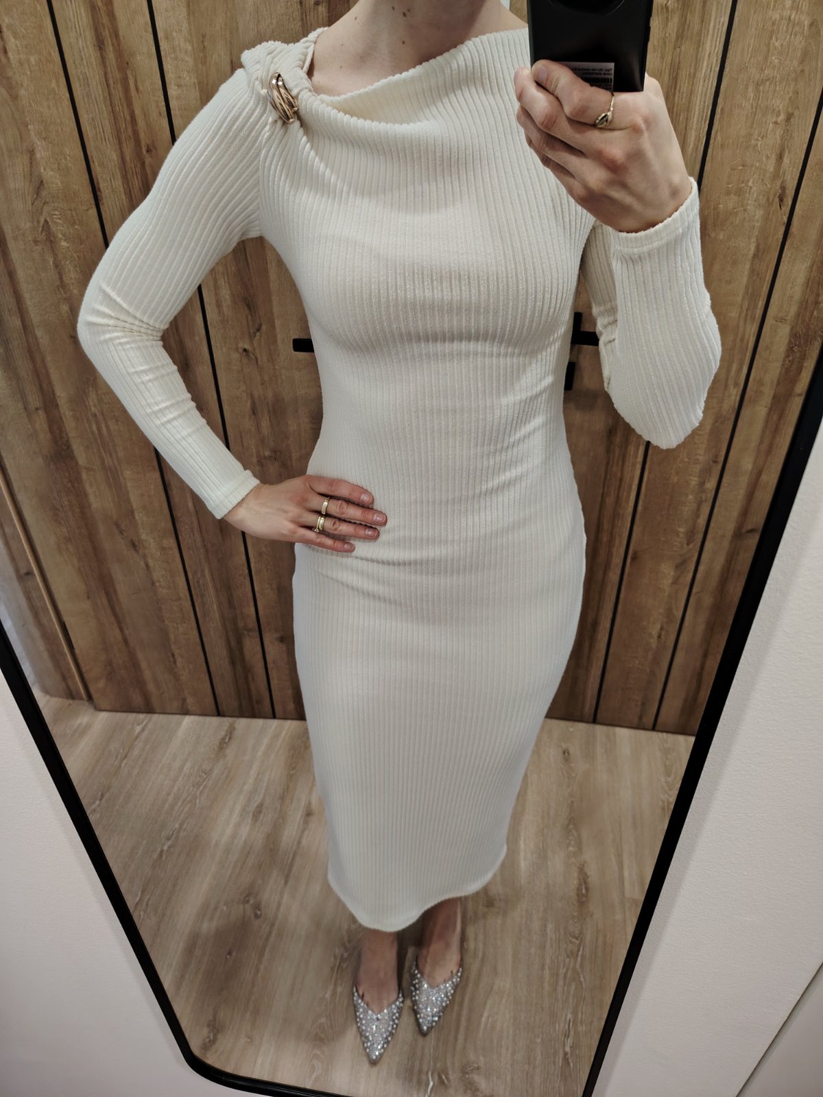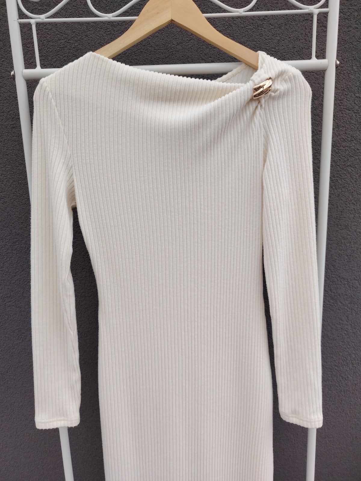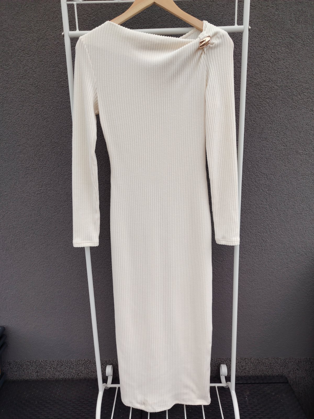 Béžové midi šaty so zlatou sponou