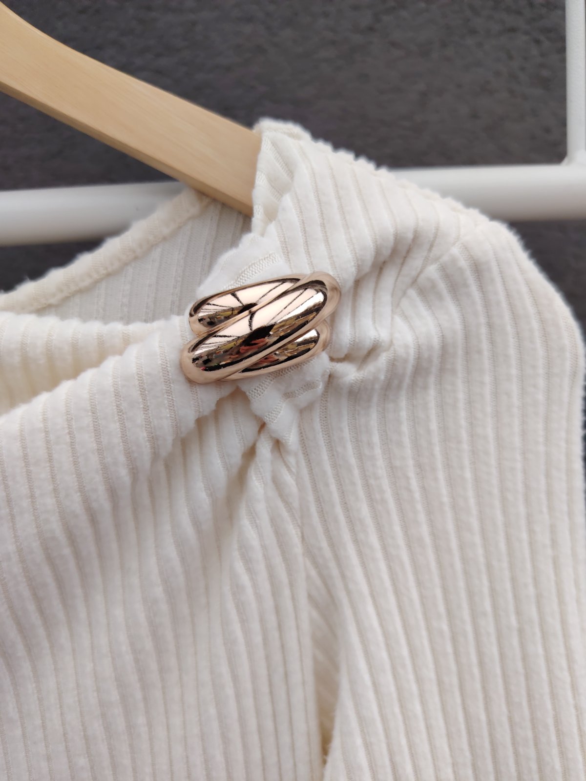 - ozdobná zlatá spona pri ľavom pleci