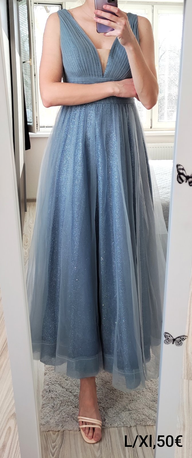 Krásne trblietavé šaty pre buď nižšiu postavu alebo vysokú ako midi, veľkosť 42, odporúčam na L/XL. Cena 50 eur.
