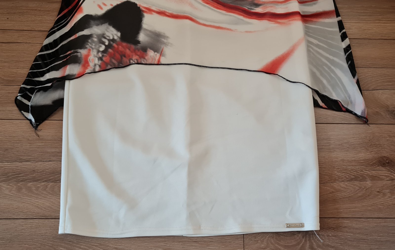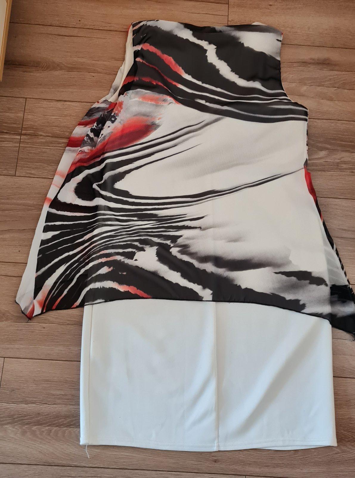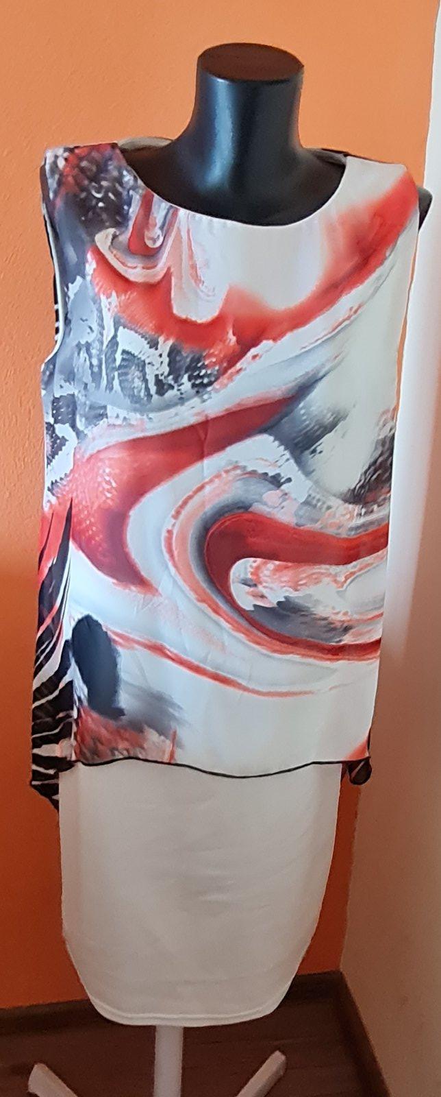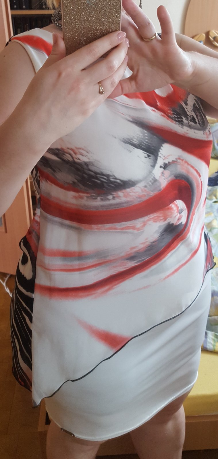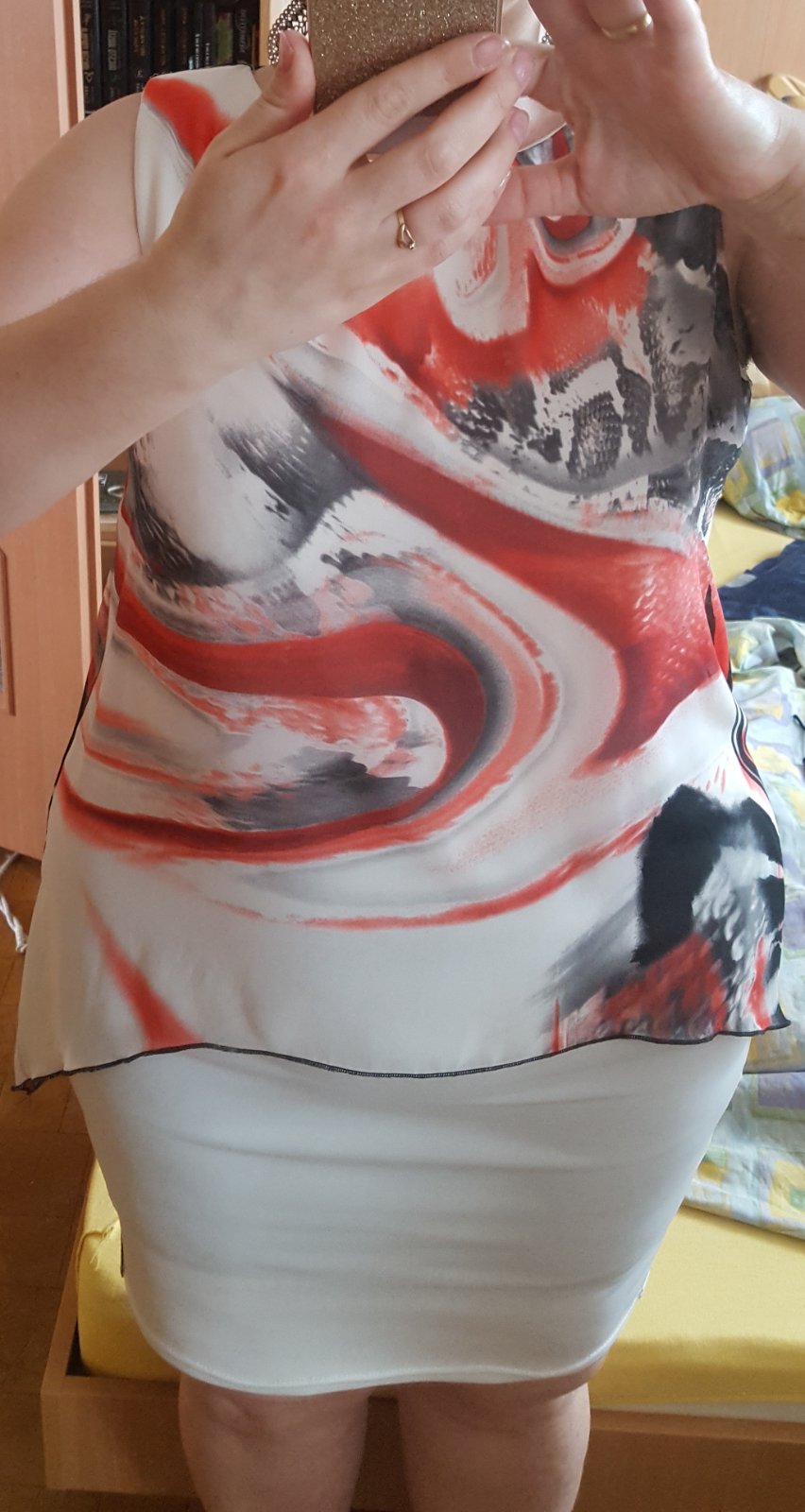 Šaty, ktoré sú snom každej ženy ! Sú krásne a ešte aj zakryjú všetky nedostatky, popôrodné kilá a pod. Klasické úzke biznisové šaty a na nich šifónový široký vršok, ktorý zakryje všetko, čo treba. Zloženie polyester + elastan, vpredu som si všimla maličký hnedý pásik, ktorý pôjde vyprať, perfektný stav