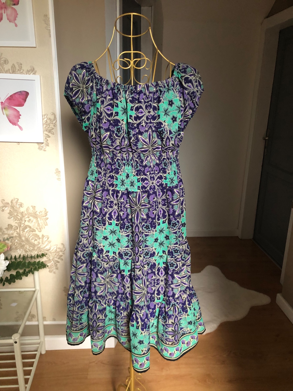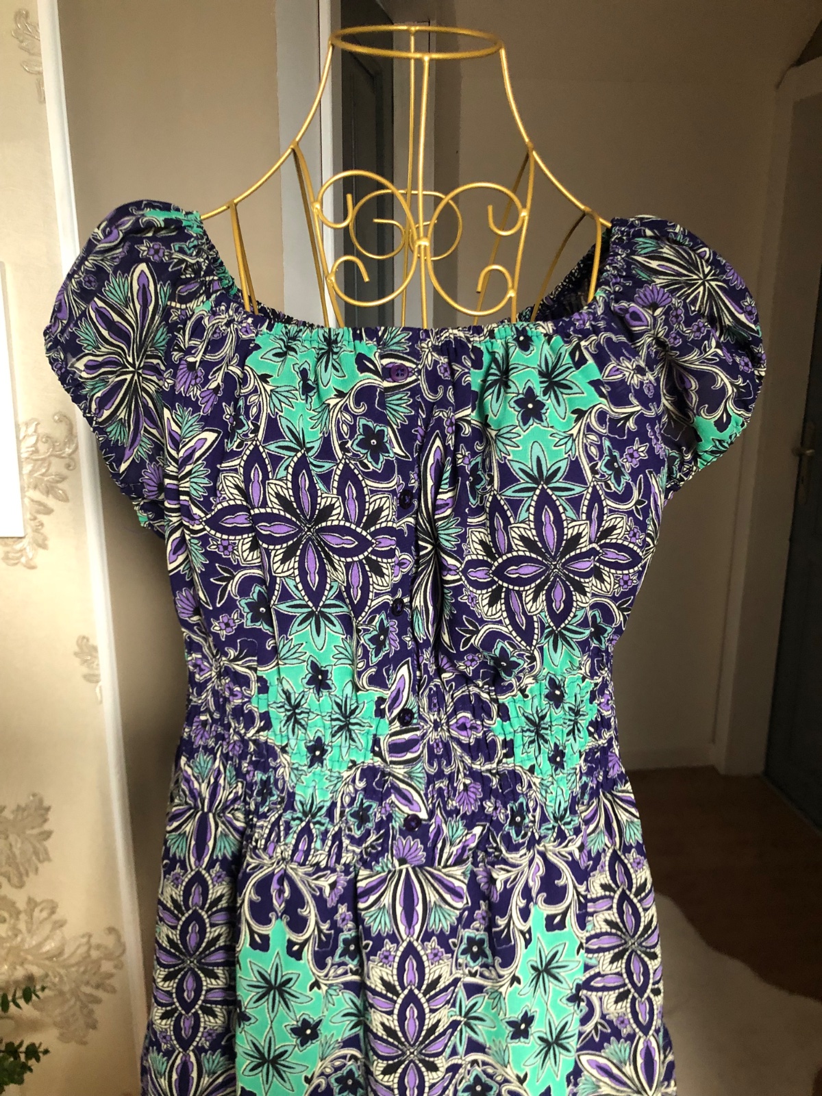 Kvalitné letné šaty, zeleno-fialovej farby, nariasené do gumiek, podšité, super stav.