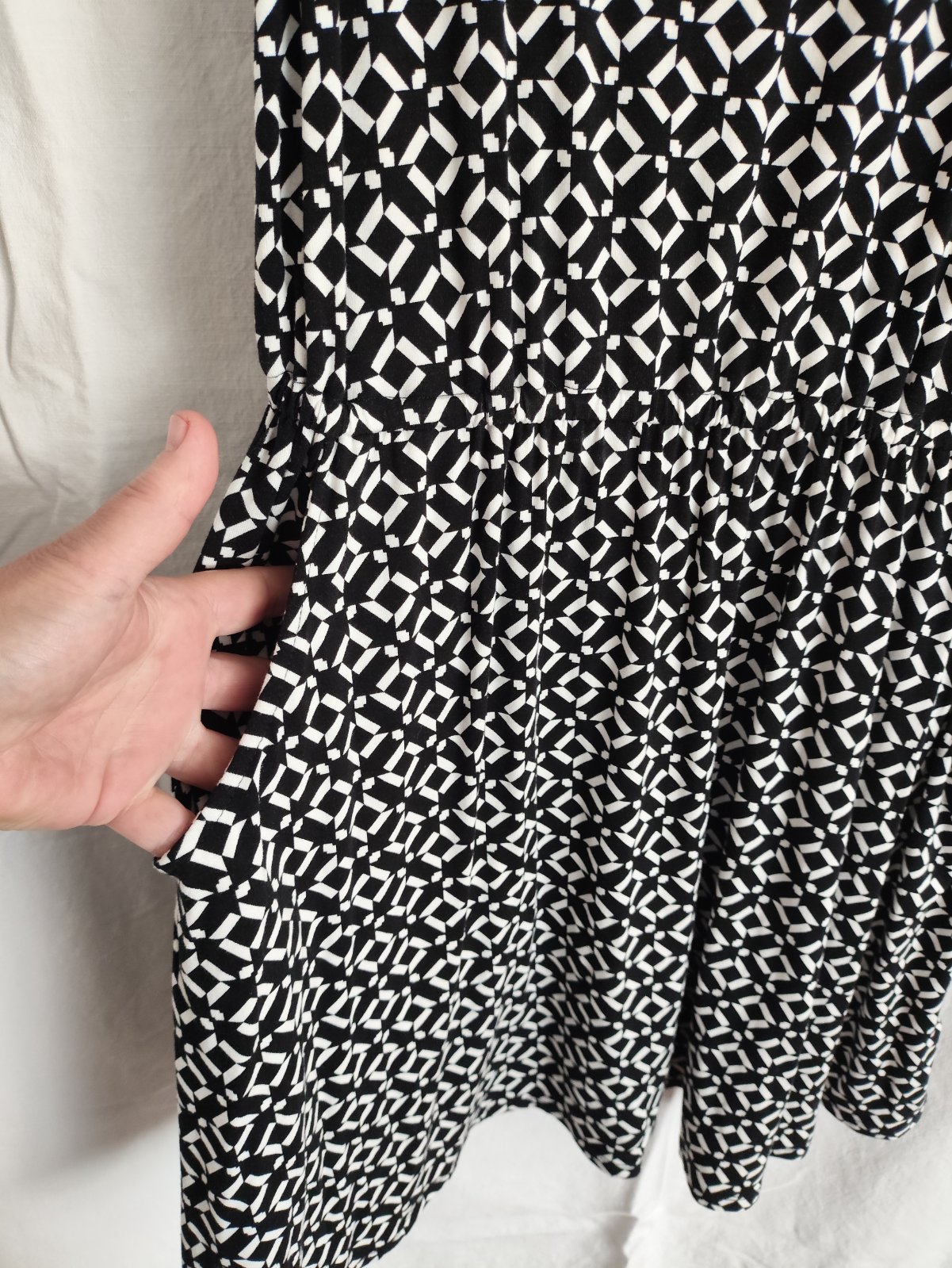 Padava látka, veľmi príjemná. Dĺžka 97 cm. Majú vrecká.