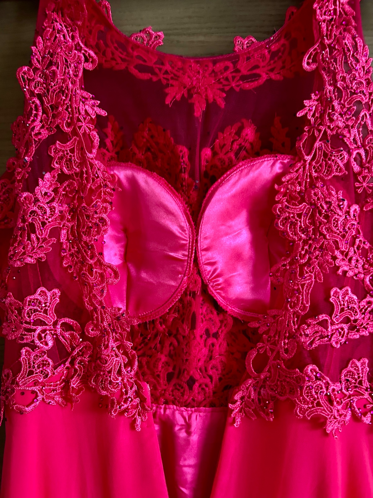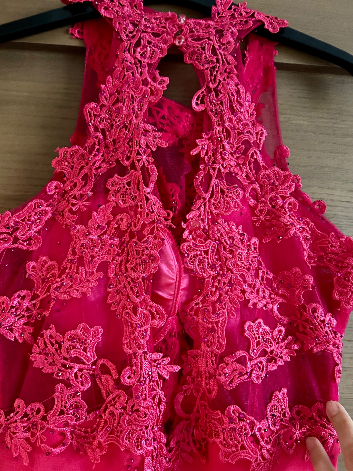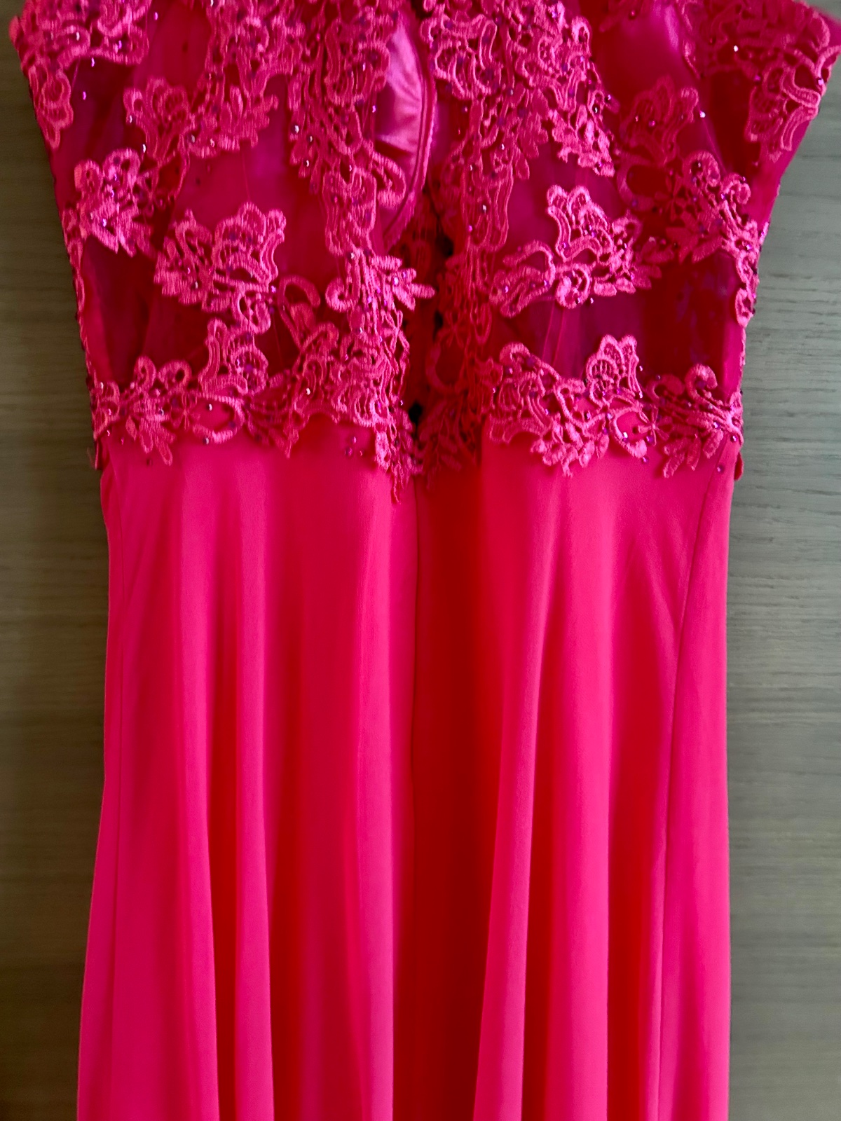 Dĺžka celková 157cm, šírka pod pazuchami 38cm. Vrchná časť elastická, poddajná. Šaty sú ľahučké, podšité saténom.