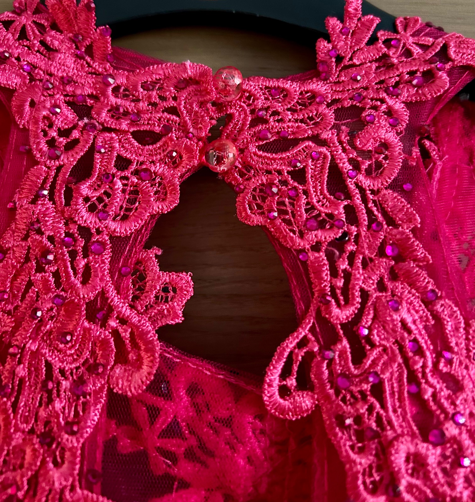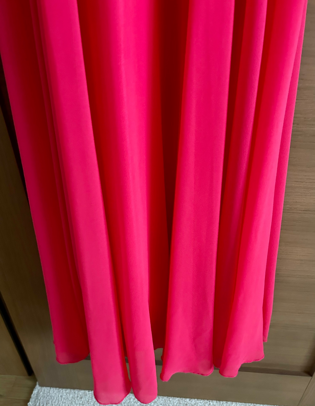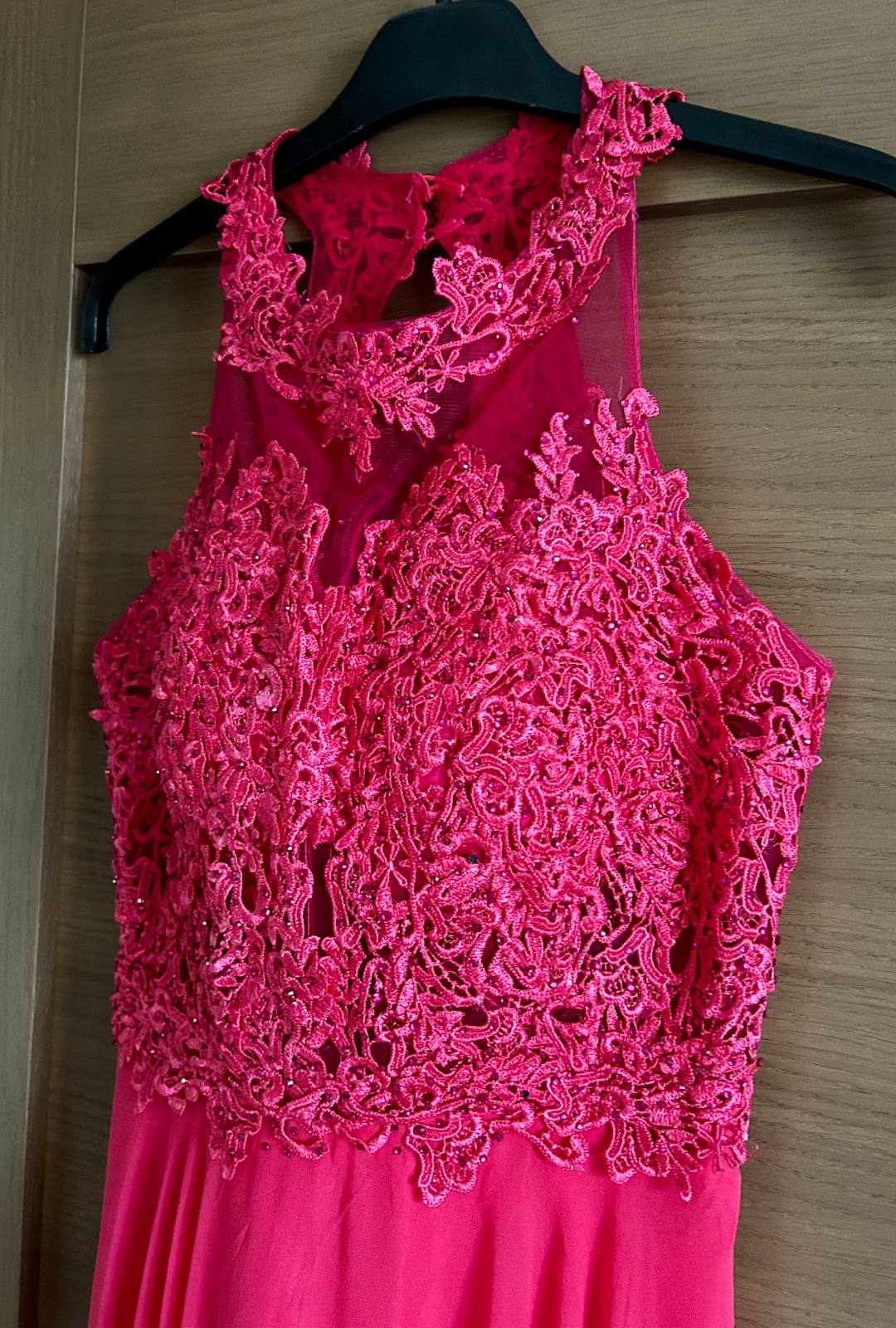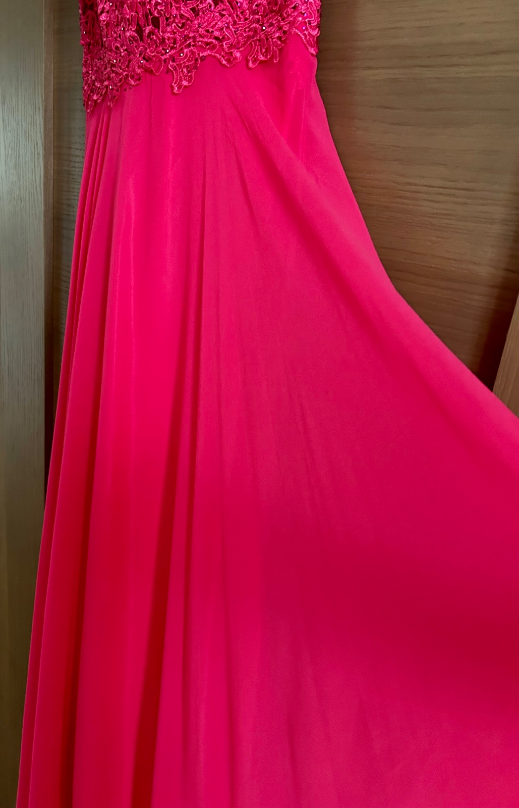 Dĺžka celková 157cm, šírka pod pazuchami 38cm. Vrchná časť elastická, poddajná. Šaty sú ľahučké, podšité saténom.