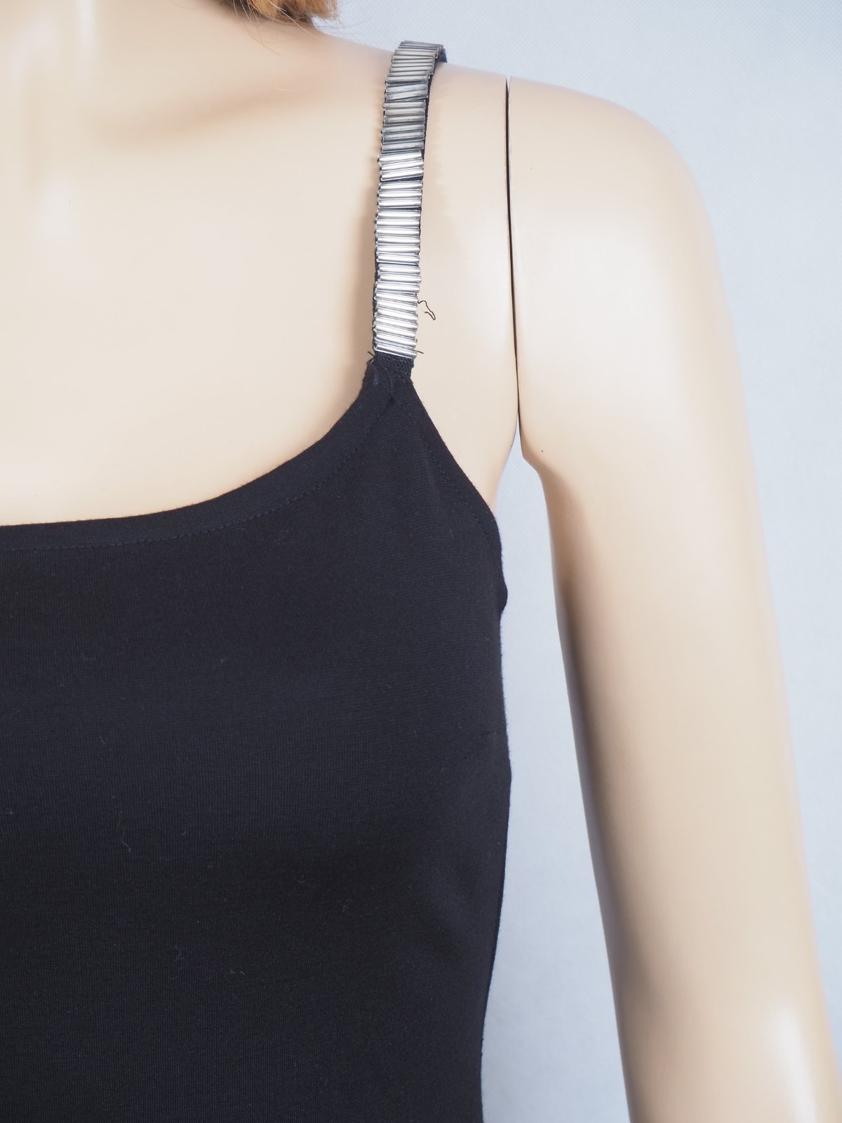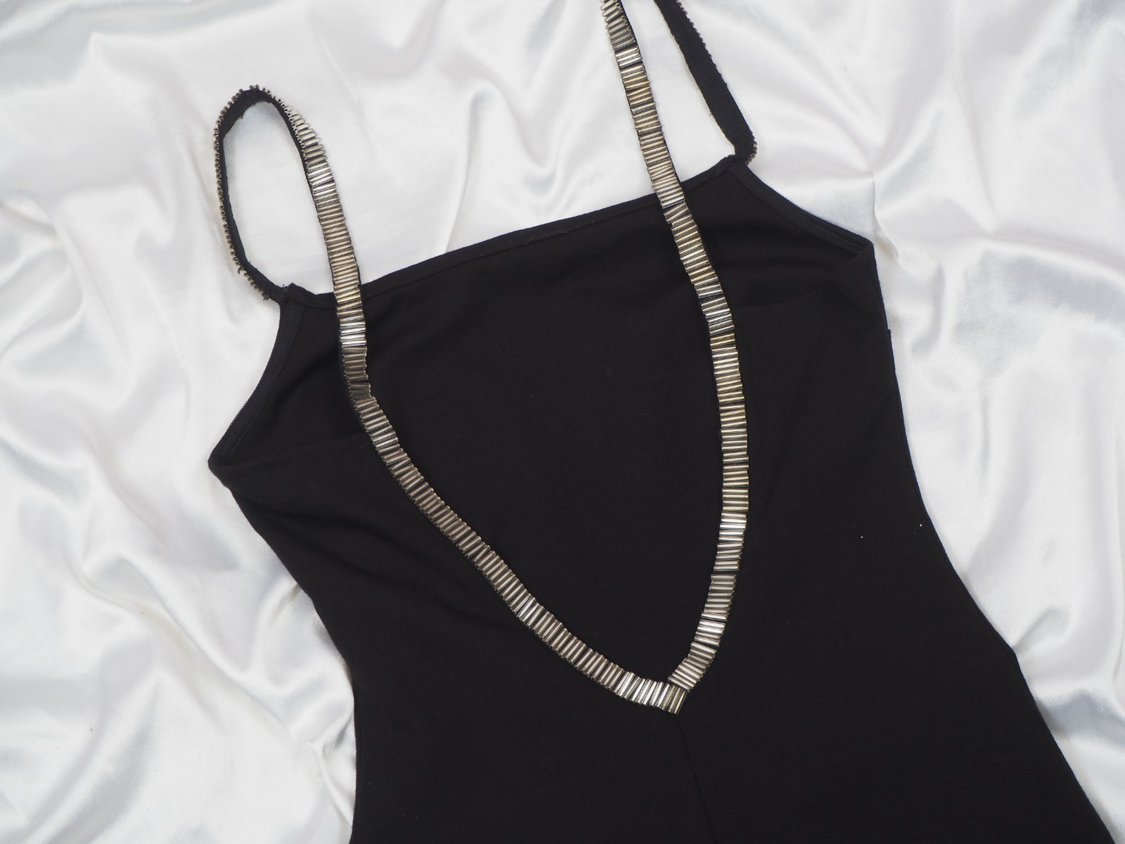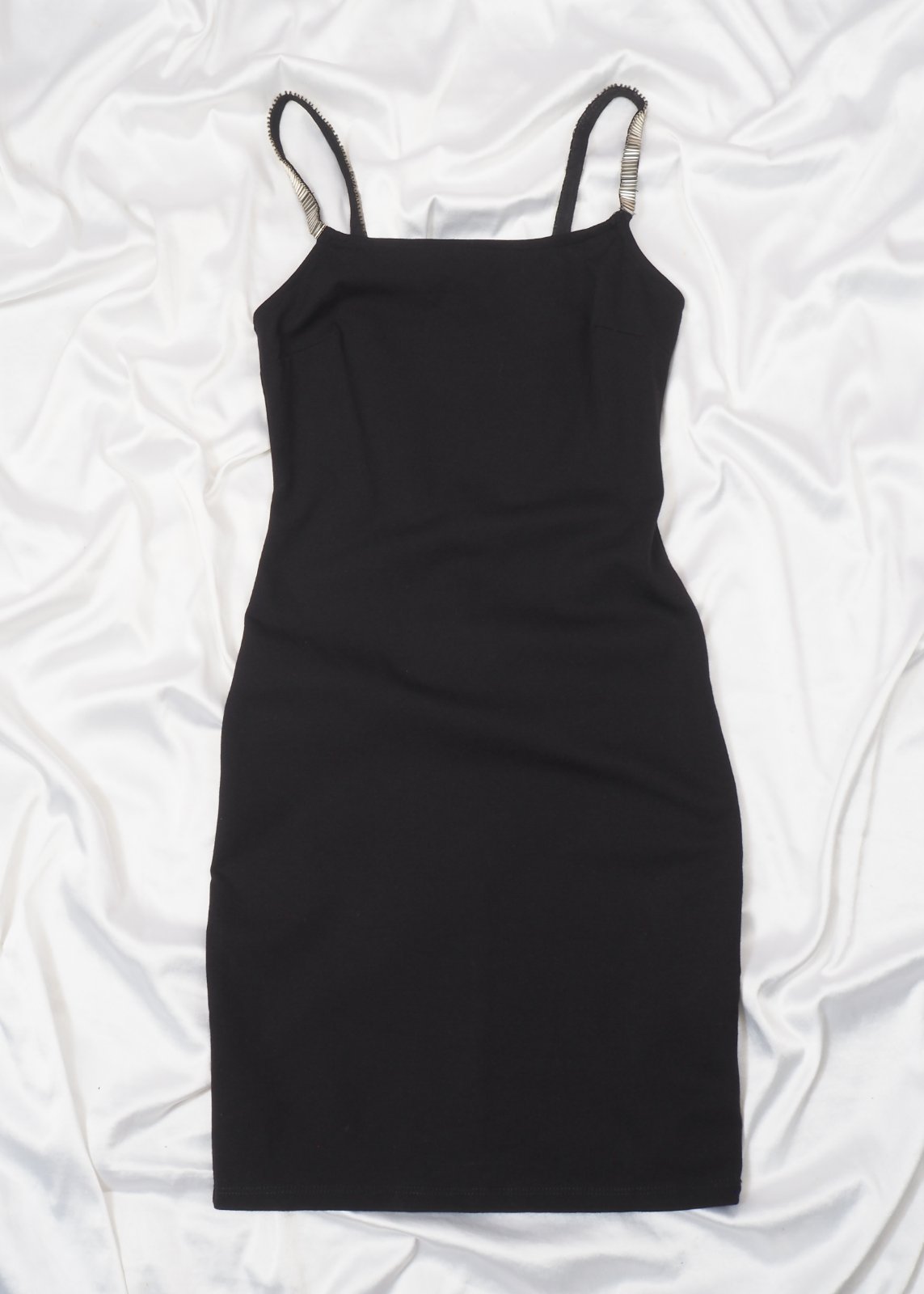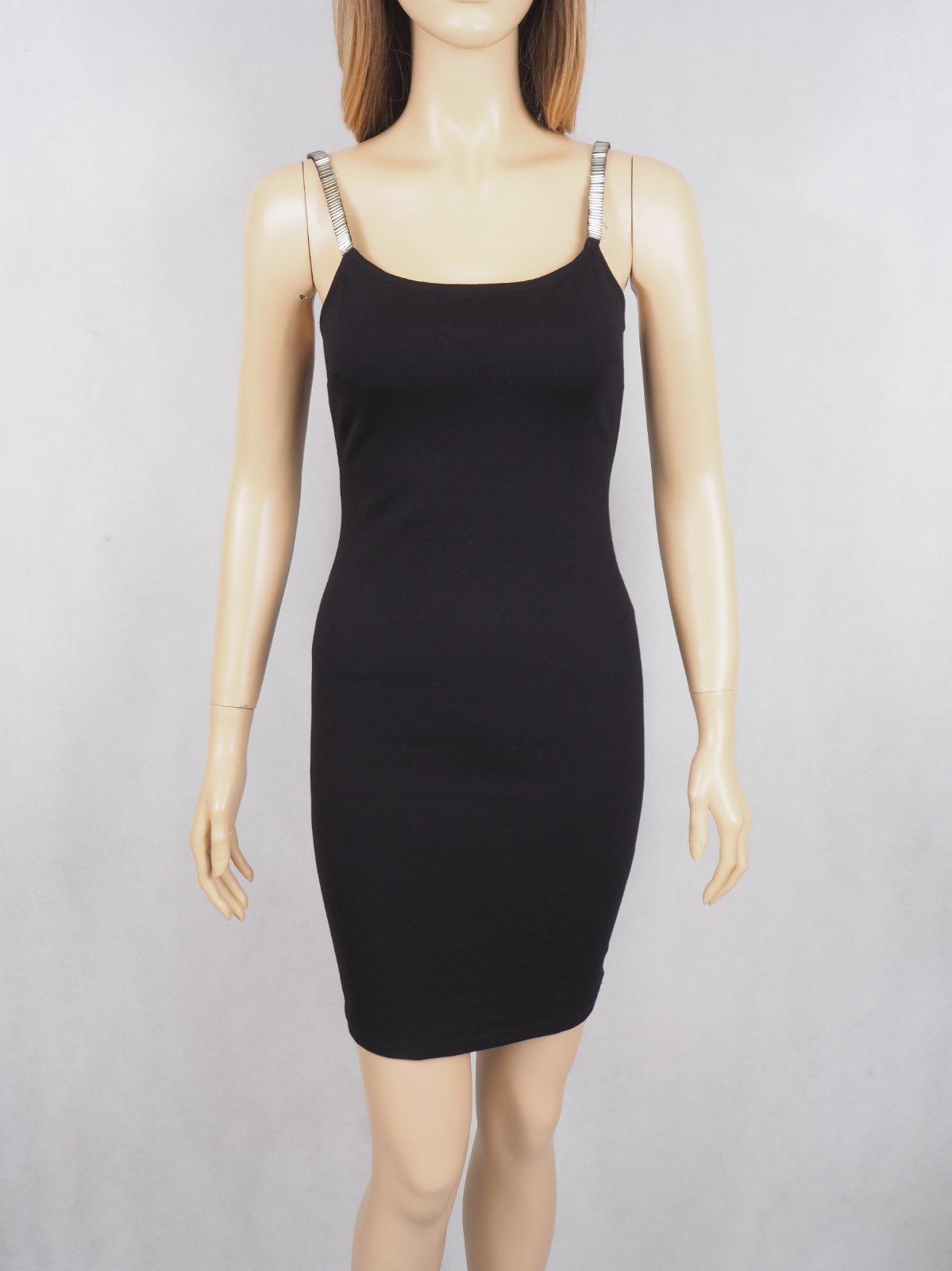 Kvalitné letné šaty čiernej farby, ramienka zdobené našitým korálkami, materiál 65% viskóza, 30% polyester, 5% elastan, super stav.