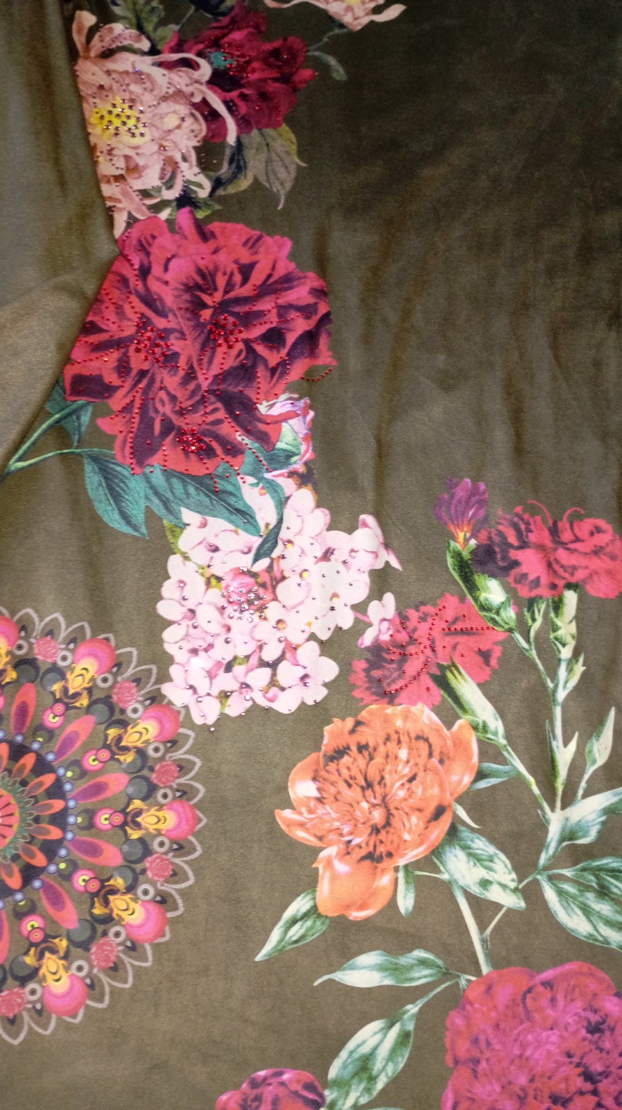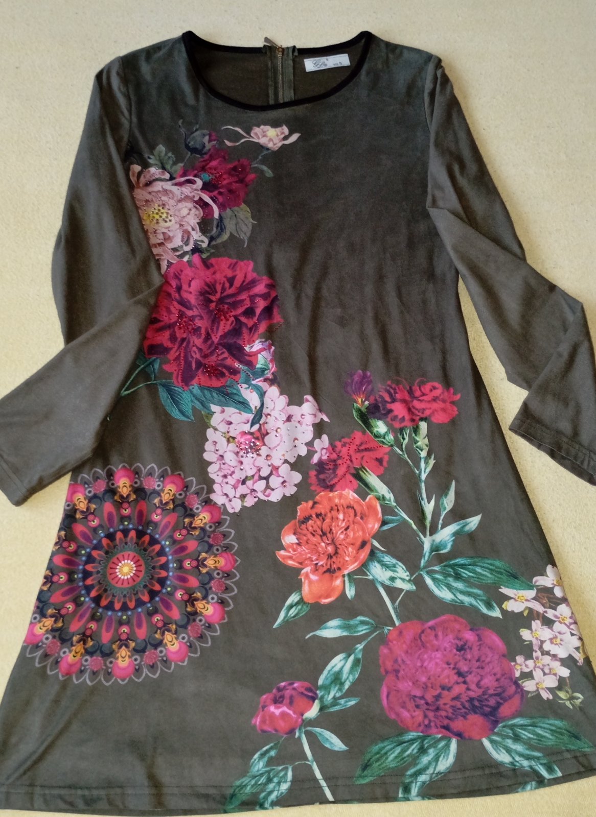Olivové šaty, mierne zvonový rukáv, strihané do tvaru A. Aplikácia kvetov, dĺžka 88cm.