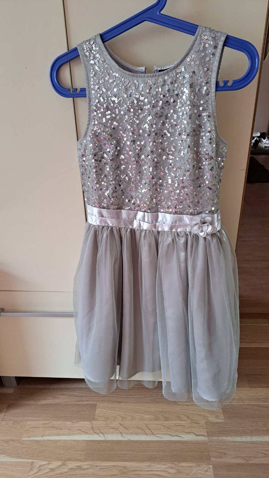 Krásne letné šaty s trblietkami. Pri dlhšom nosení odporúčam bolerko alebo svetrík, lebo tie trblietky trošku škriabu. Veľkosť na štítku 164 ale v skutočnosti menšie. Odhadujem 158.