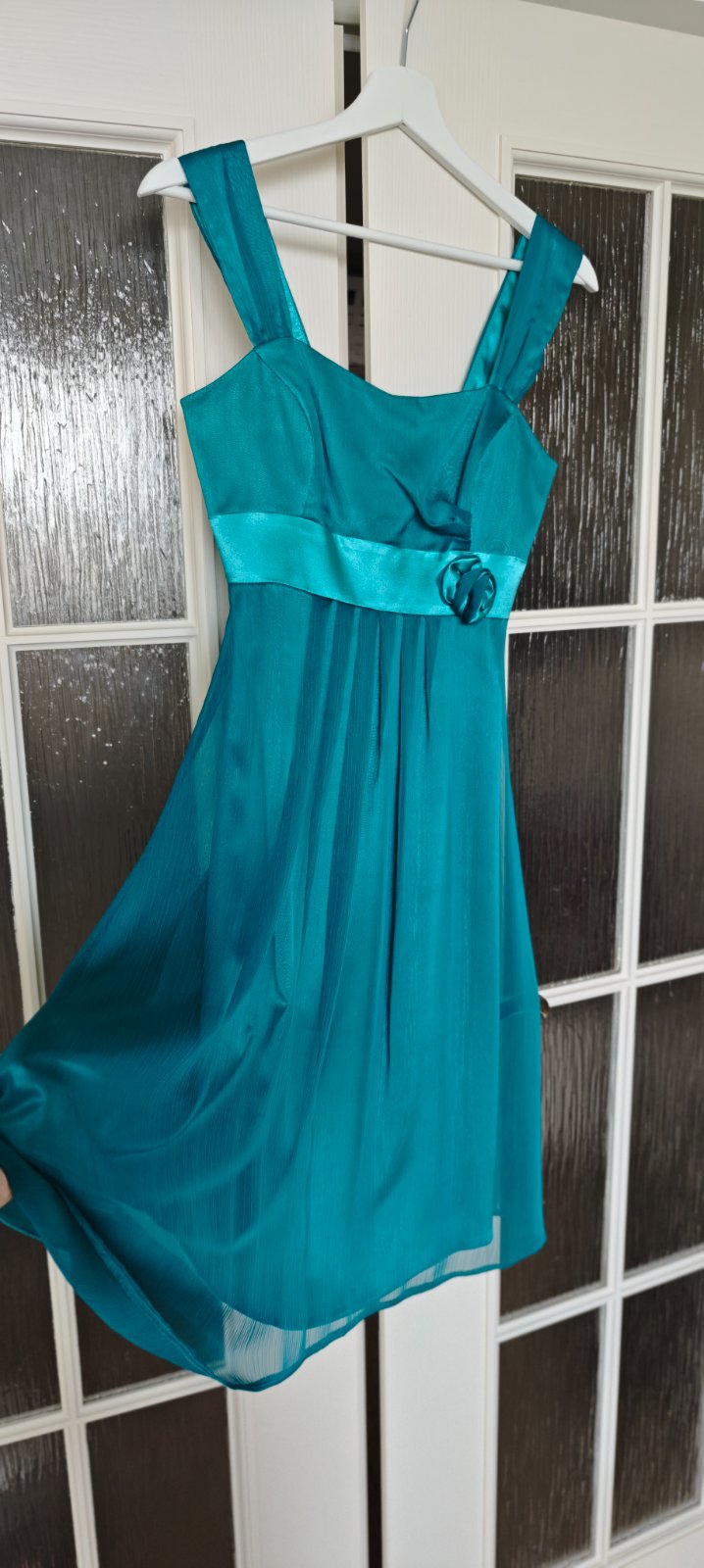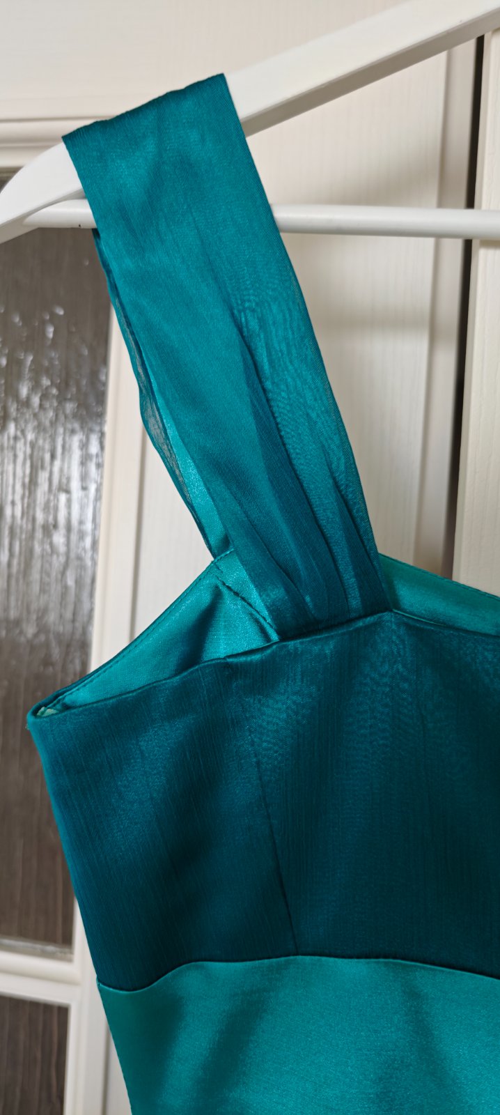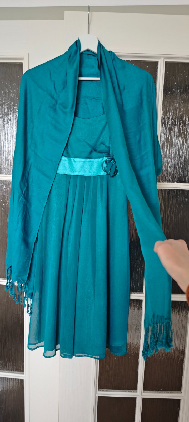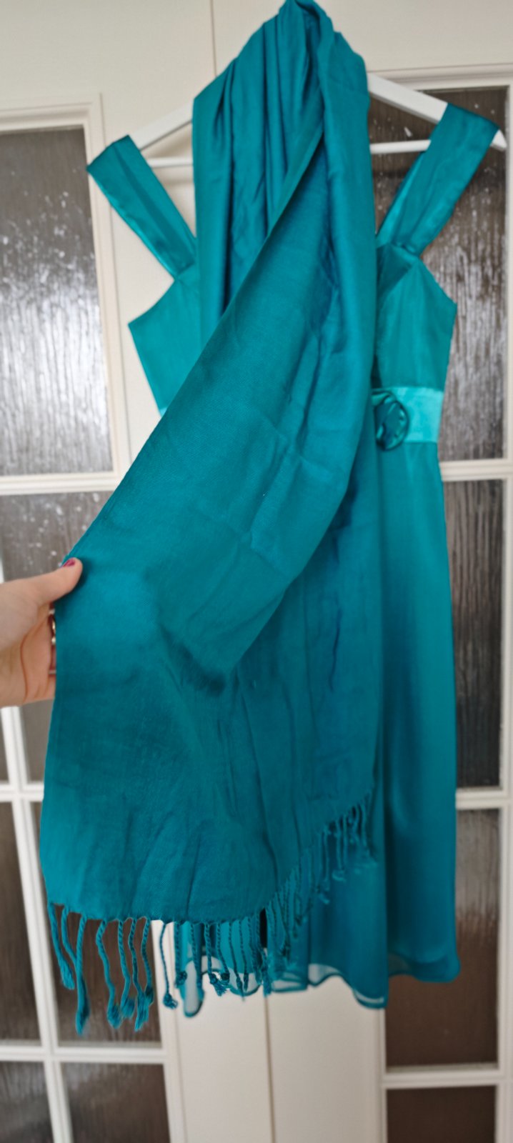 Predám tieto ani raz nepoužité koktejlové šaty petrolejovej farby vo veľkosti 36. Boli kupované v butiku so spoločenskými šatami. Strih od pásu do A. Zapínanie vzadu na krycí zips. Mám aj úplne nové bolerko vo veľkosti S, ak by bol záujem a úplne nový šál /štólu rovnakej, petrolejovej farby, ako šaty, štóla je z príjemného, padavého materiálu.