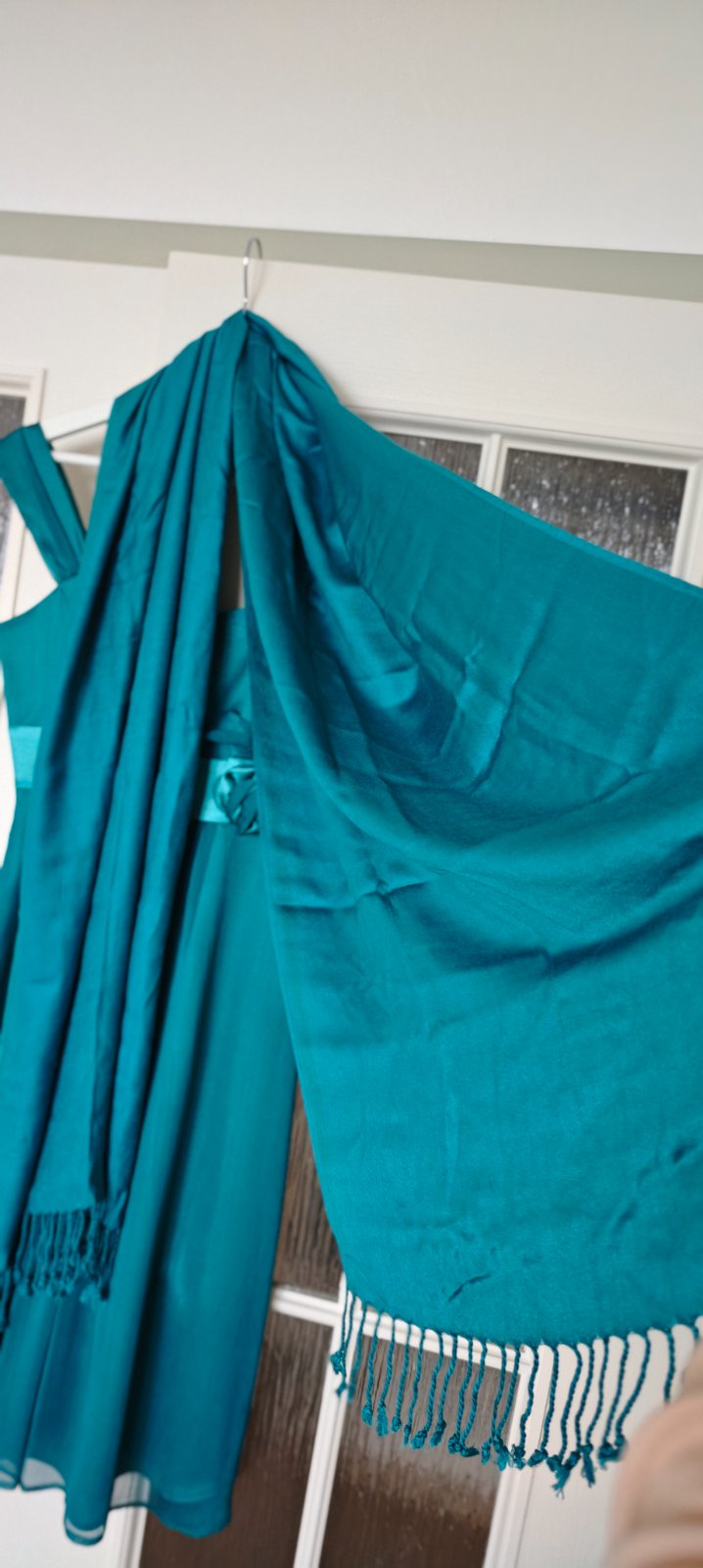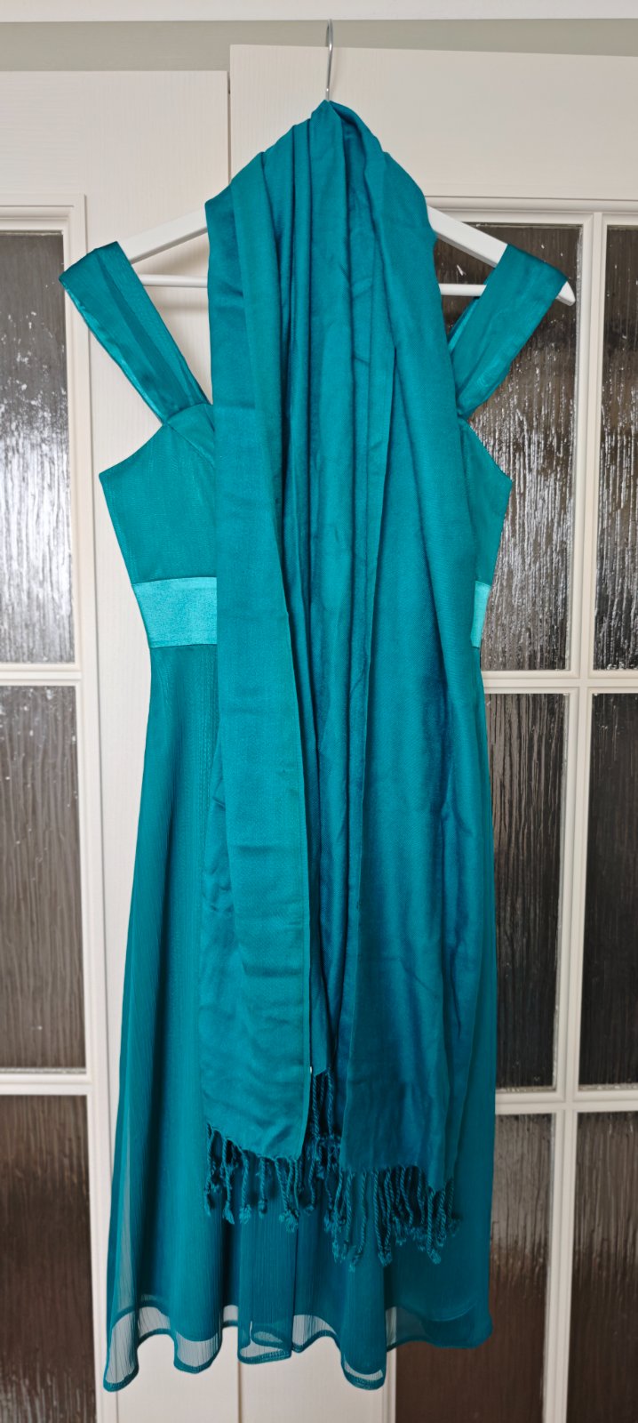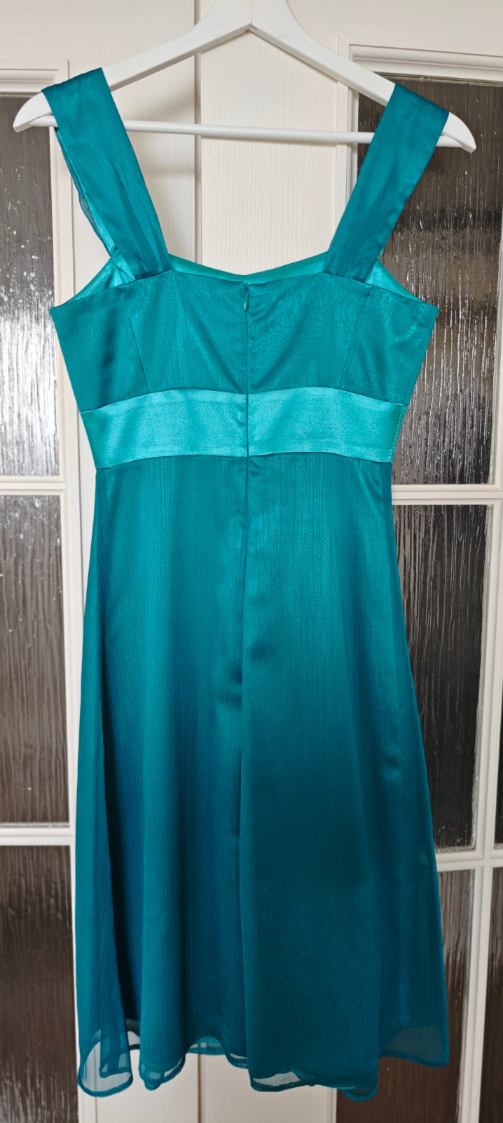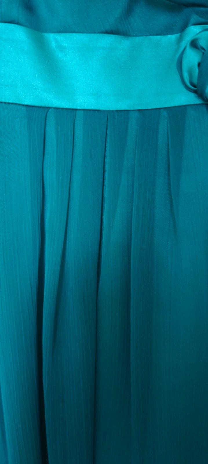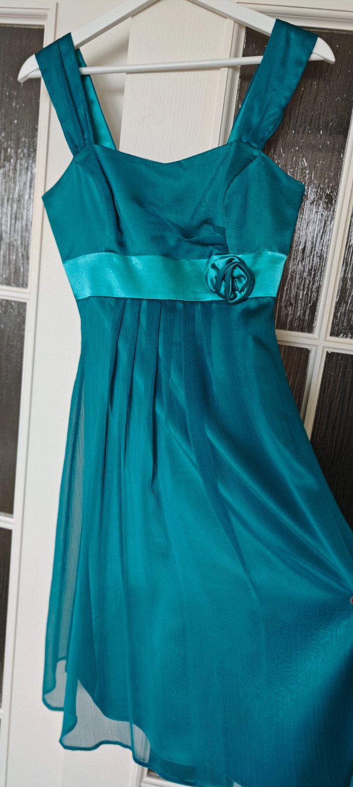 Predám tieto ani raz nepoužité koktejlové šaty petrolejovej farby vo veľkosti 36. Boli kupované v butiku so spoločenskými šatami. Strih od pásu do A. Zapínanie vzadu na krycí zips. Mám aj úplne nové bolerko vo veľkosti S, ak by bol záujem a úplne nový šál /štólu rovnakej, petrolejovej farby, ako šaty, štóla je z príjemného, padavého materiálu.