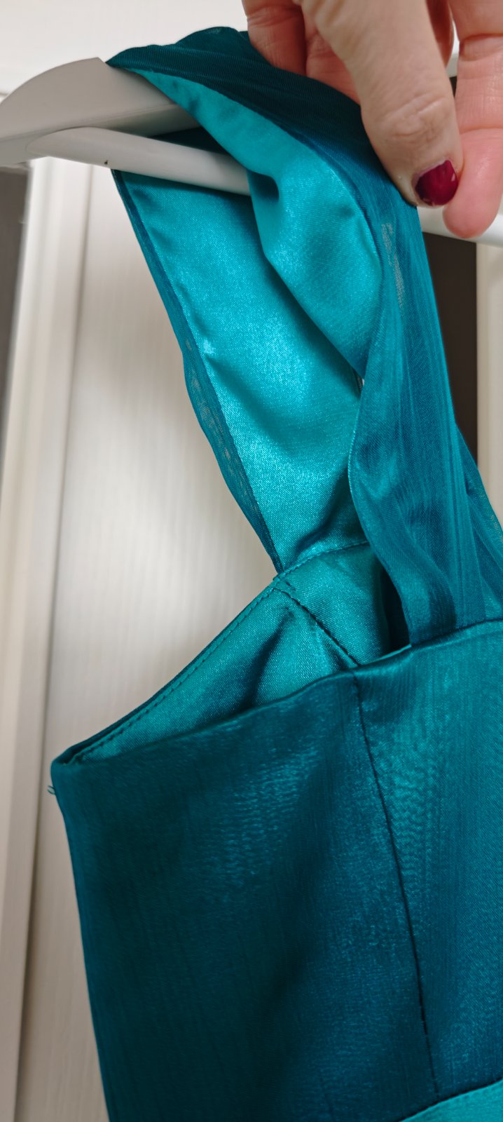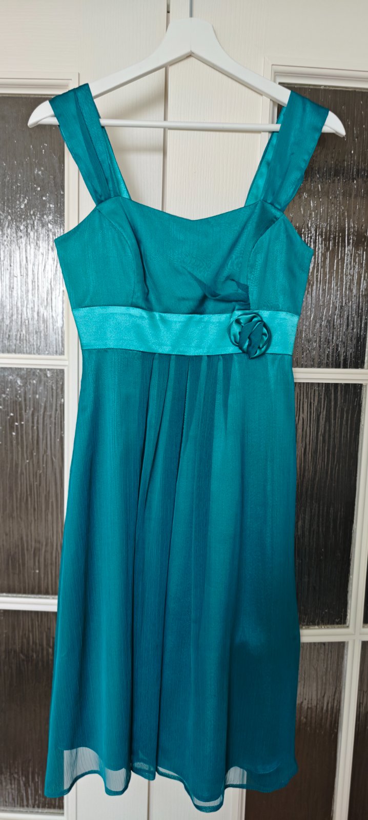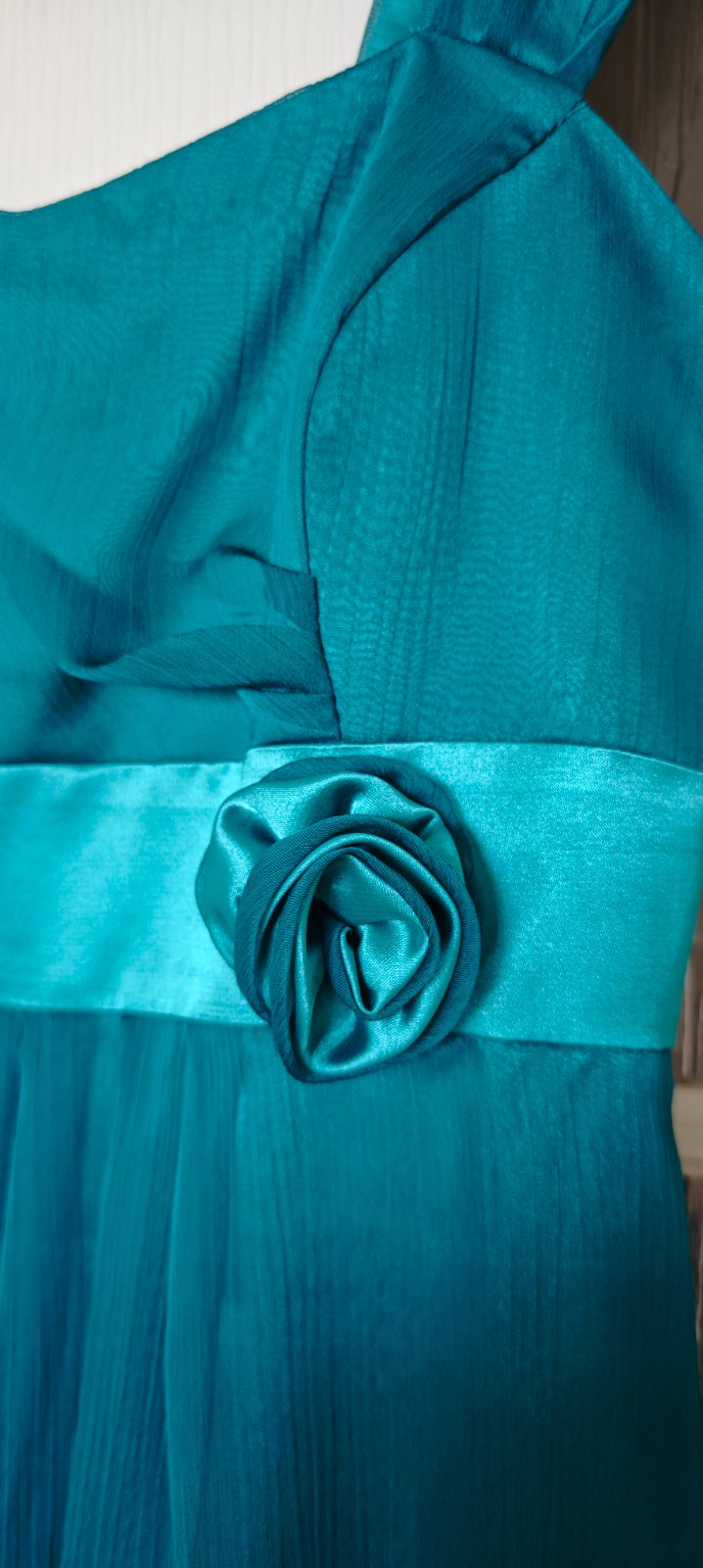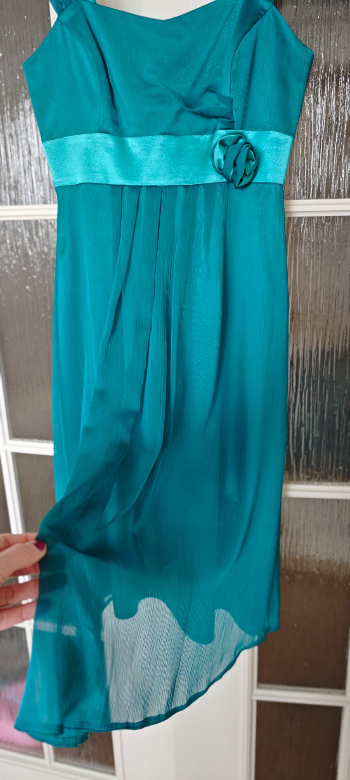 Predám tieto ani raz nepoužité koktejlové šaty petrolejovej farby vo veľkosti 36. Boli kupované v butiku so spoločenskými šatami. Strih od pásu do A. Zapínanie vzadu na krycí zips. Mám aj úplne nové bolerko vo veľkosti S, ak by bol záujem a úplne nový šál /štólu rovnakej, petrolejovej farby, ako šaty, štóla je z príjemného, padavého materiálu.