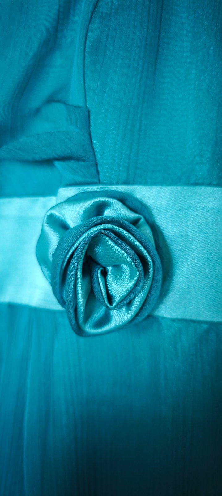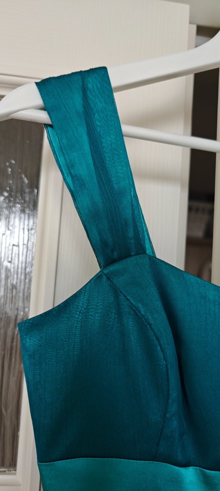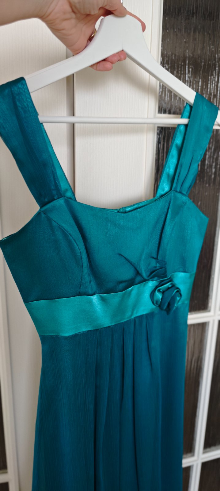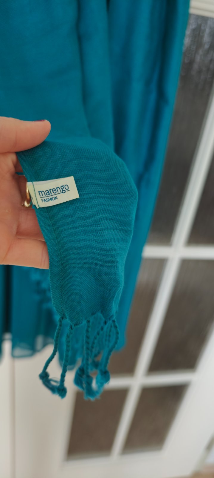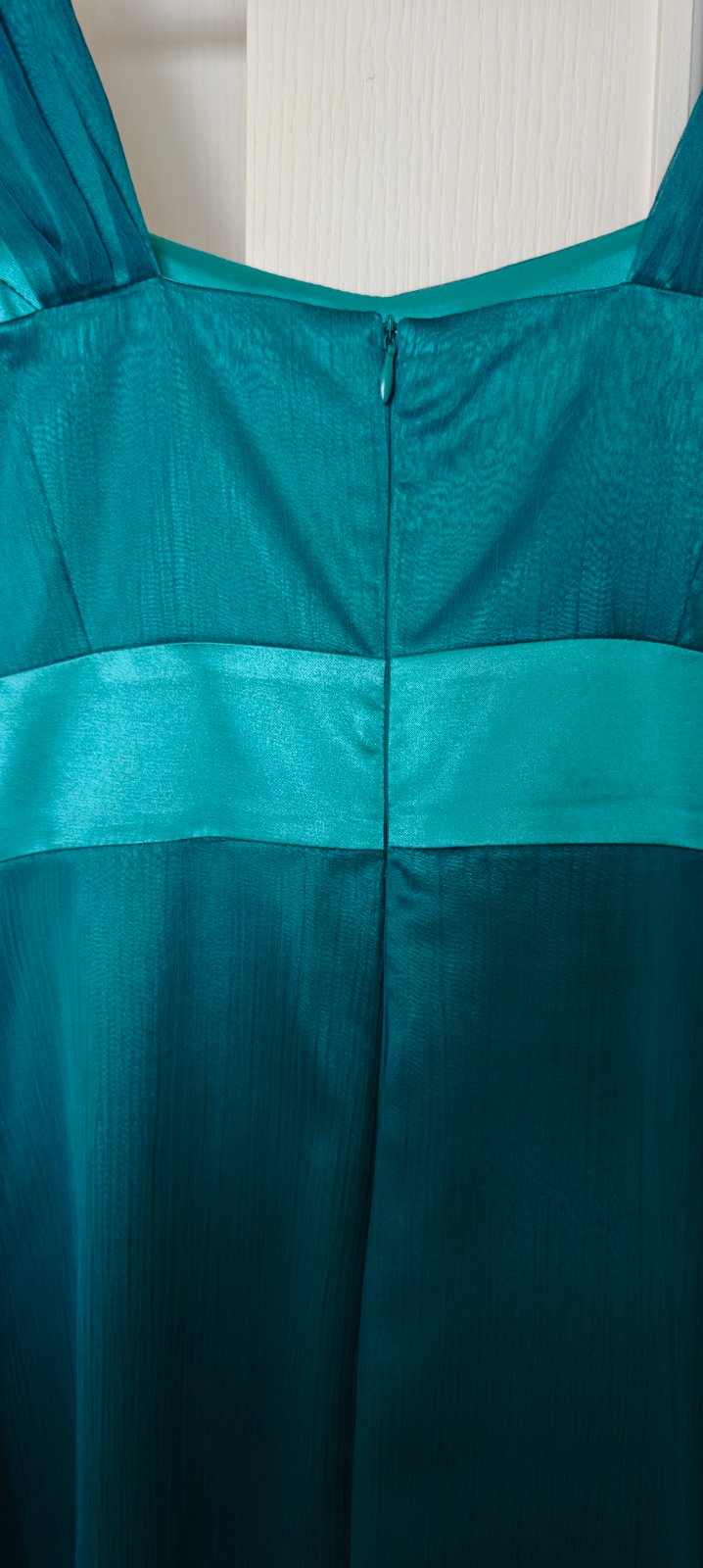 Predám tieto ani raz nepoužité koktejlové šaty petrolejovej farby vo veľkosti 36. Boli kupované v butiku so spoločenskými šatami. Strih od pásu do A. Zapínanie vzadu na krycí zips. Mám aj úplne nové bolerko vo veľkosti S, ak by bol záujem a úplne nový šál /štólu rovnakej, petrolejovej farby, ako šaty, štóla je z príjemného, padavého materiálu.