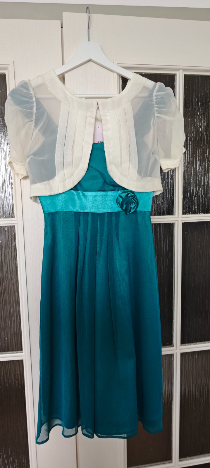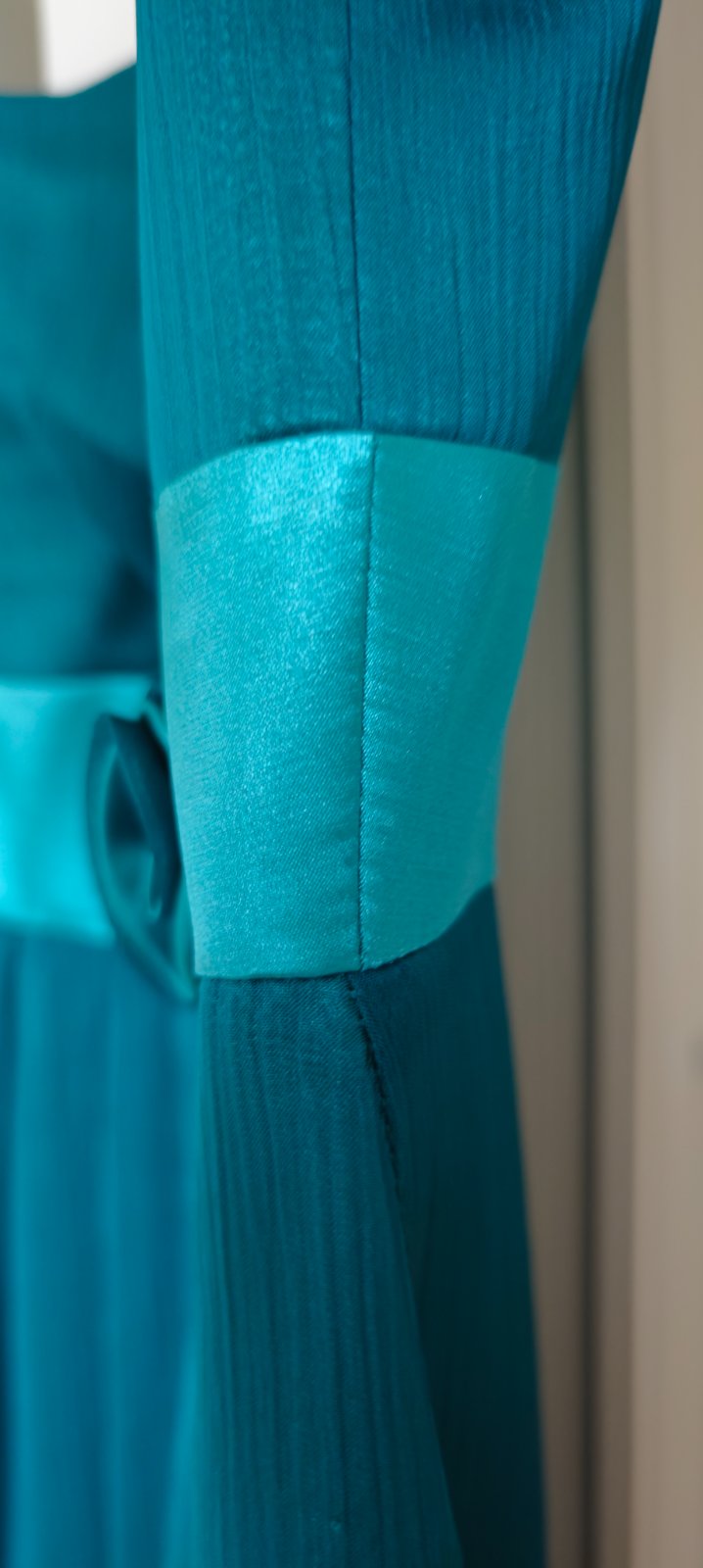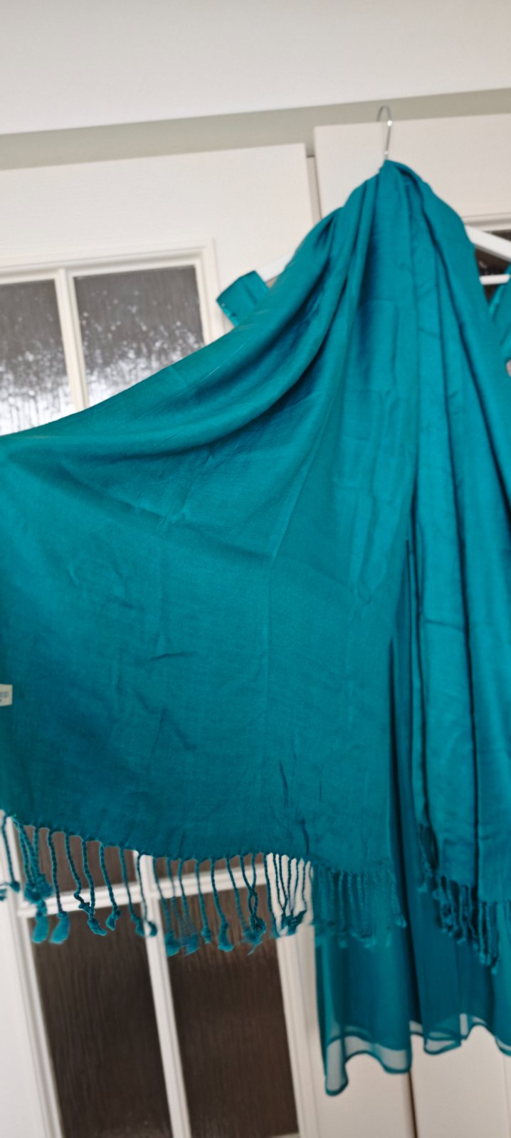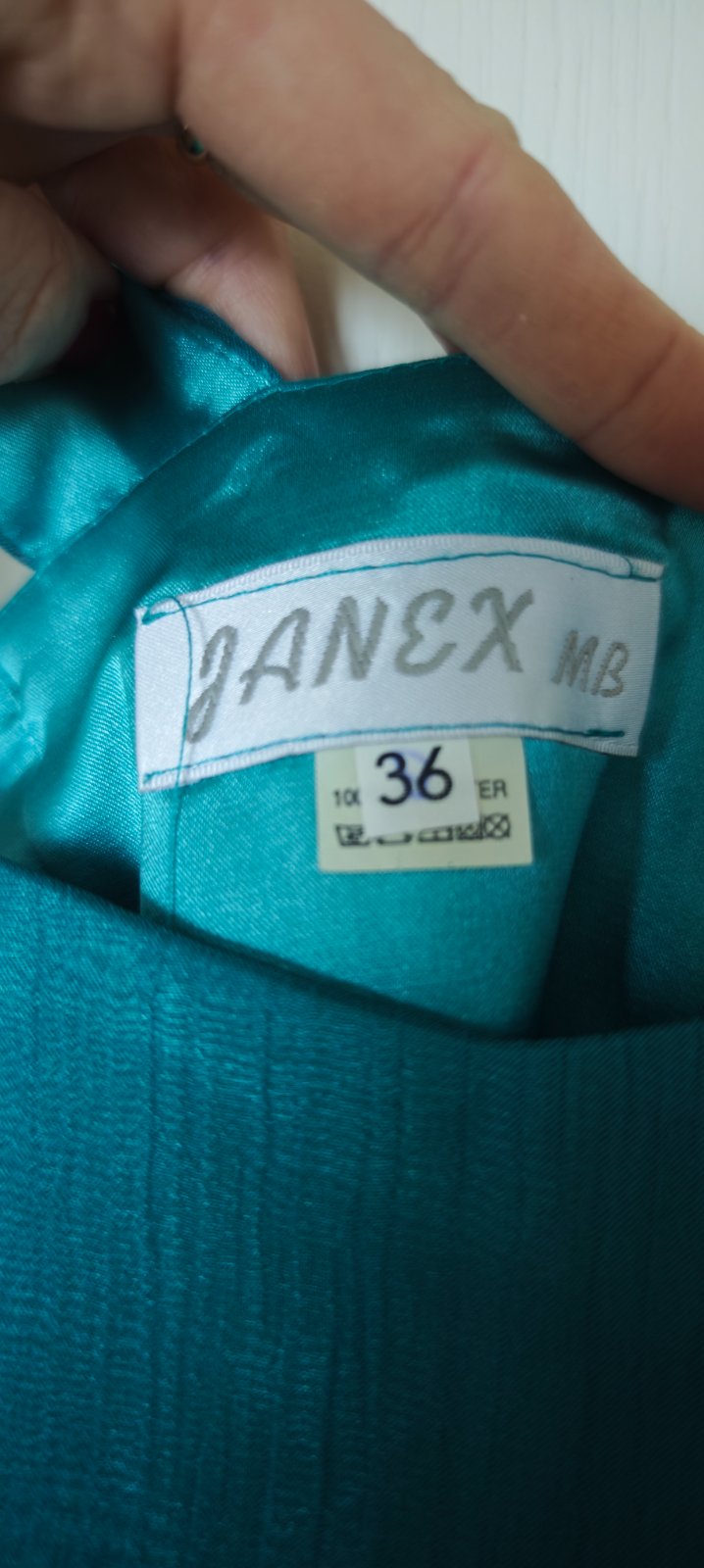 Predám tieto ani raz nepoužité koktejlové šaty petrolejovej farby vo veľkosti 36. Boli kupované v butiku so spoločenskými šatami. Strih od pásu do A. Zapínanie vzadu na krycí zips. Mám aj úplne nové bolerko vo veľkosti S, ak by bol záujem a úplne nový šál /štólu rovnakej, petrolejovej farby, ako šaty, štóla je z príjemného, padavého materiálu.