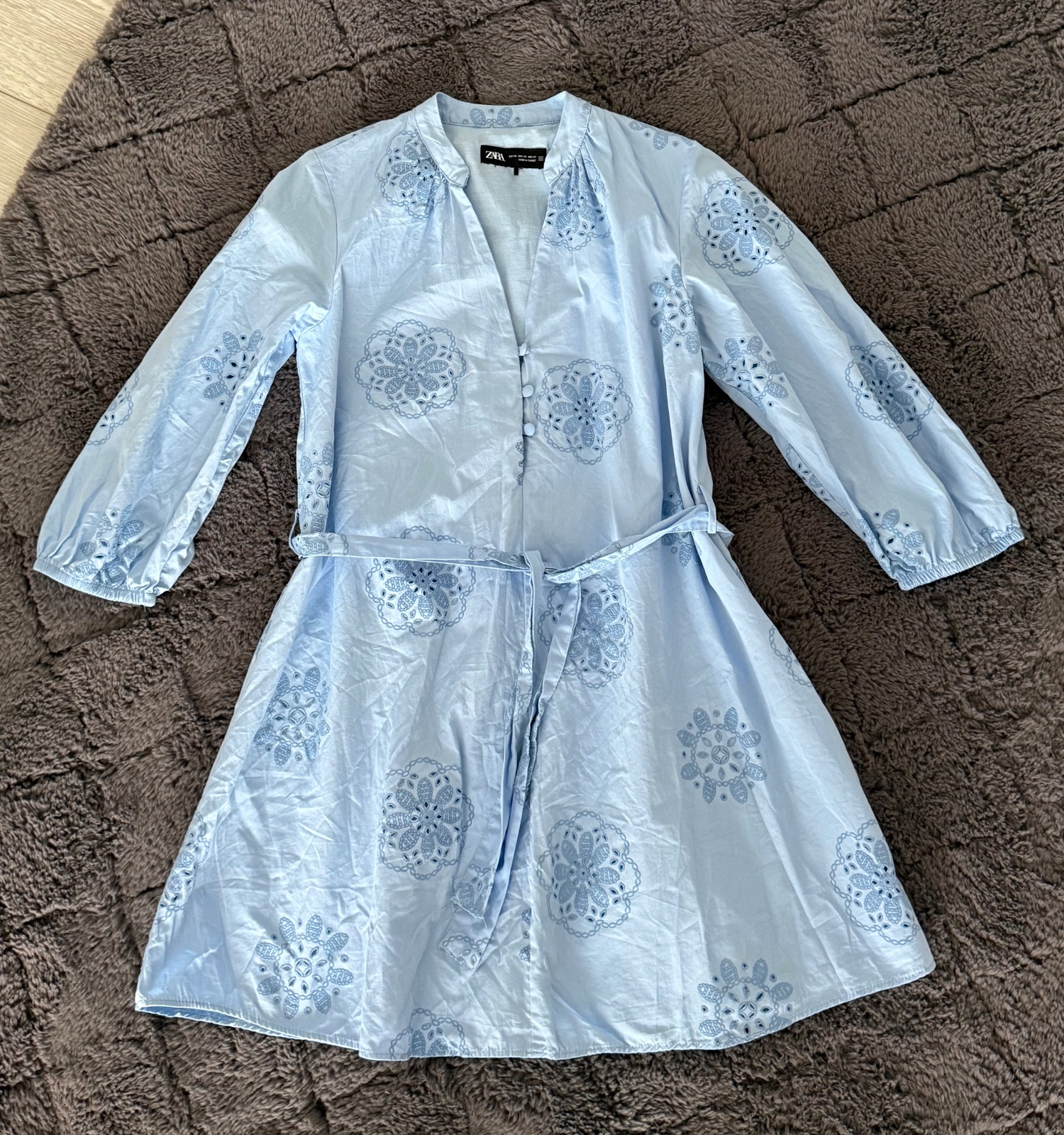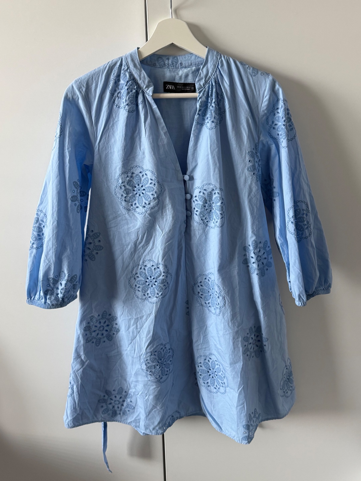 Krásne mini šaty-tunika Zara. Modrá farba (zodpovedá poslednej fotke). 3/4 rukávy, v pase opasok. Oblečené 2-3 krát, super stav. Velkosť XS oblečie aj S. Miery: šírka 47, dĺžka 81 cm. Vnútorný štítok odstrihnutý.