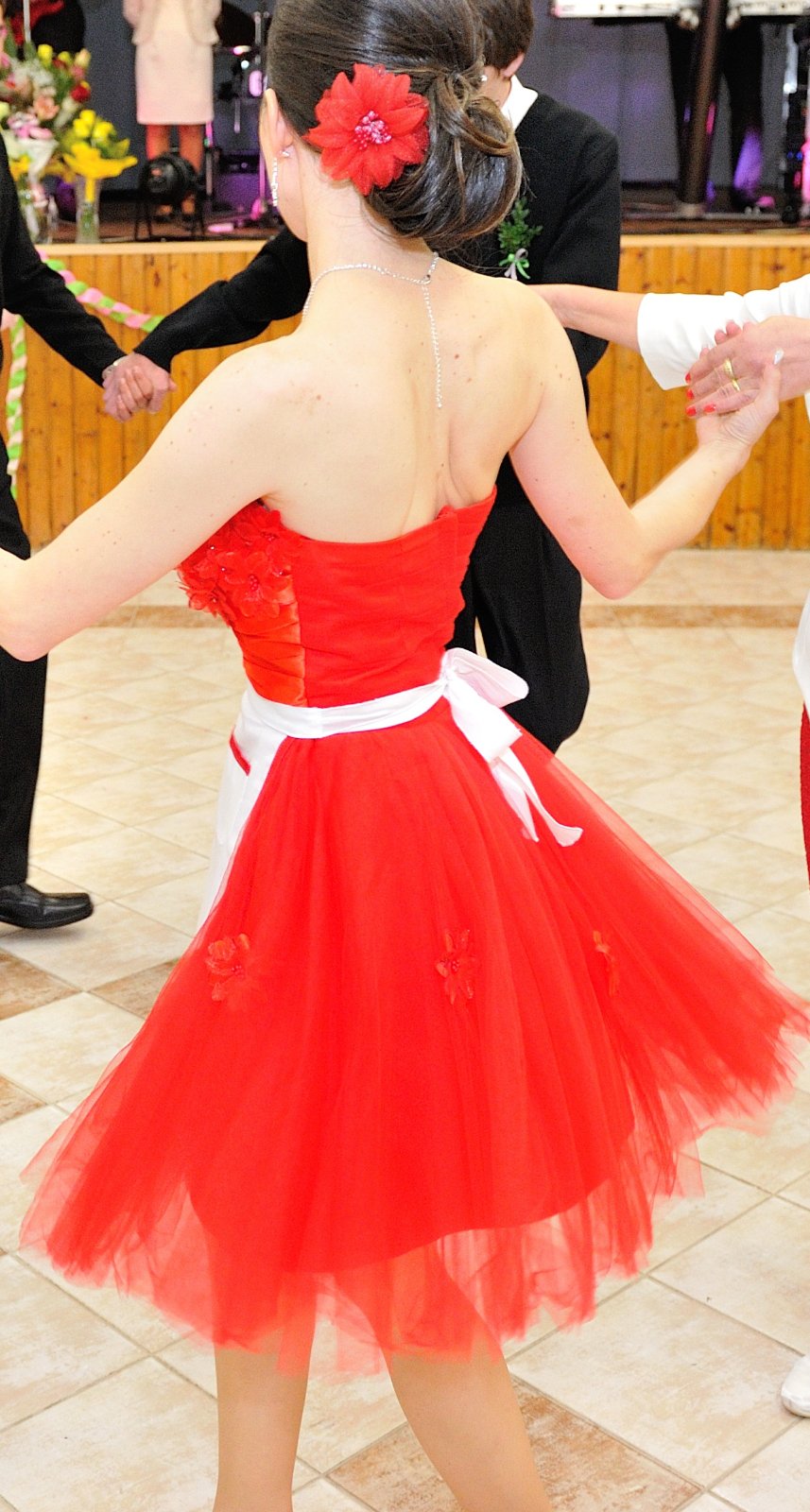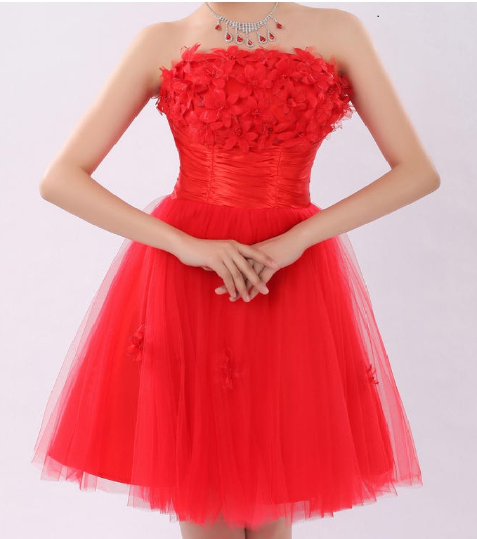 Čevené krátke saténové šaty.