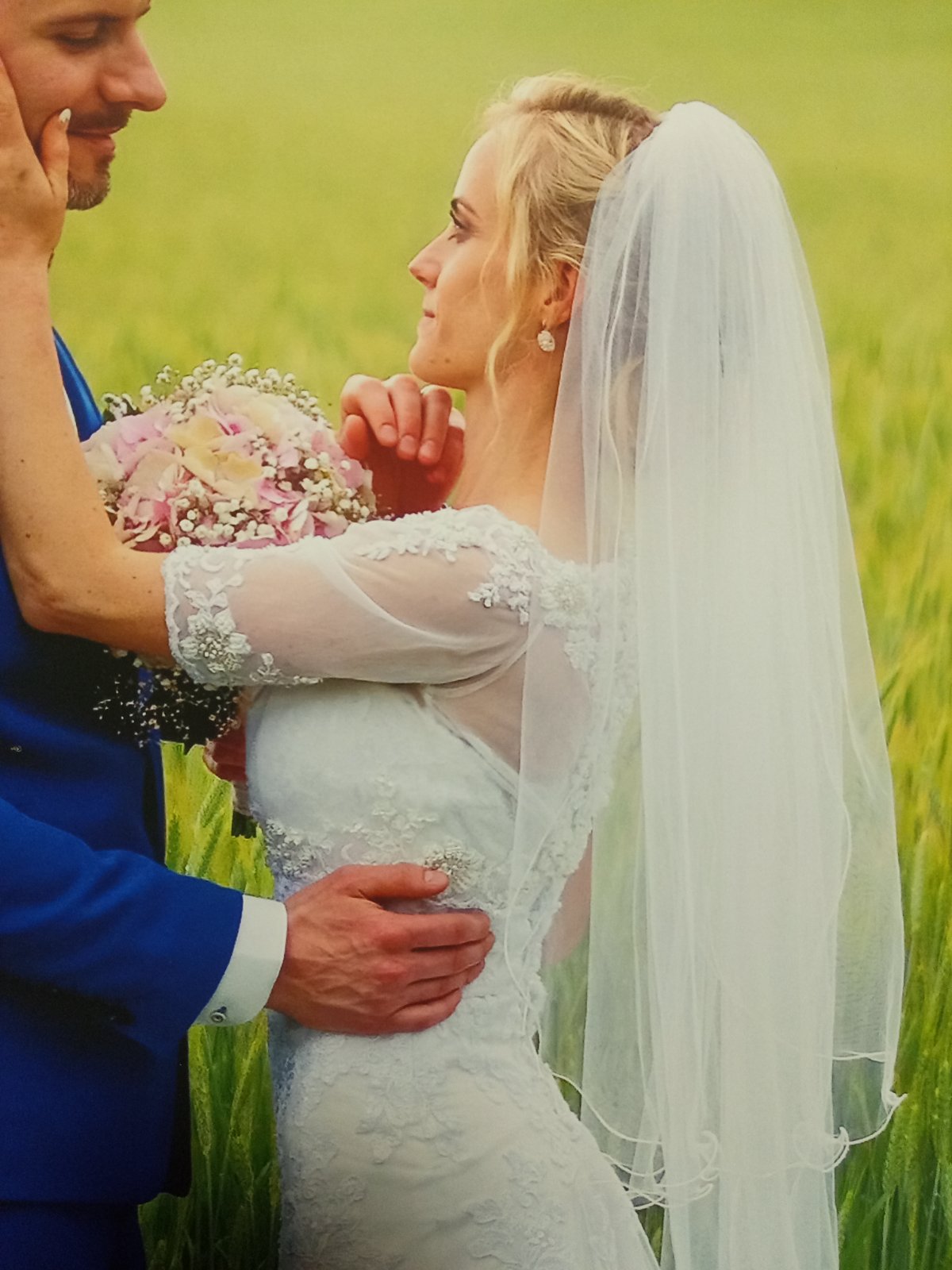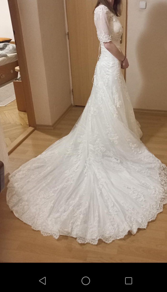 Predám nádherné svadobné šaty s vlečkou vo farbe Ivory ( skôr do krémova, čo je lepšie pre fotenie a tiež vhodná pre každý typ pleti).