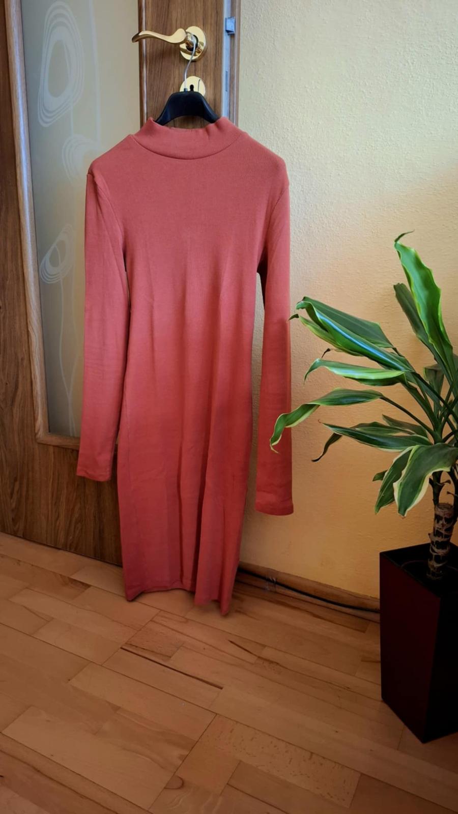 Svetrové šaty v krásnej škoricovej/tehlovej farbe. Na visačke veľkosť 32/34, ale sadnú na veľkosť 36/S. Držte sa rozmerov na foto. Vhodné na prechodné obdobie jeseň/chladnejšiu jar. Šaty neboli nik...