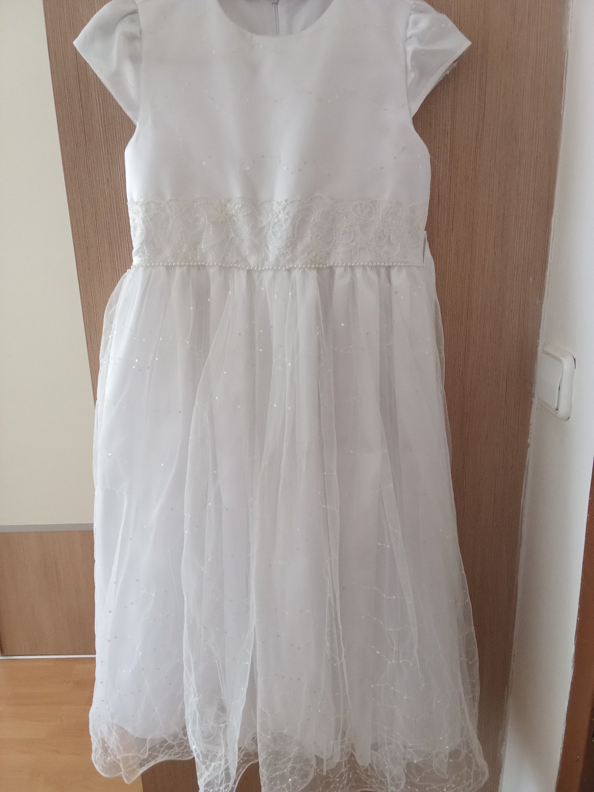 Predám šaty na prvé sväté prijímanie,boli raz oblečené veľkosť tak 134,8 až 9.rokov ale v prípade záujmu ich premeriam,dajú sa zviazať vzadu,