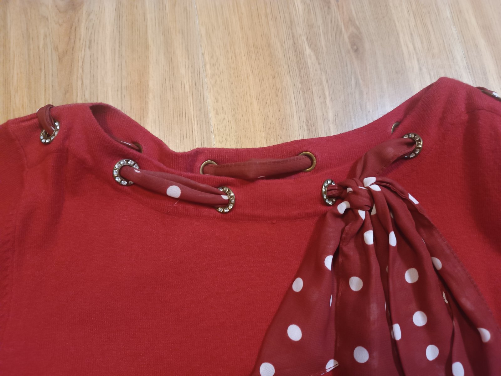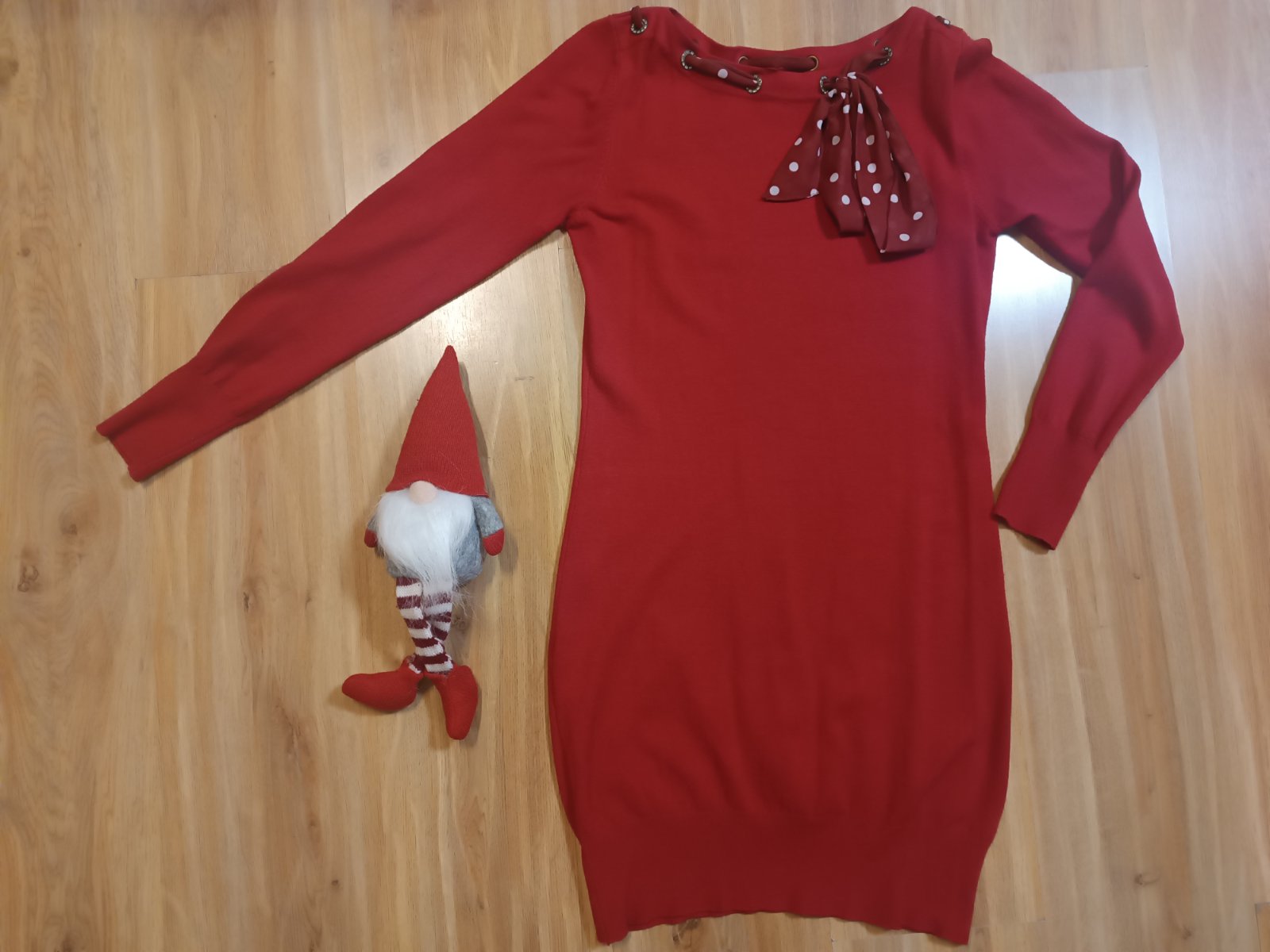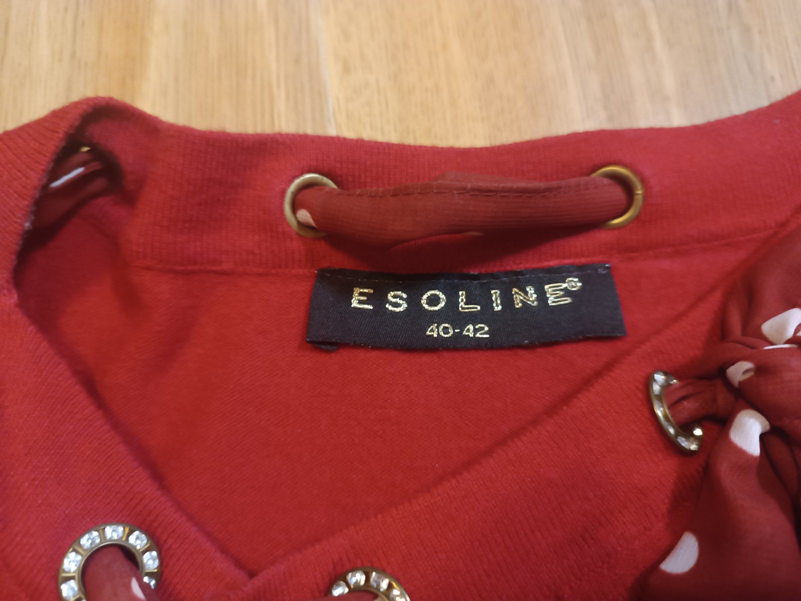 Krásne dámske šaty zn. Esoline, pletenina, veľ.40-42, okolo výstrihu stuha s mašľou. Výborný stav. Celková dĺžka 84cm, šírka pod pazuchami 42cm, rukáv 60.5cm.