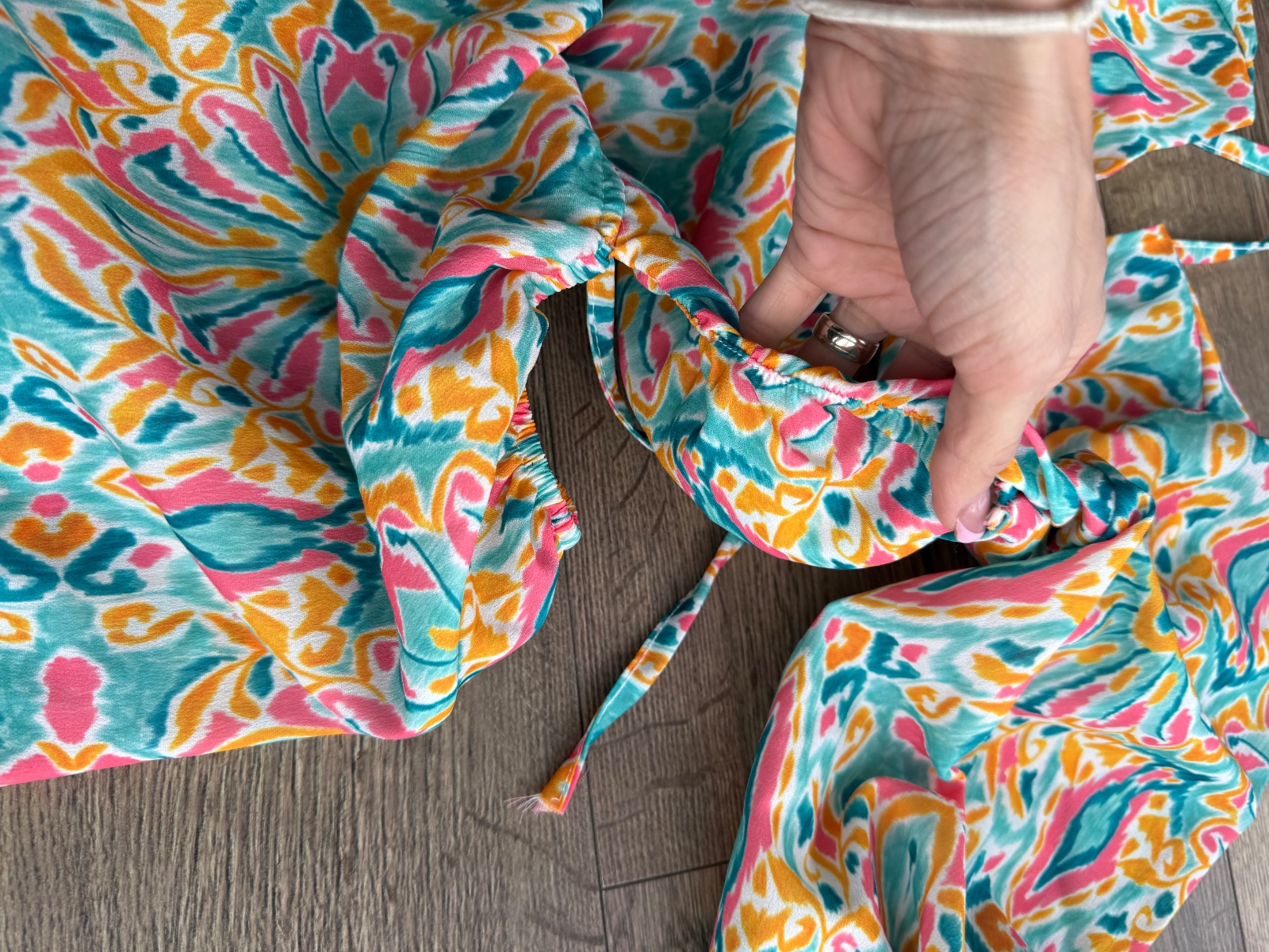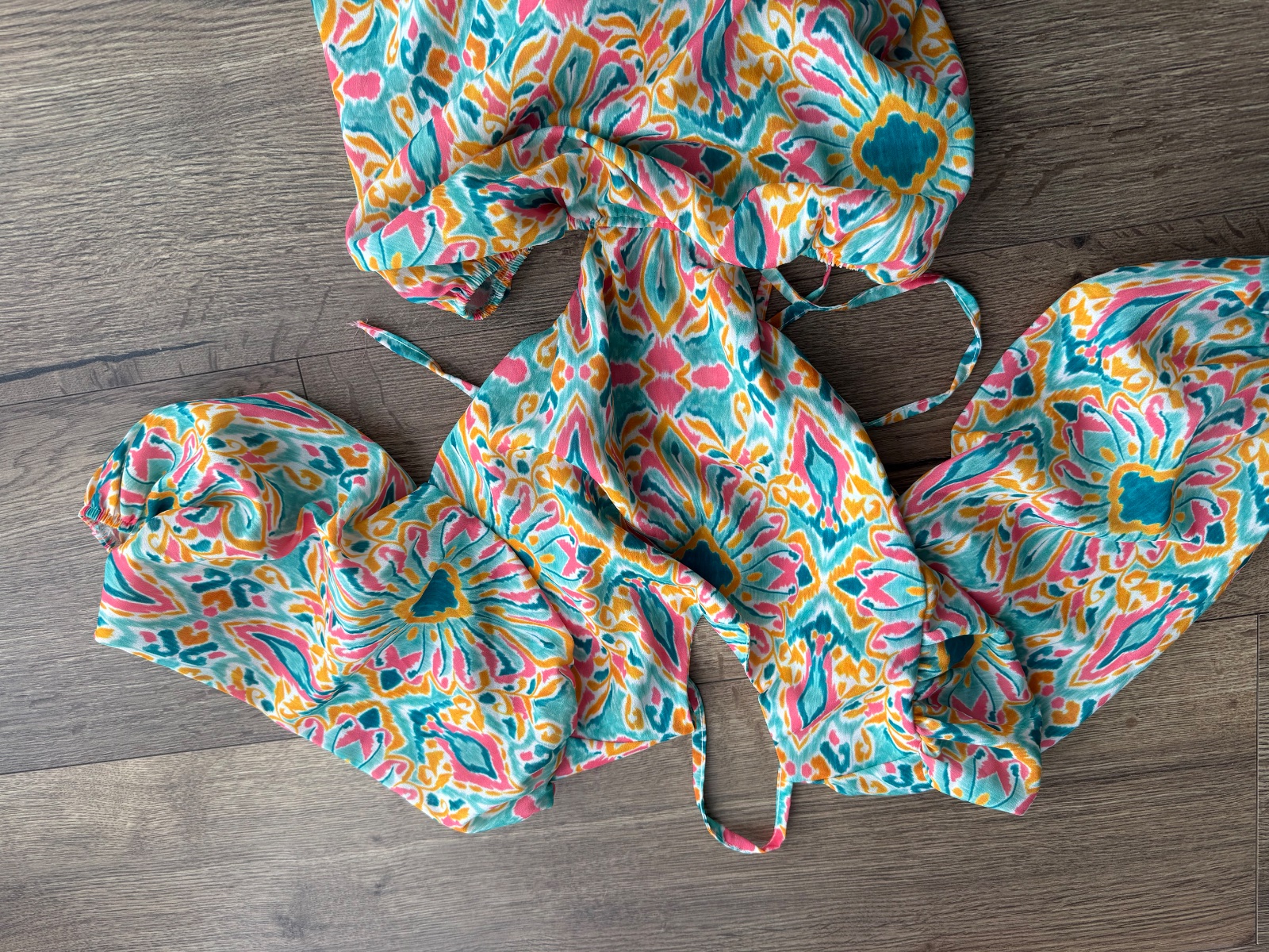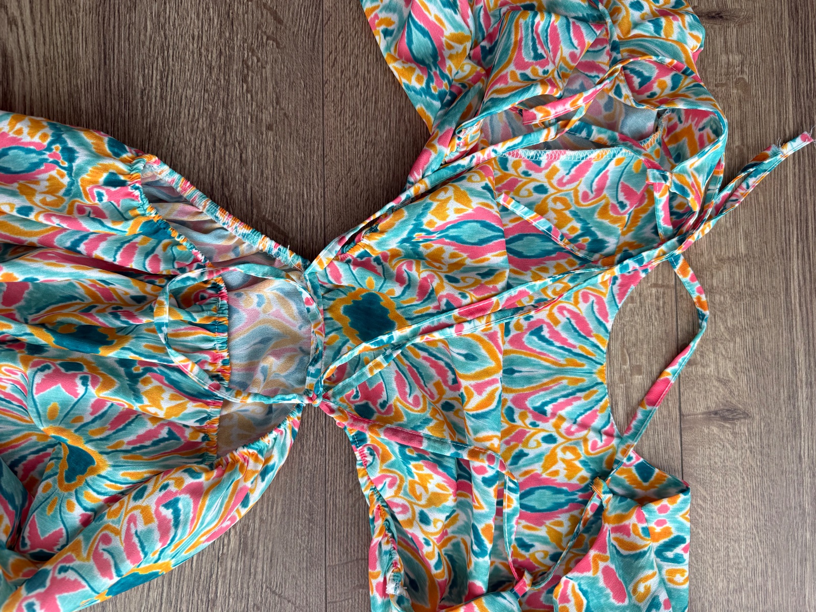 Predám krásne vzorované dlhé šaty. Šaty majú efektný holý chrbát so šnurovaním pomocou stužky, ktoré sa dá prispôsobiť postave. Po bokoch sú jemné vykrojenia, ktoré dodávajú šatám moderný a ženský vzhľad.