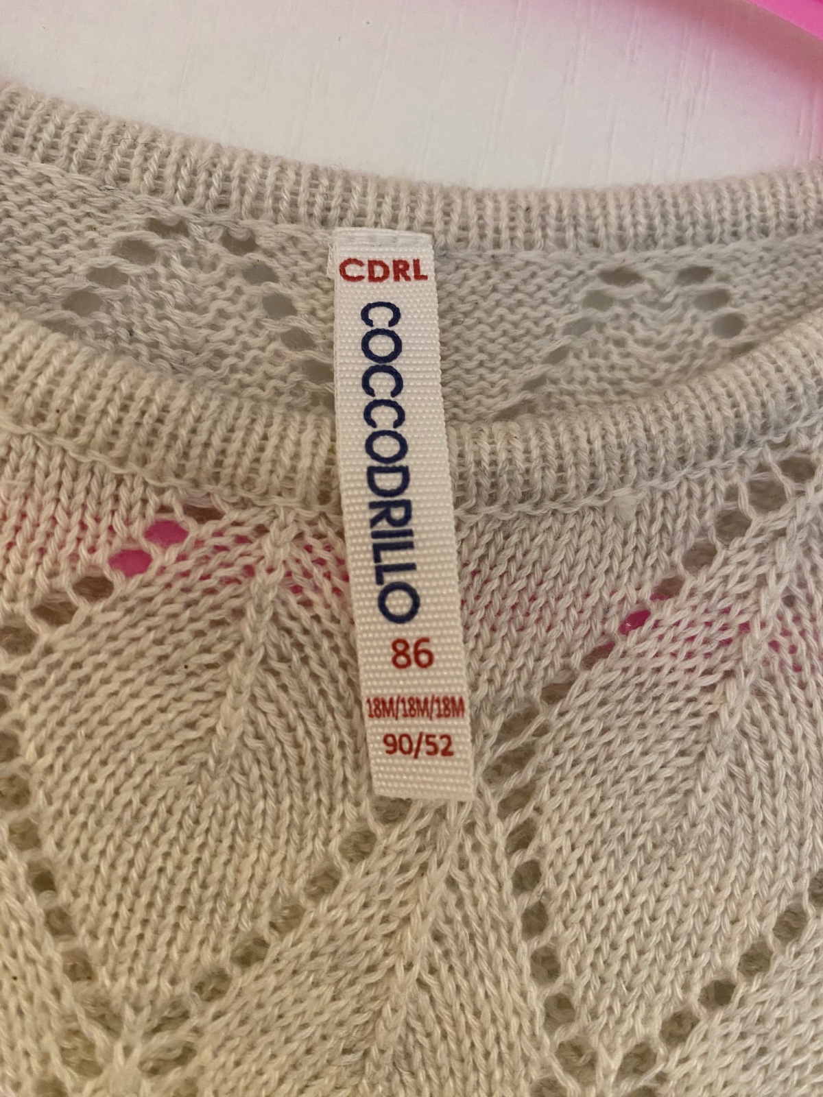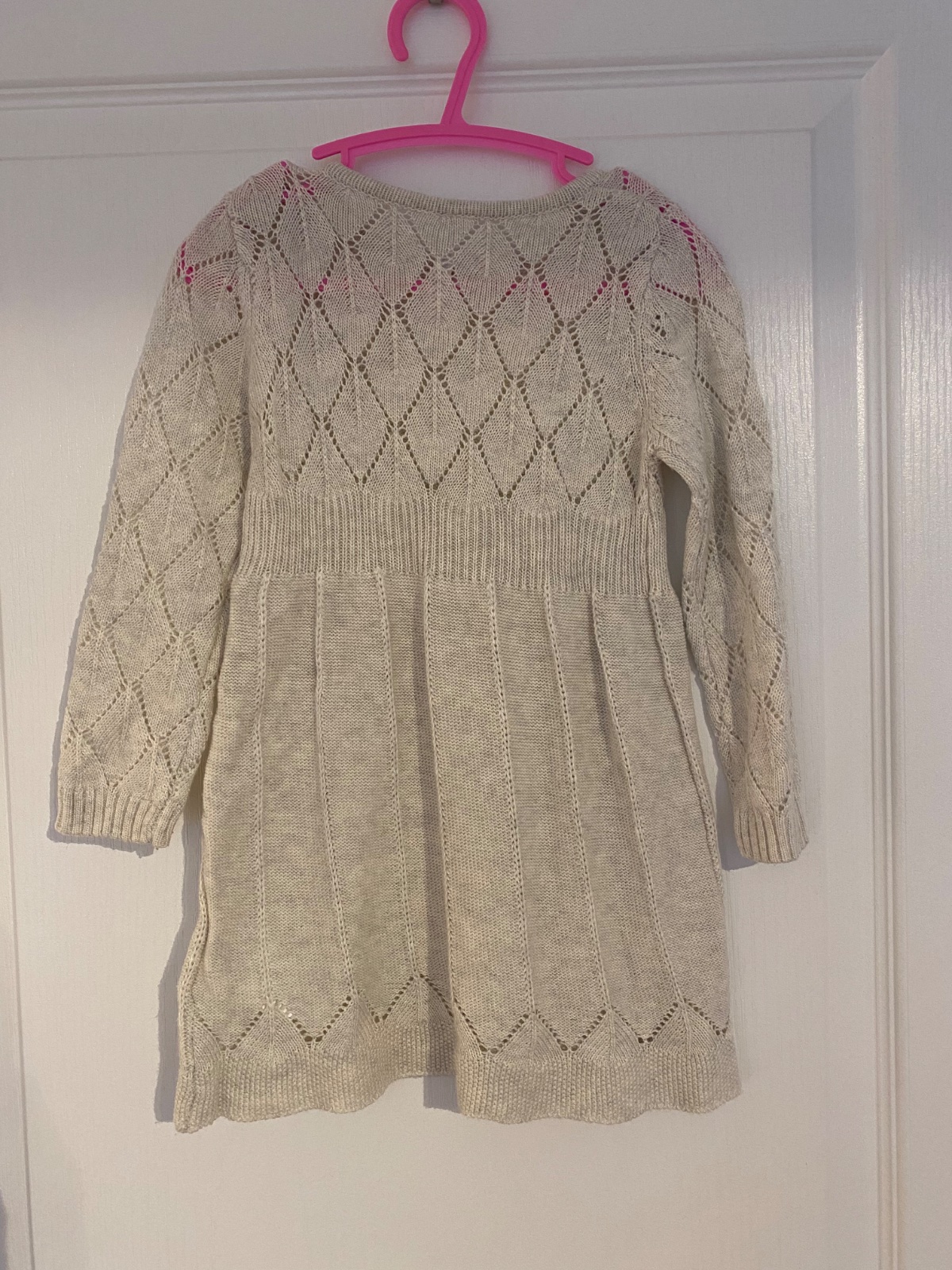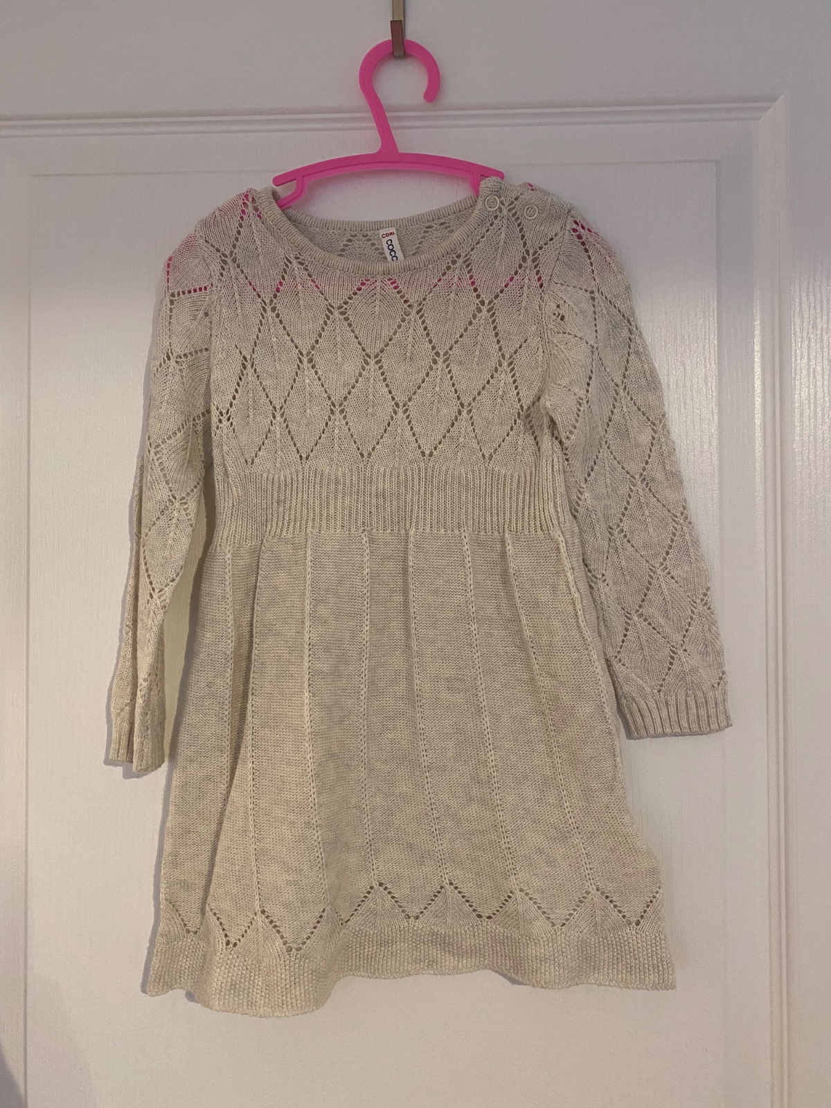 Krásne hačkované šaty na jesenné obdobie. Pri krku maju cvočky pre lepšie obliekanie. Veľkosť 86 cena 5€ plus poštovné.