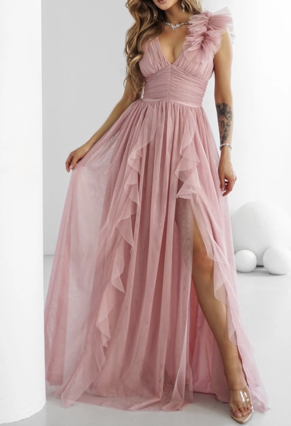 V týchto šatách zaiste učarujete každému pohľadu. Výrazný tyl na ramene a rozparok, ktorý odhalí krok spoza nadýchaného tylu sa postarajú o elegantný, noblesný a zmyselný vzhľad. Šaty sú na prsiach vystužené a vzadu sa zapínajú zipsom. Raz oblečené, vyčistené bez známok používania.