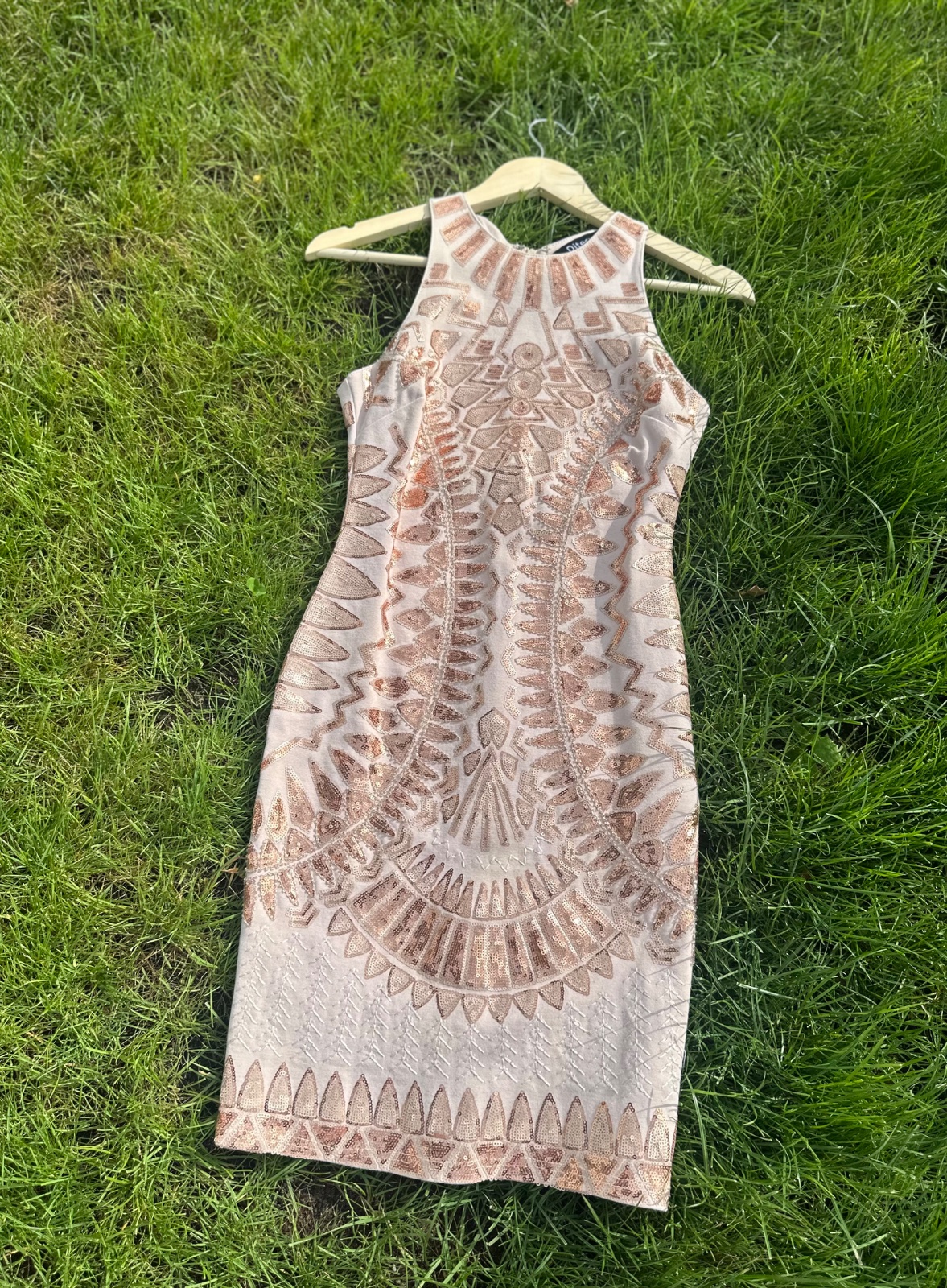 Predám krátke spoločenské šaty so zlatými kamienkami v béžovej farbe, z kvalitného saténového materiálu, 1x oblečené, veľ. 34/XS, (kupované v Anna garden Nr) nc 100€
