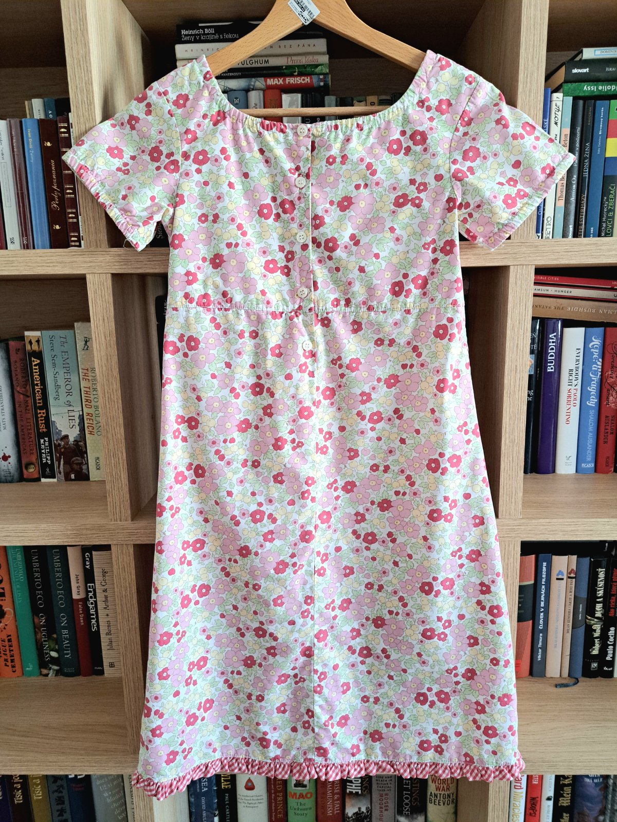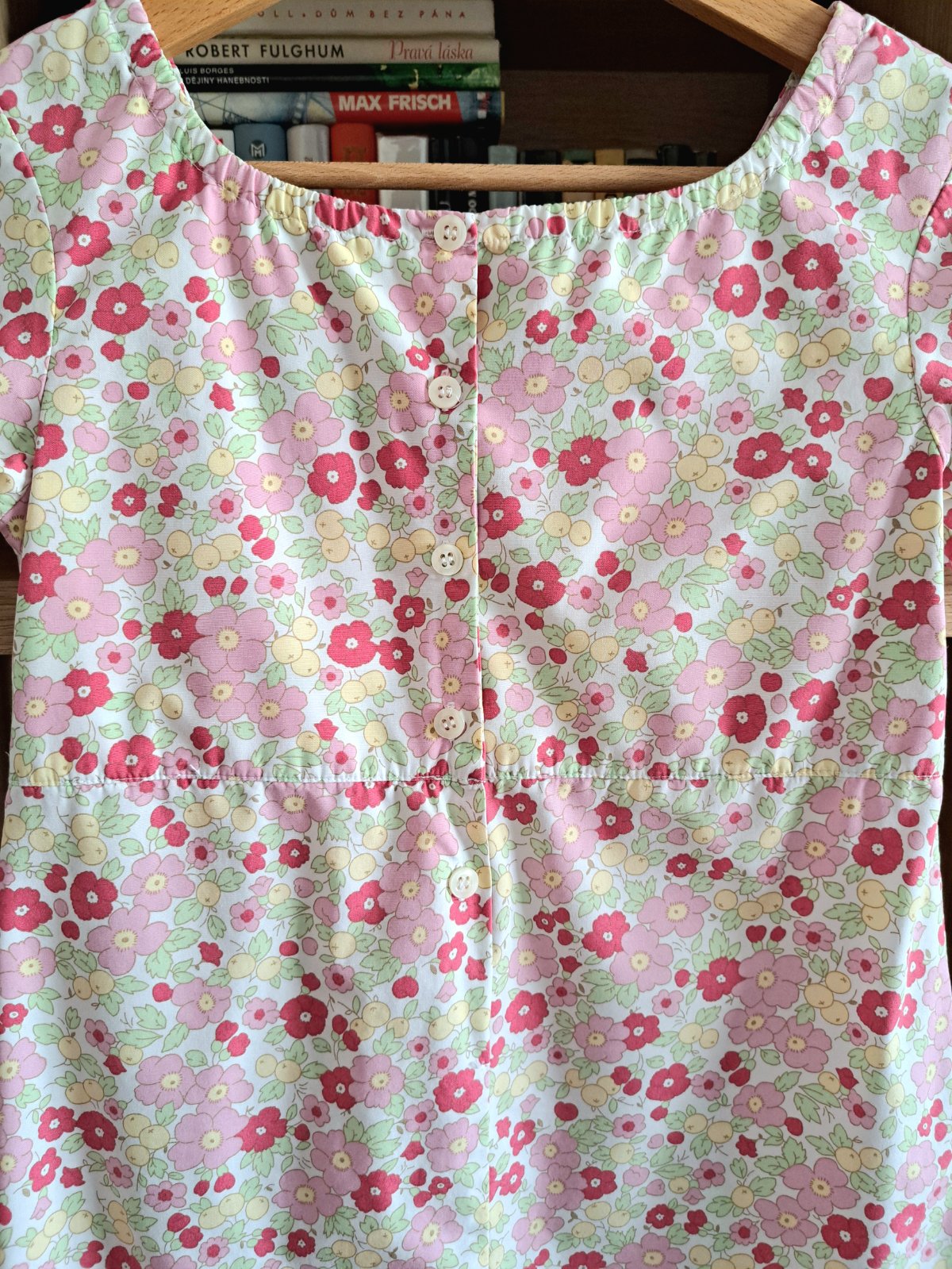 Jednoduché milé šiatky s kvietkami ušité z kvalitnej pevnej bavlny. V leme okolo krku ozdobná šnúrka, ktorá sa dá nosiť rozviazaná aj zviazaná na mašličku. Spodný lem šiat ozdobený krátkym volánikom s motívom zhodným z ozdobnou šnúrkou na hornom leme. Skôr pre štíhle dievčatá, vhodné na bežné aj príležitostné nosenie. Udávaná veľkosť 9-10 rokov.