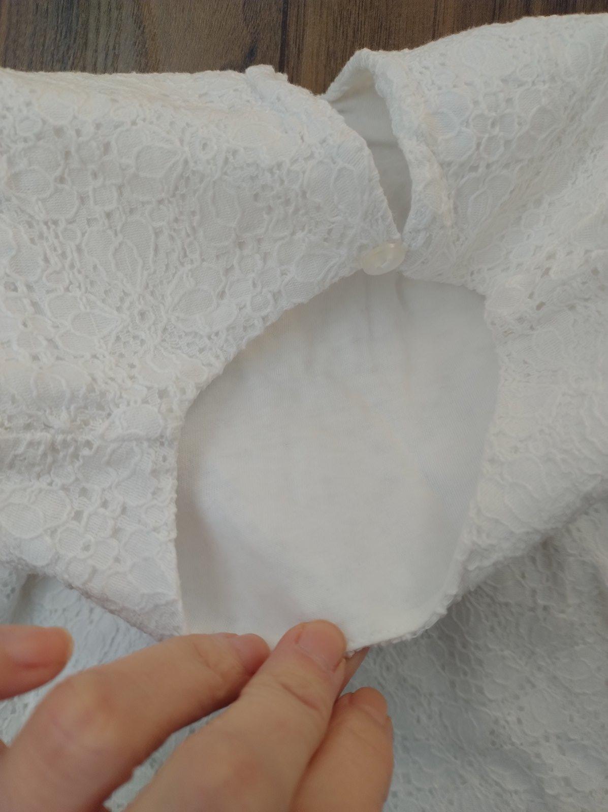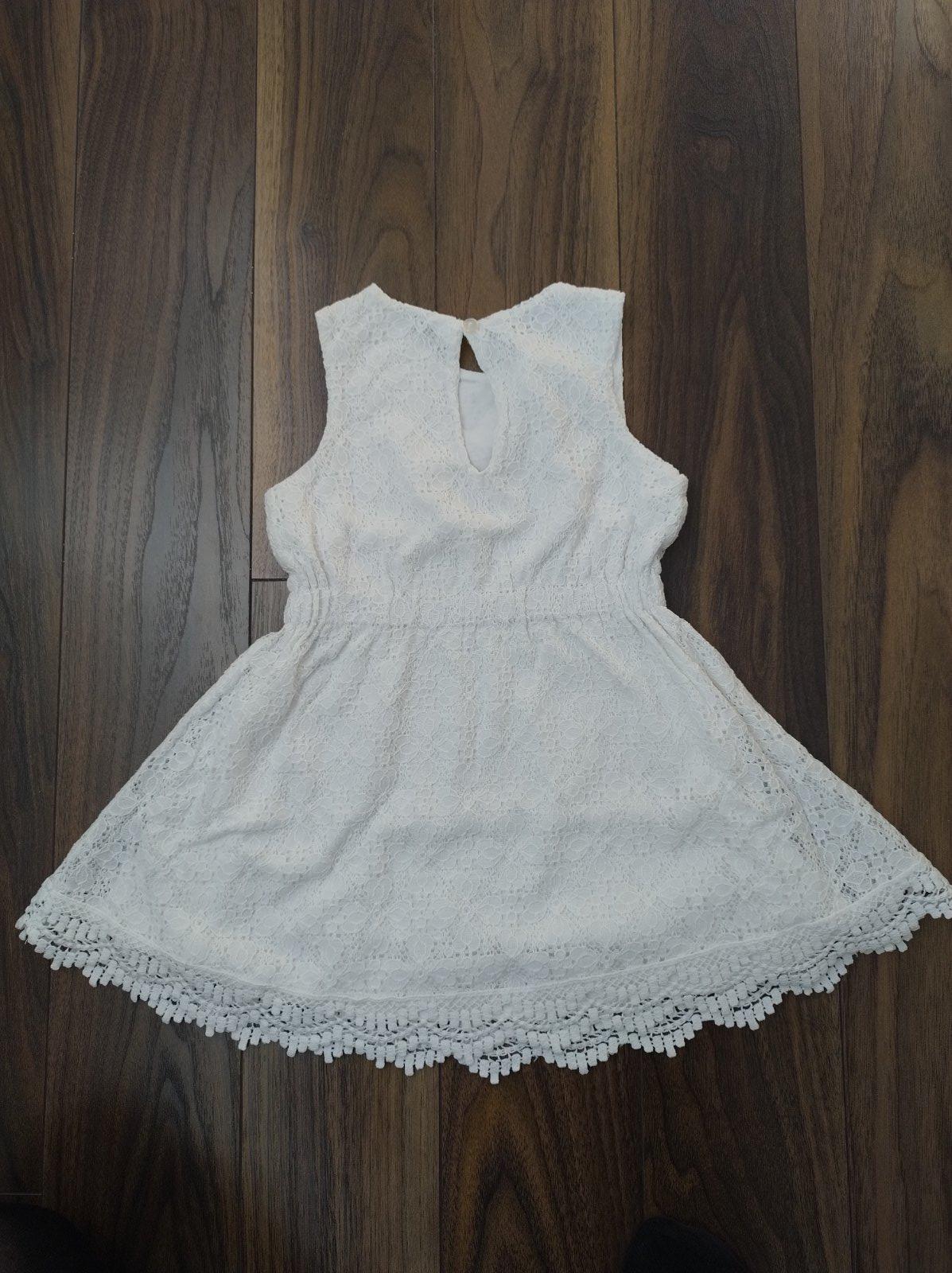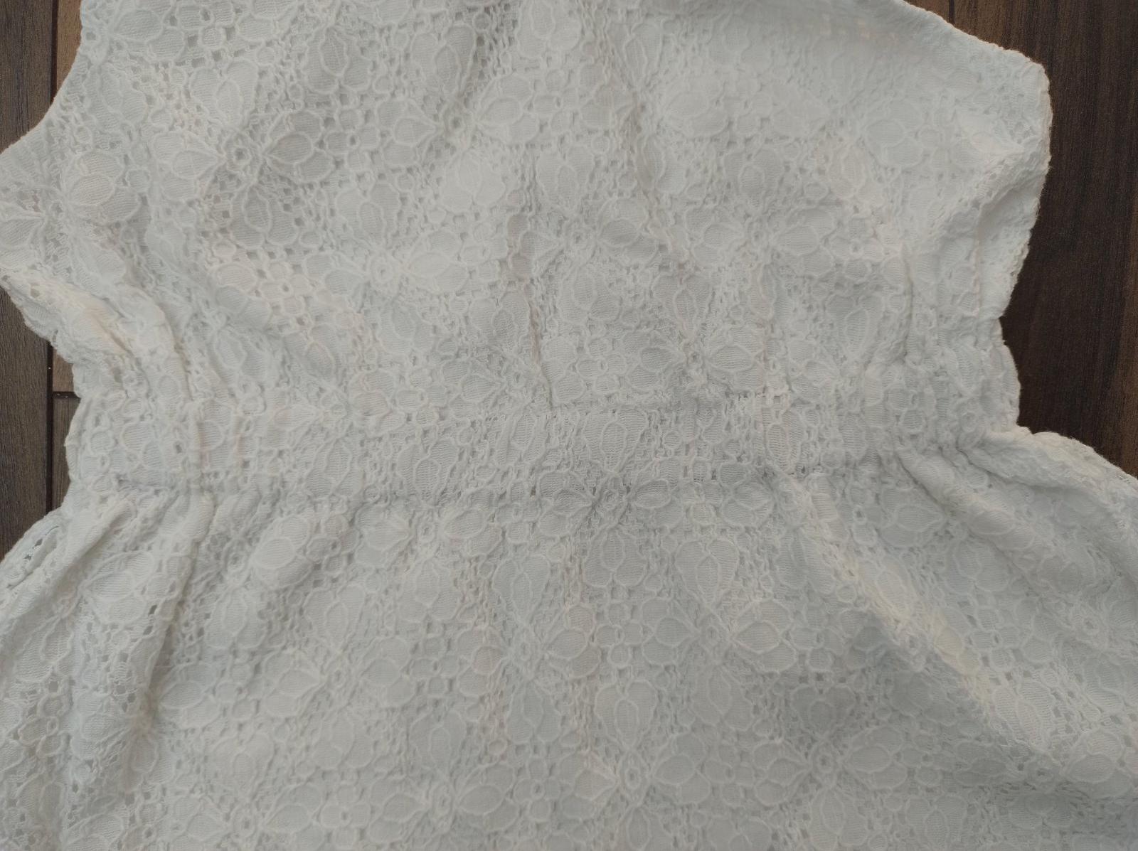 Biele "polospoločenské" šaty. Veľkostne sedia na 92. Veľmi pekné. Celé podšité bavlnou. Vrchná vrstva okrasná. Vzadu slzička, zapínanie na gombík a gumičku. Gumku majú aj v páse. Kúpené v bazári, na predku už mali fliačik od fixky, ktorý sa mi nepodarilo dať dole, ale je to minimálne viditeľné pri nosení. Iné poškodenia nemajú. 2,50 €