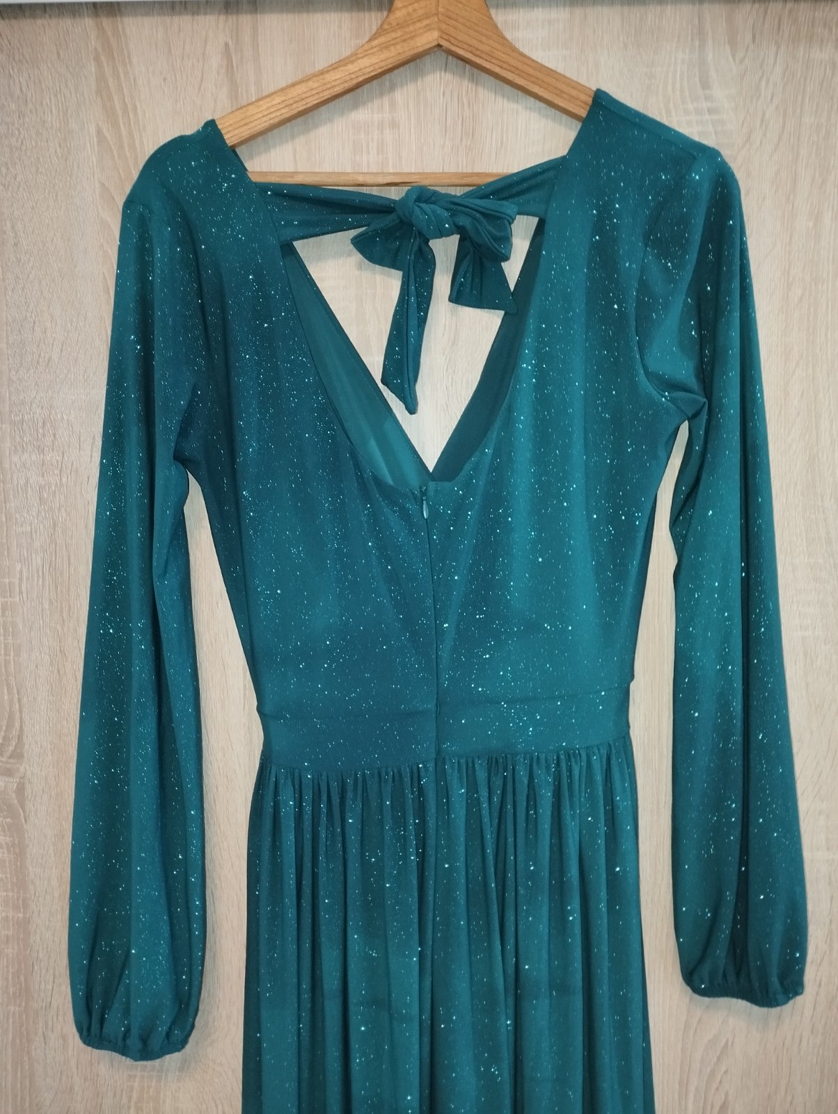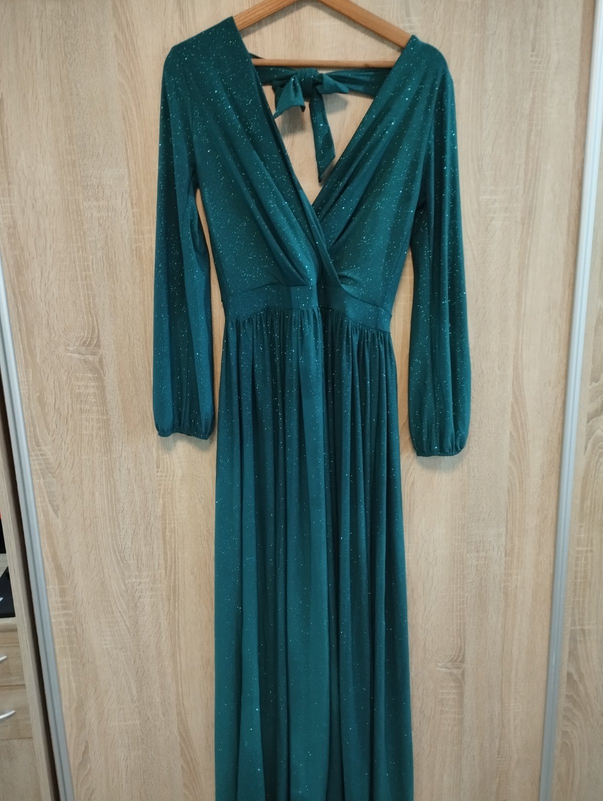 Predám pekné spoločenské tmavozelené šaty s 3/4rukávom a holým chrbtom.Dĺž: 150cm