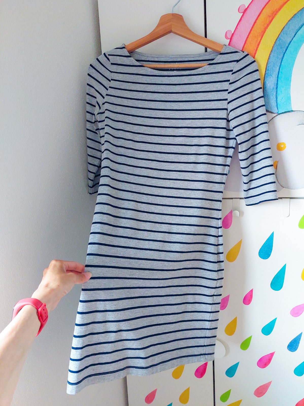 Šaty malo nosené, elastické, materiál tenký svetrík Šírka cez prsia 33cm Dĺžka šiat 80 cm Dĺžka rukávu 42 cm Cena 6.50€+poštovné