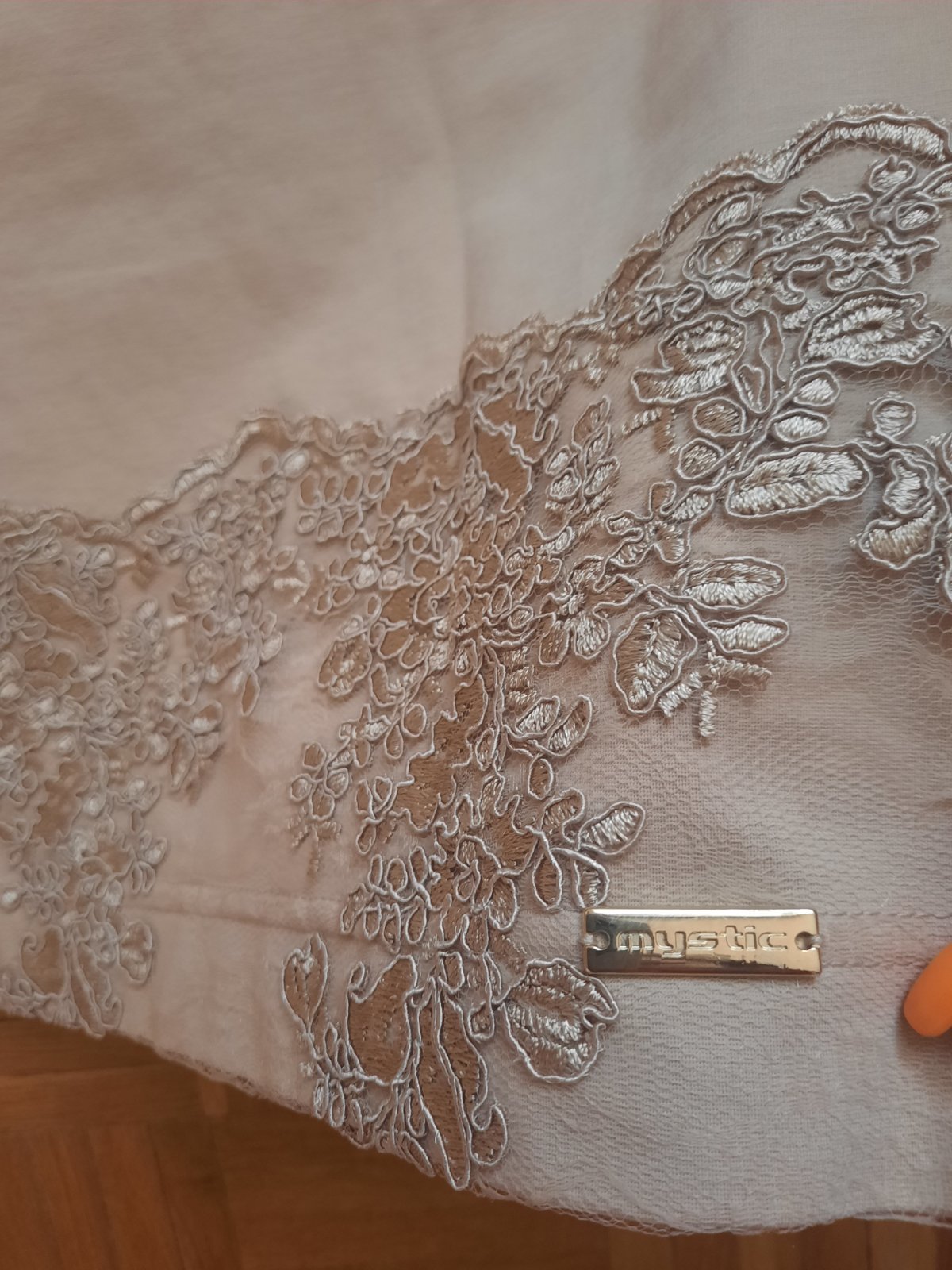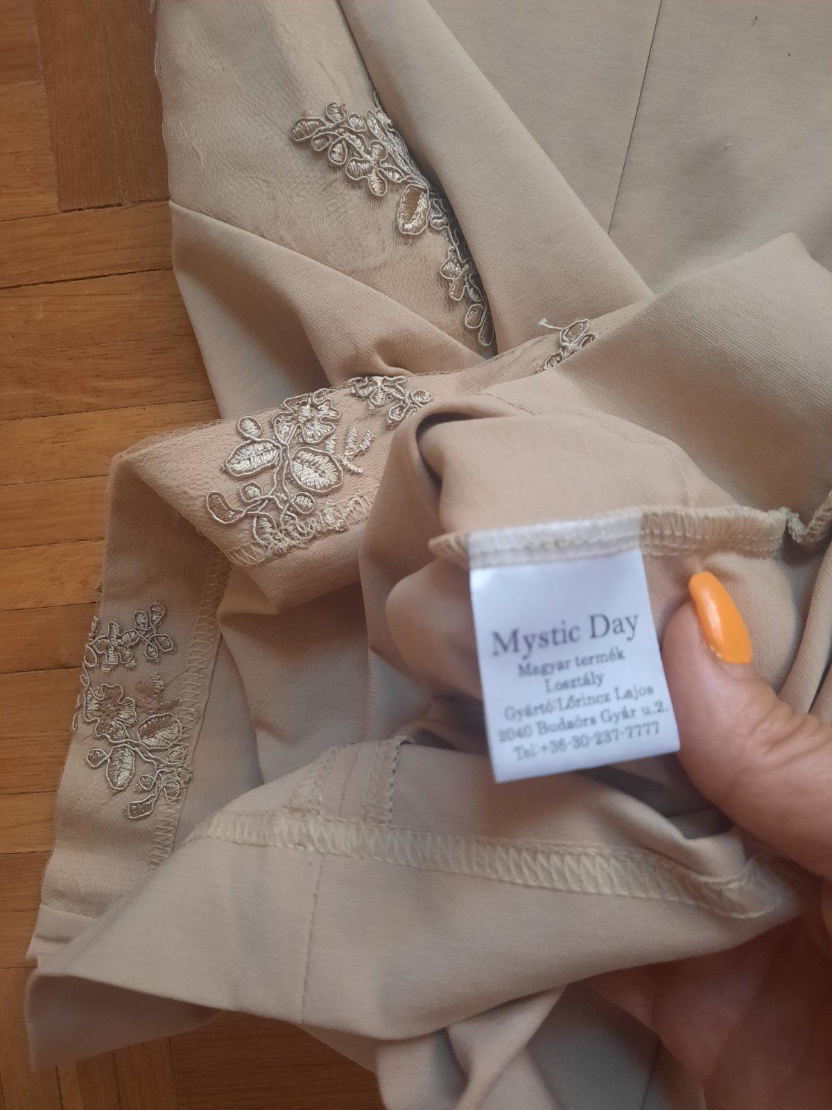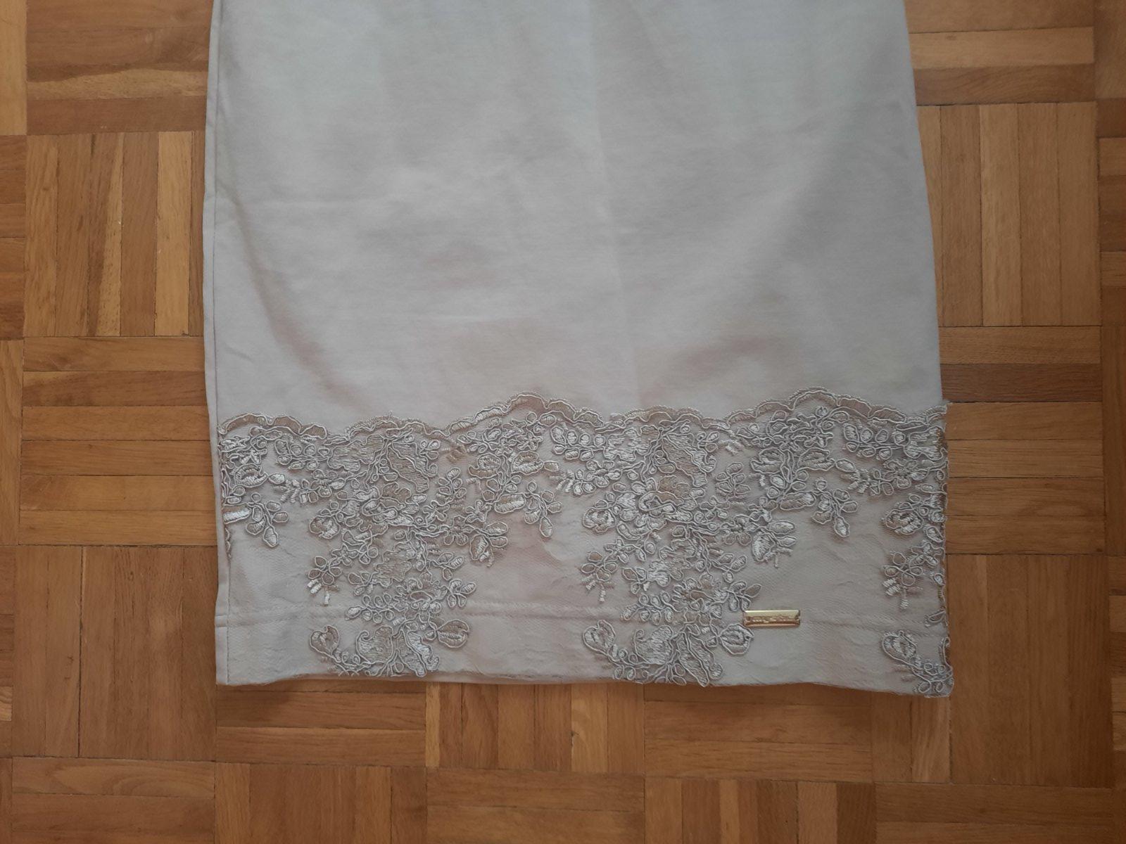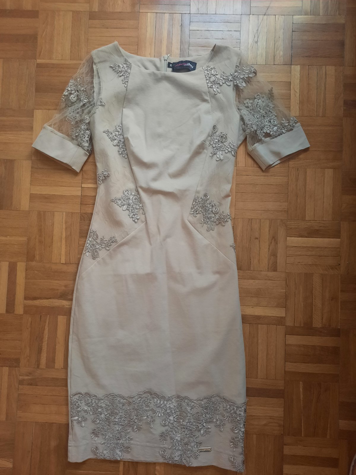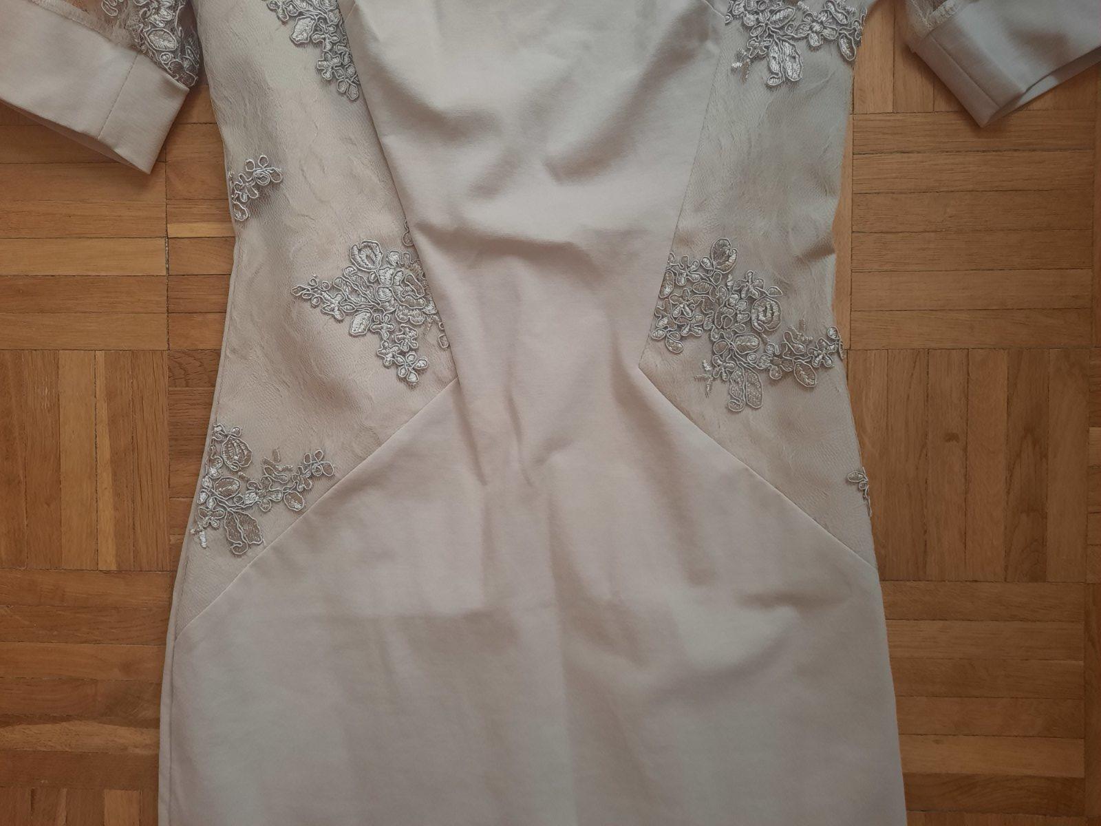 Krásne elegantné elastické šaty, vzadu sa zapínajú na zips. Rukávy sú priesvitné (tylové)+ zdobenie. Takisto na bokoch šiat je rovnaké zdobenie s tylom. Sú vhodné na hociakú slávnostnú udalosť- určite neobanujete.