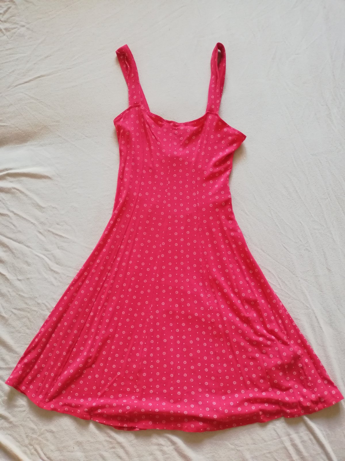 Kvalitné letné šaty sýtoružovej farby, výstrih prekladaný, lemovaný volánikom, na boku zips, podšité, vzadu na chrbáte šnurovačka, super stav. šírka v podpazuší 44x2 cm, pás 32x2 cm, boky 46x2 c...