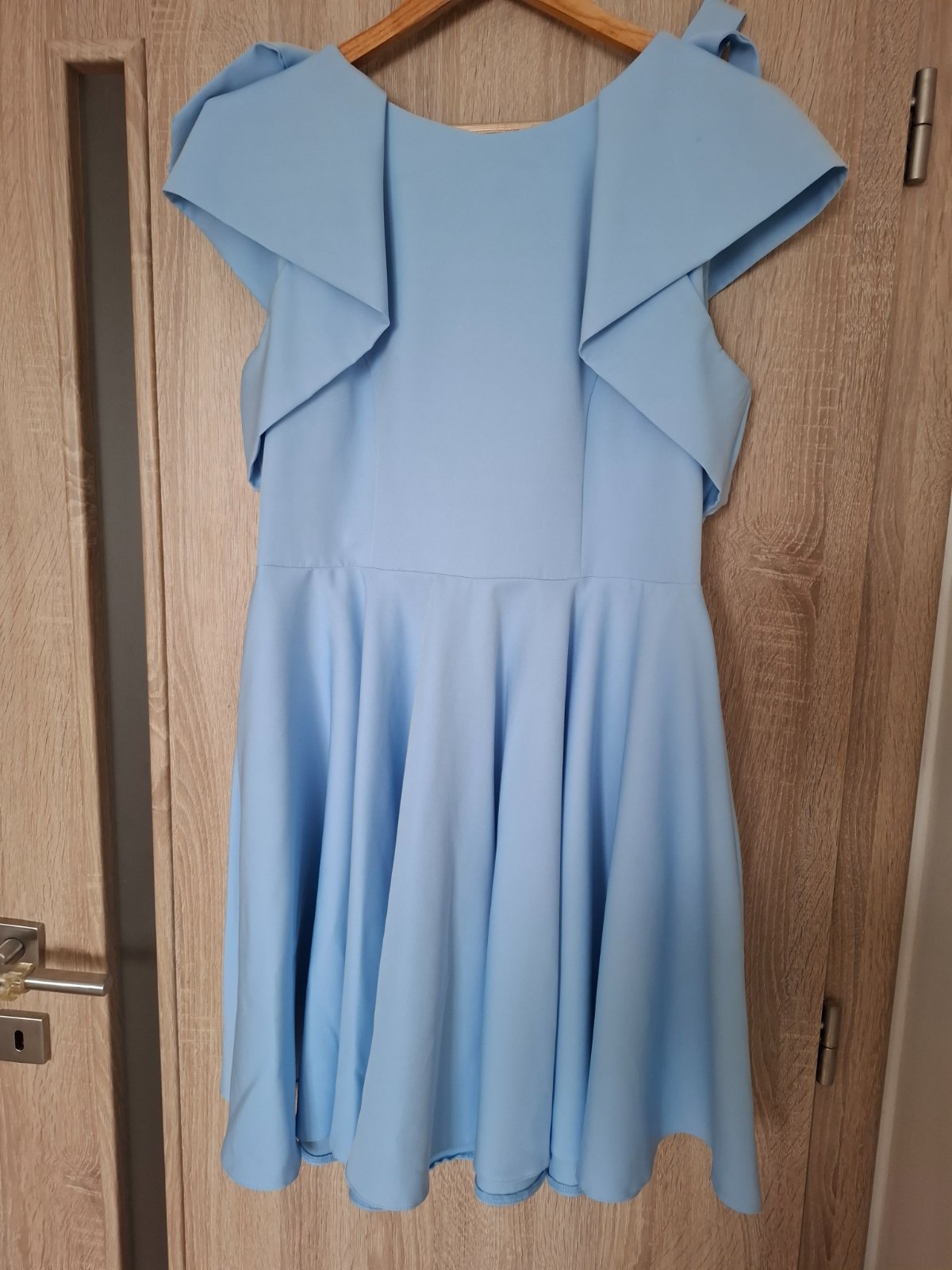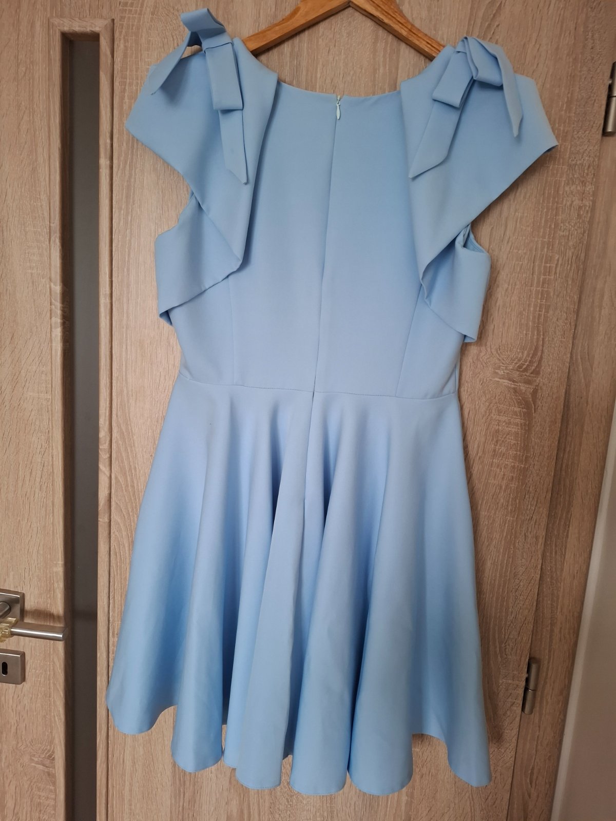 Svetlomodré spoločenské šaty, vzadu zapínanie na zips. Oblečené 1x, bez poškodenia, ako nové. Veľkosť L- dĺžka 88 cm, hrudník 88-94 cm, pás 78 cm. Pôvodná cena 79€, objednané z Mia dresses
