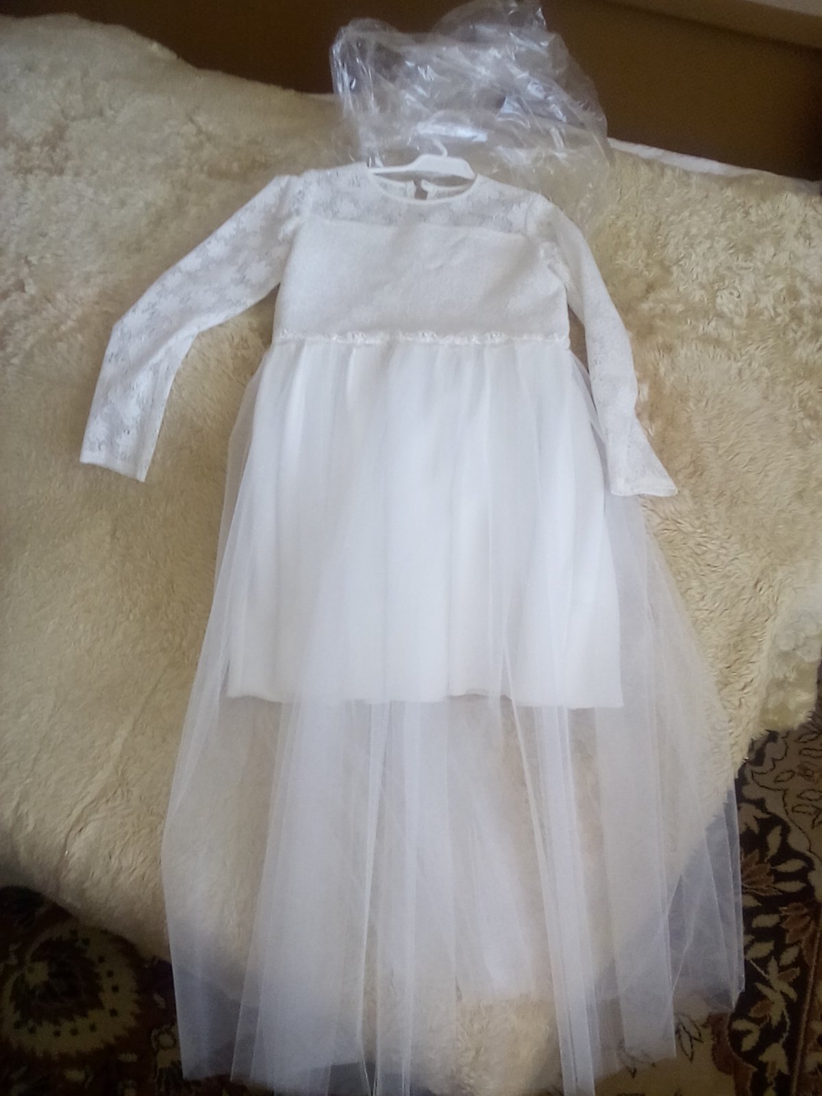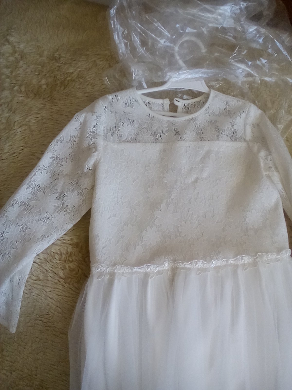 Ľahké, padave šaty na prijimanie s dlhým čipkovaným rukavom Veľkosť 12-13y dĺžka 120 cm pas 37 cm pod pazuskami 40 cm rukáv od krku ma 59 cm Veľkosť 8-9y Nové Možnosť dokúpiť spodnicku, kruh 15€ ...